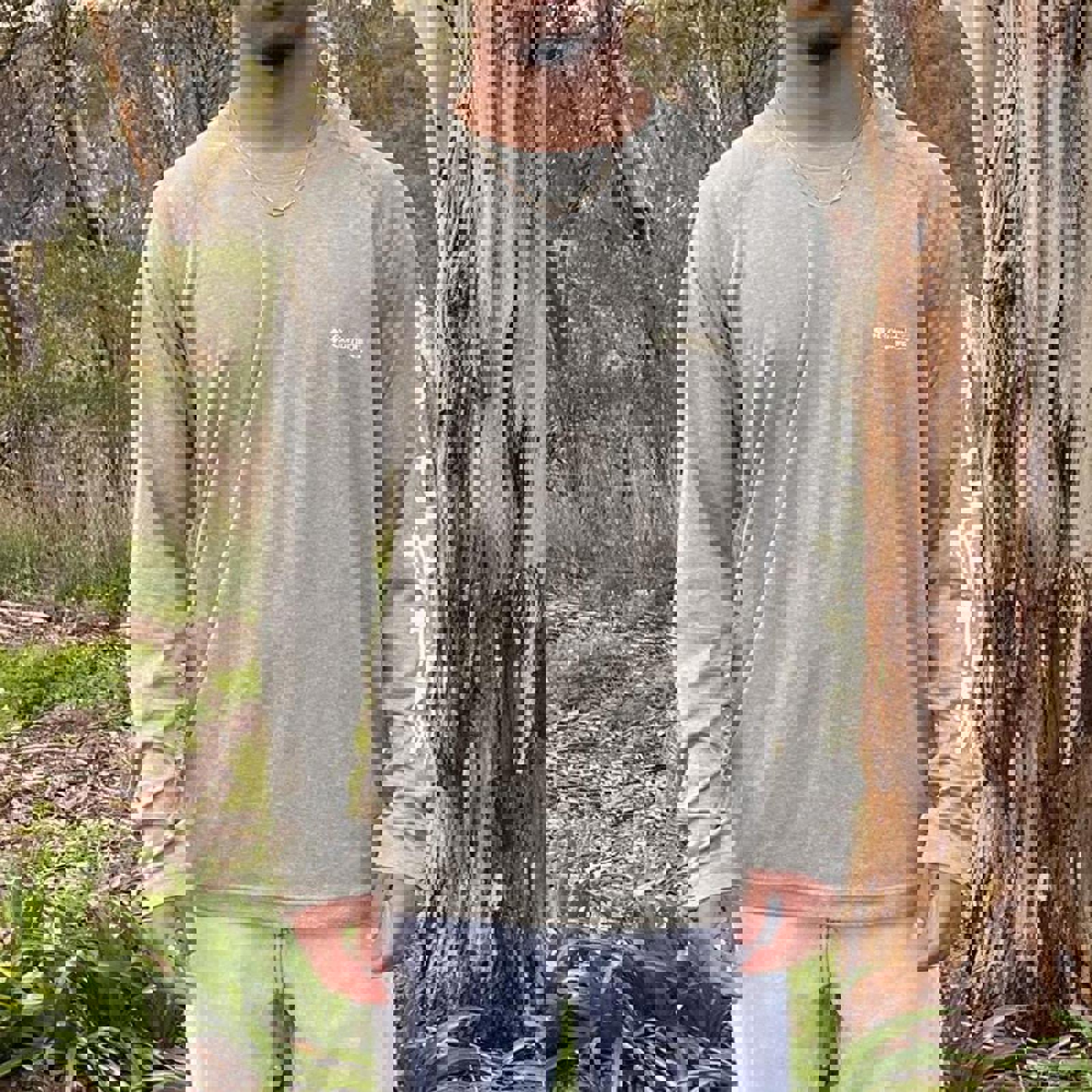Green Columbia pfg long sleeve tshirt with cream spell outs on the chest and sleeve