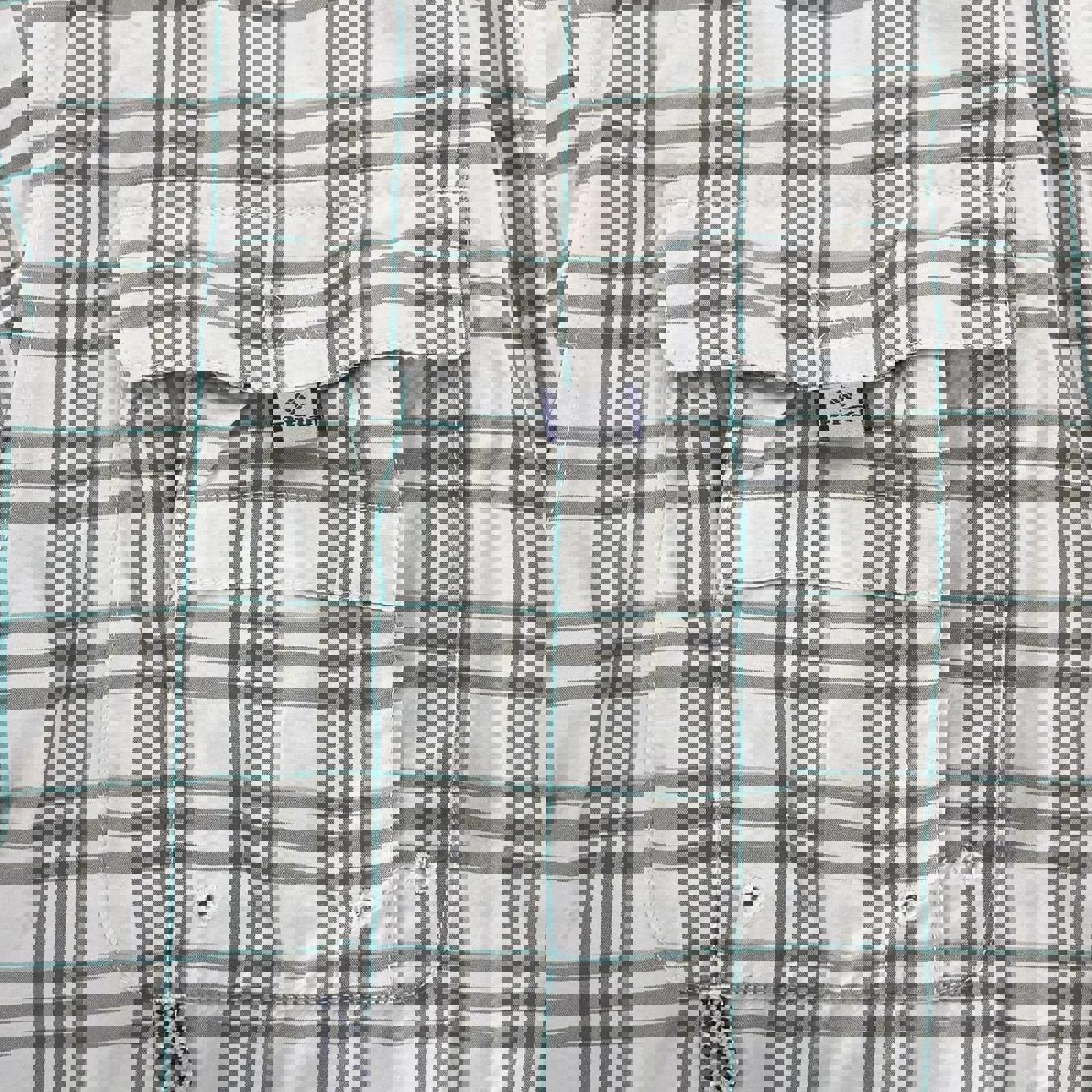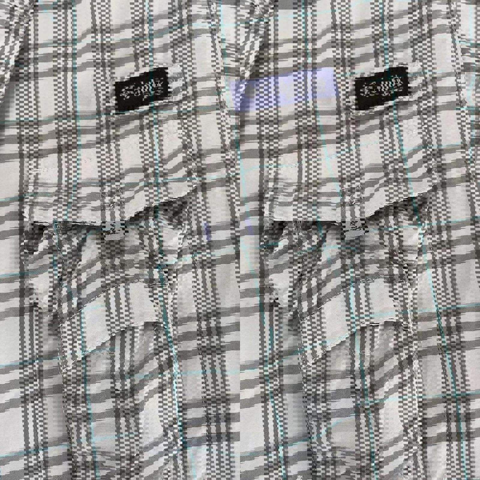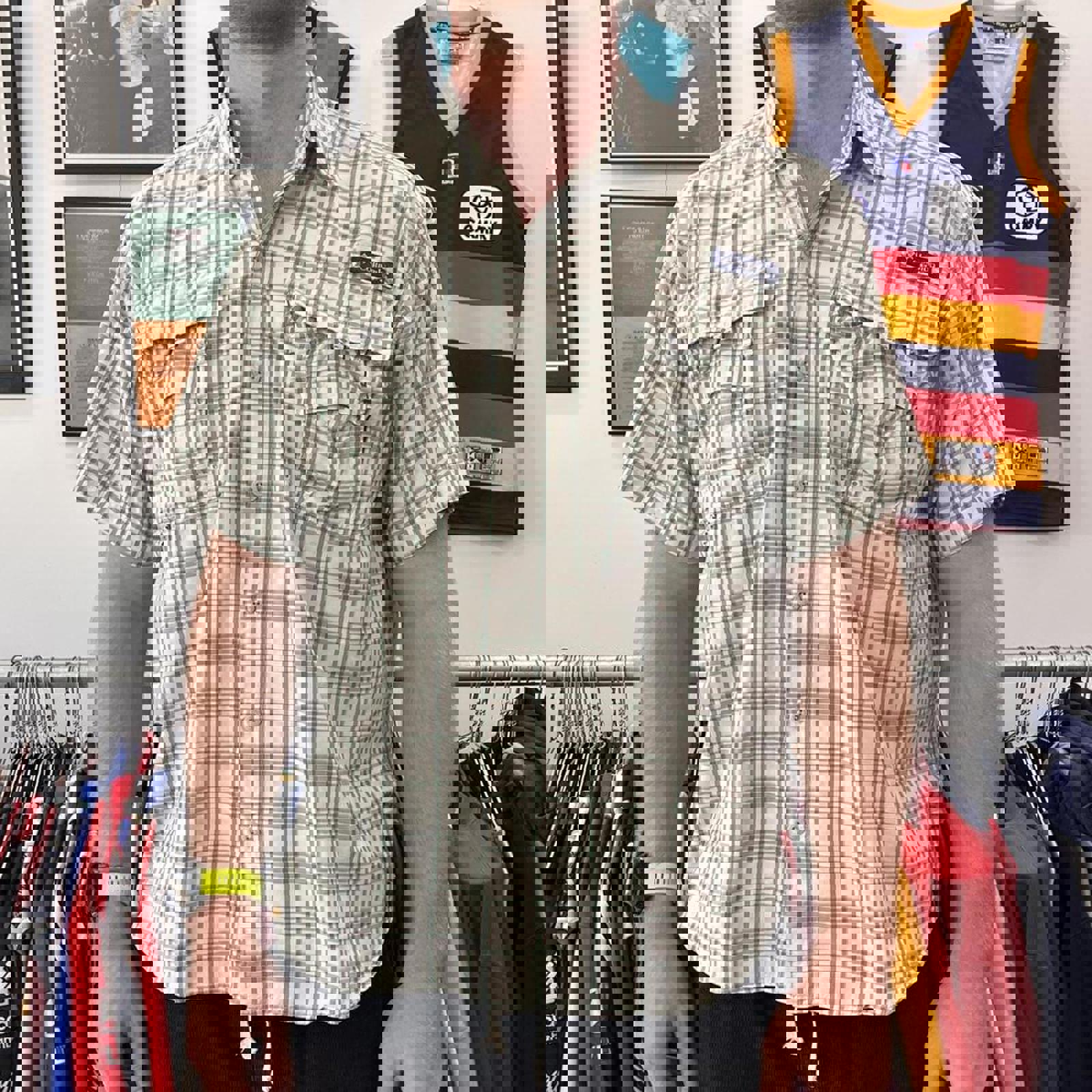 white, grey and turquoise columbia short sleeved button up shirt with patch above the chest pocket