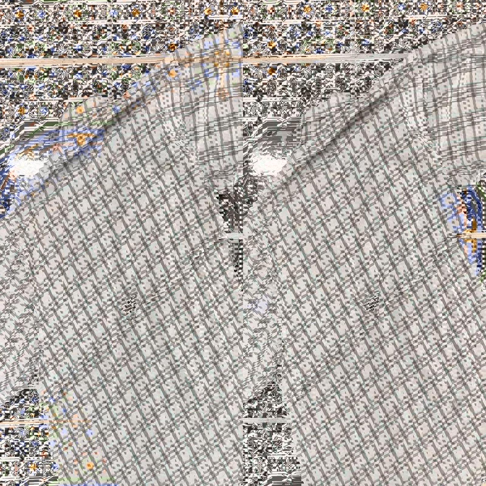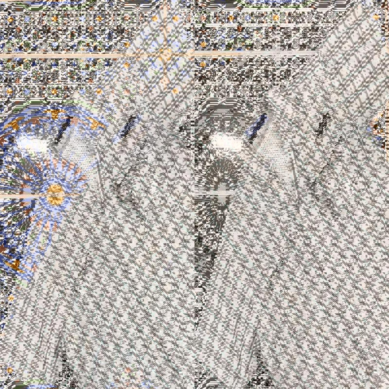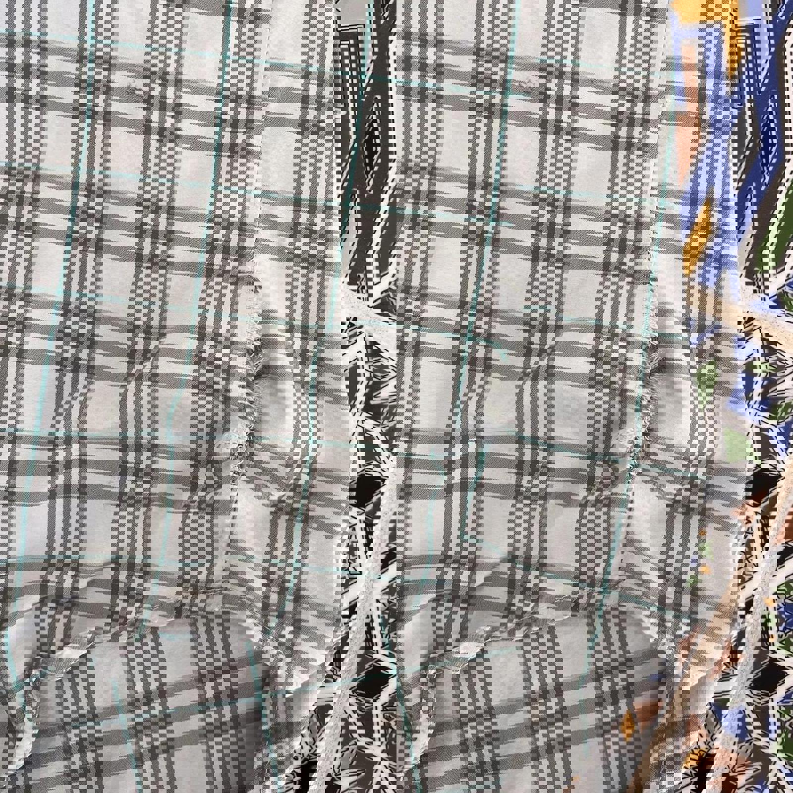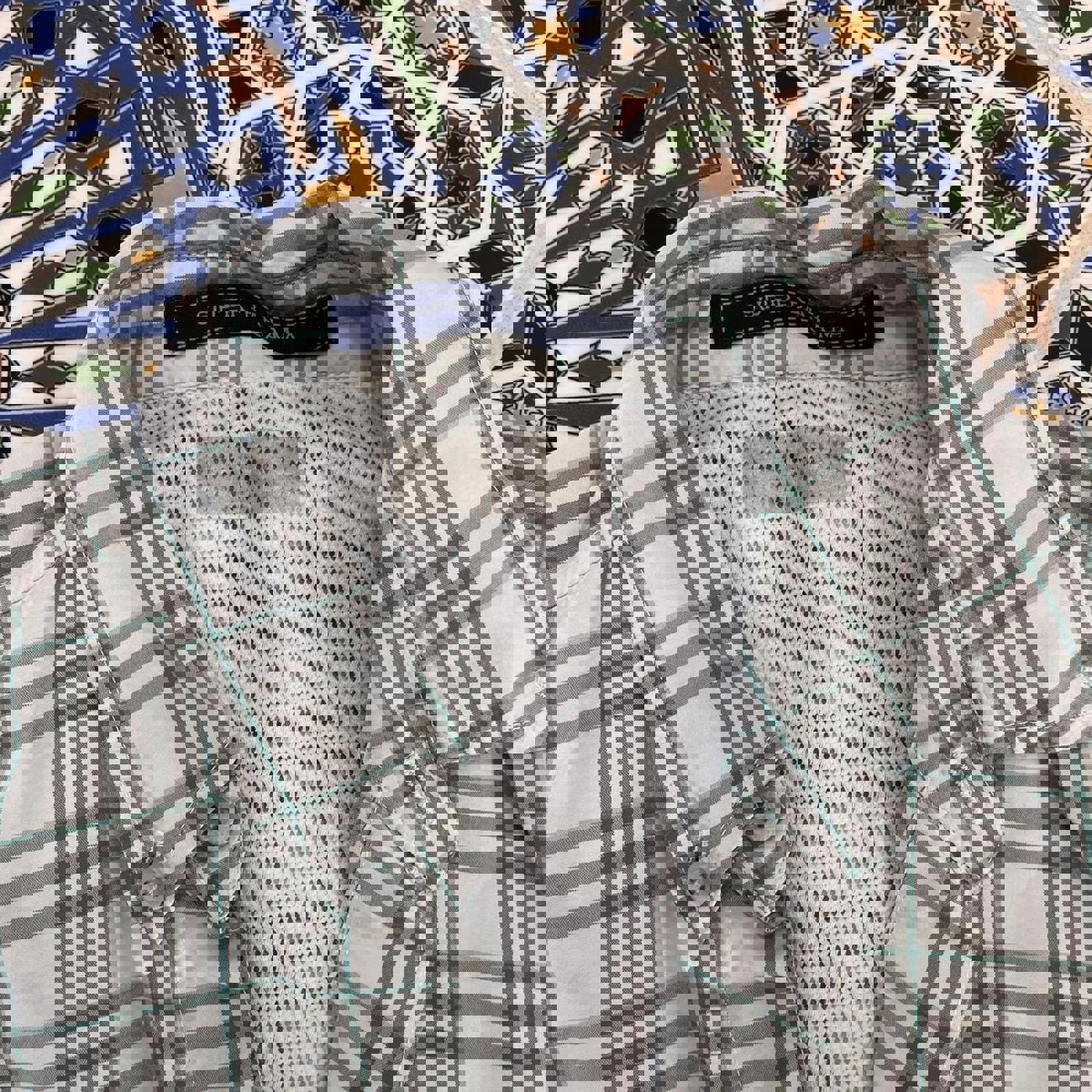 white, grey and turquoise columbia short sleeved button up shirt with patch above the chest pocket
