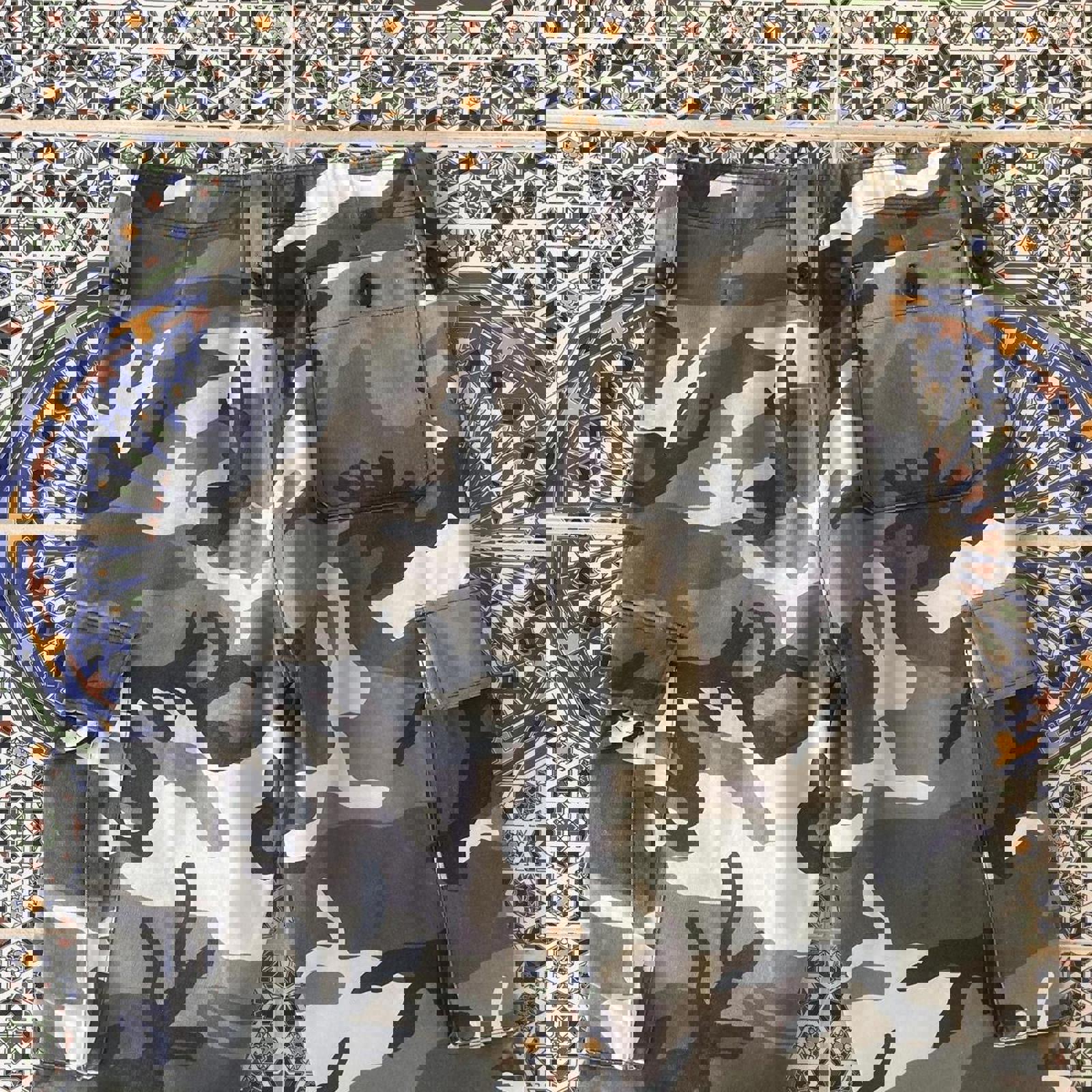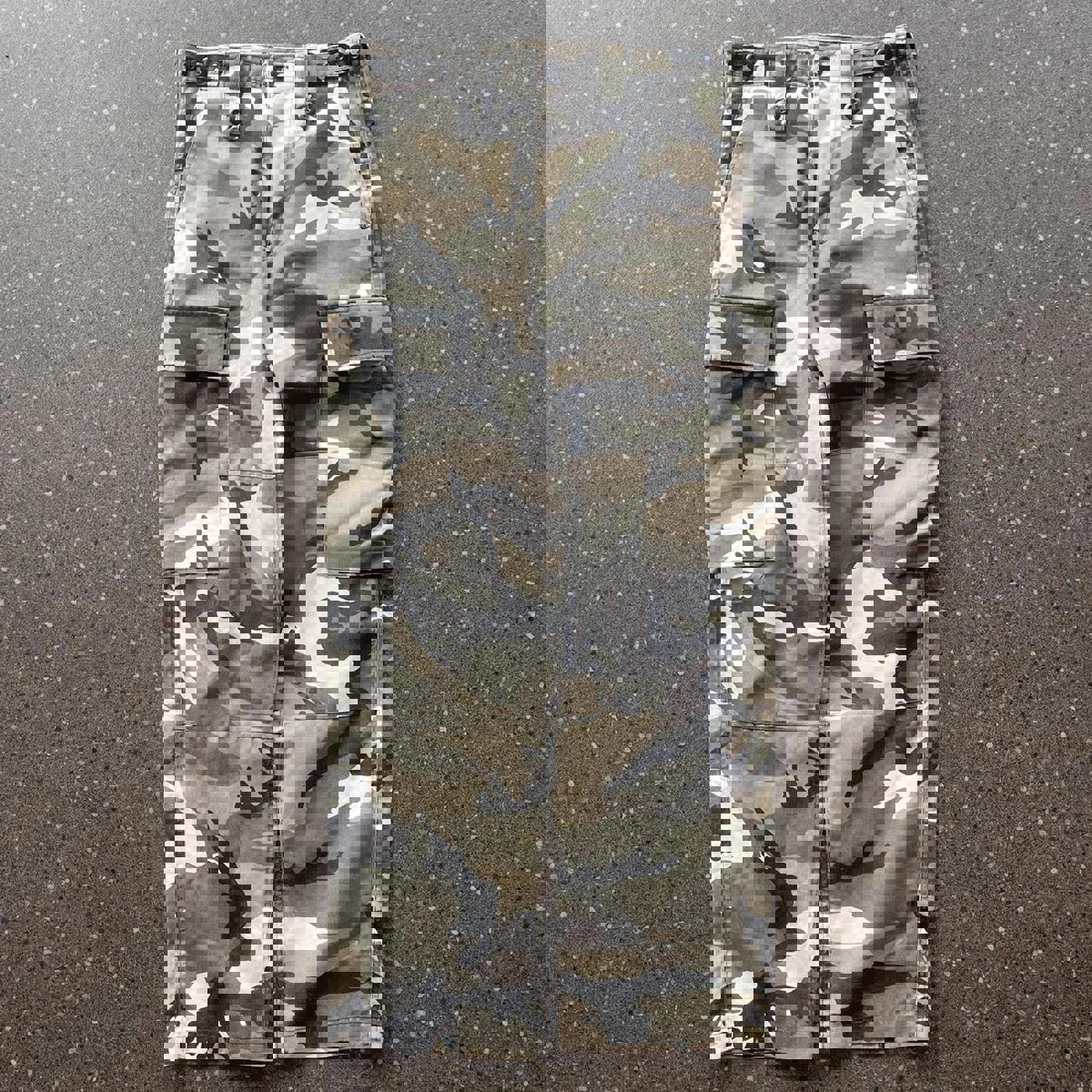 camouflage with white army cargo pants with adjustability at the waist and black buttons