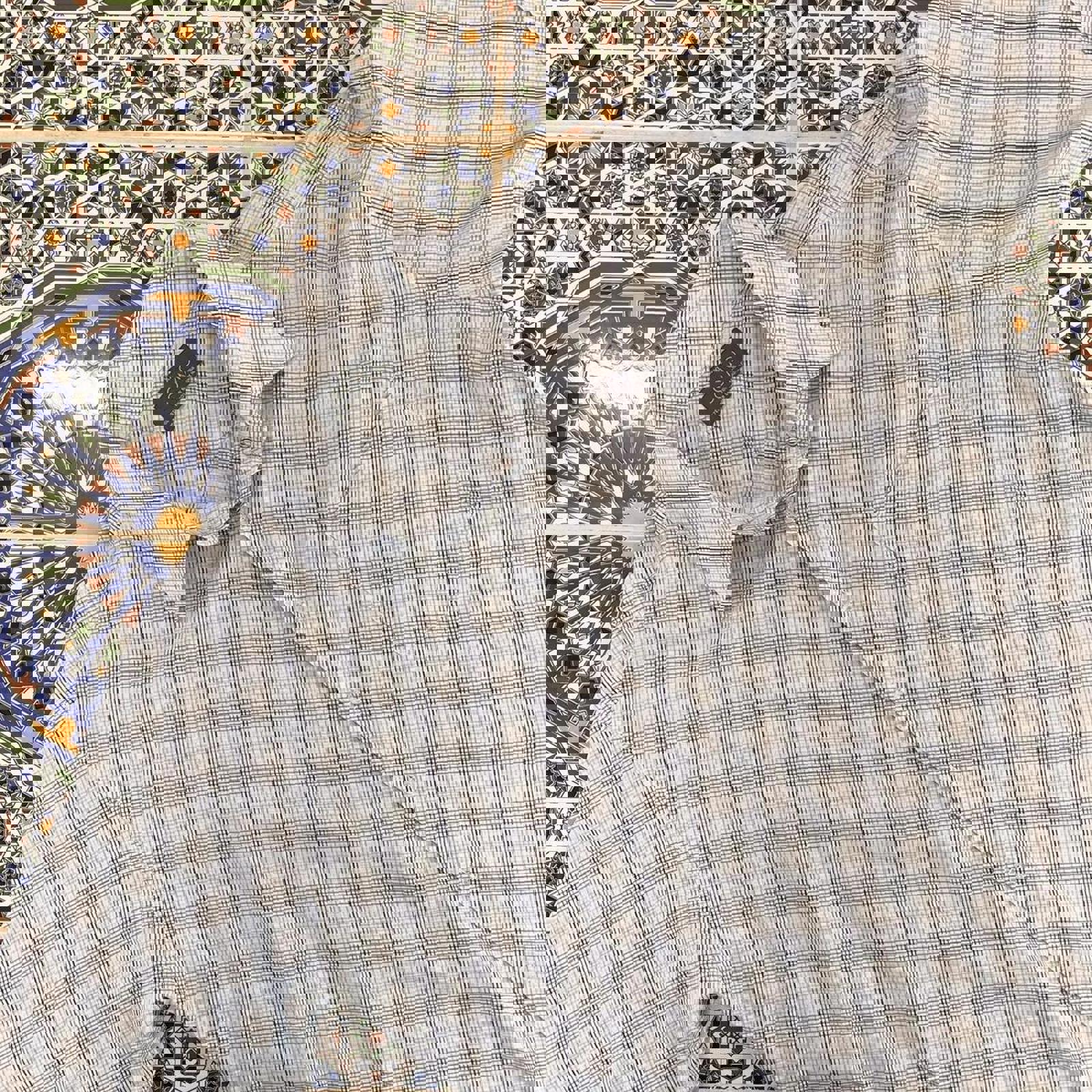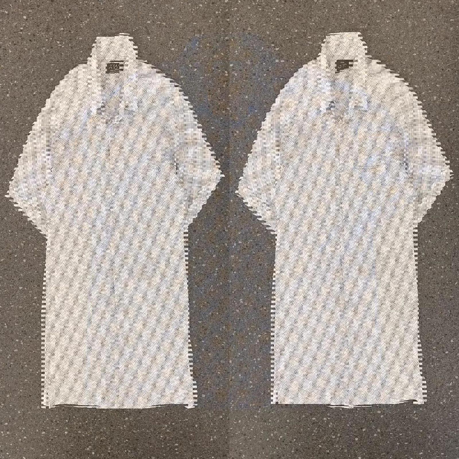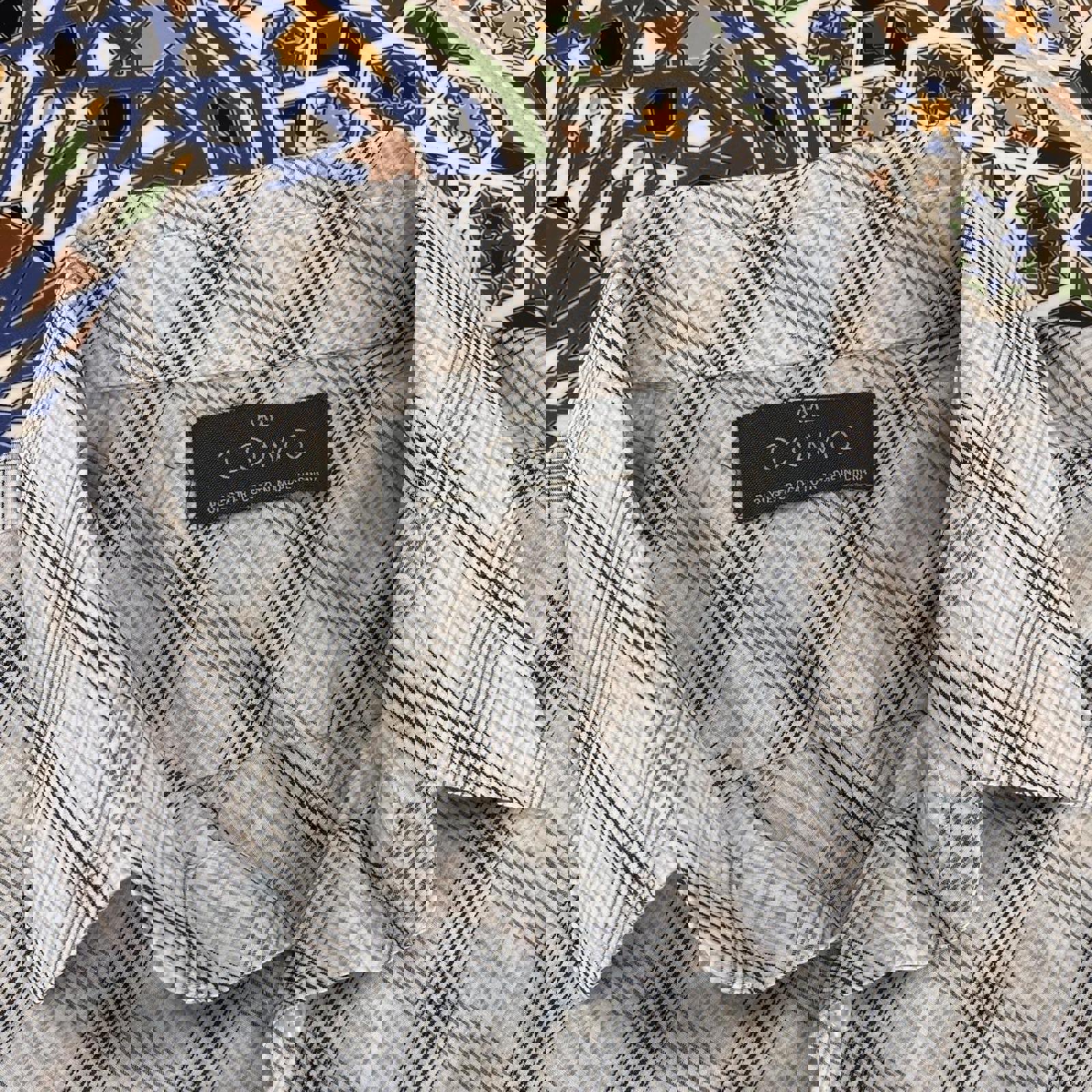 blue, tan black and white como short sleeved button up shirt with a singular chest pocket