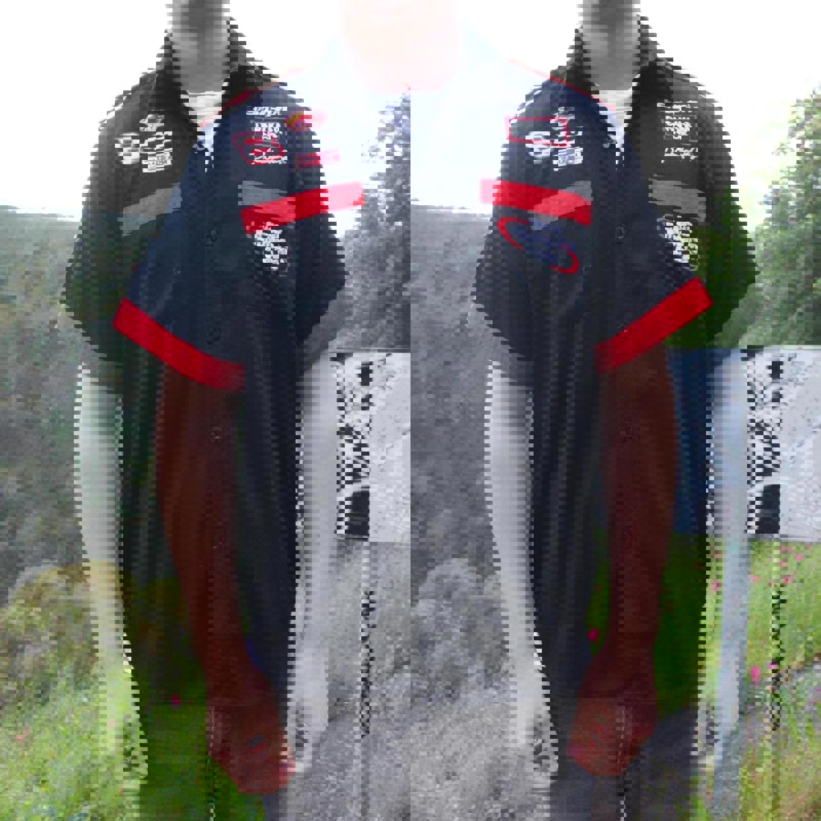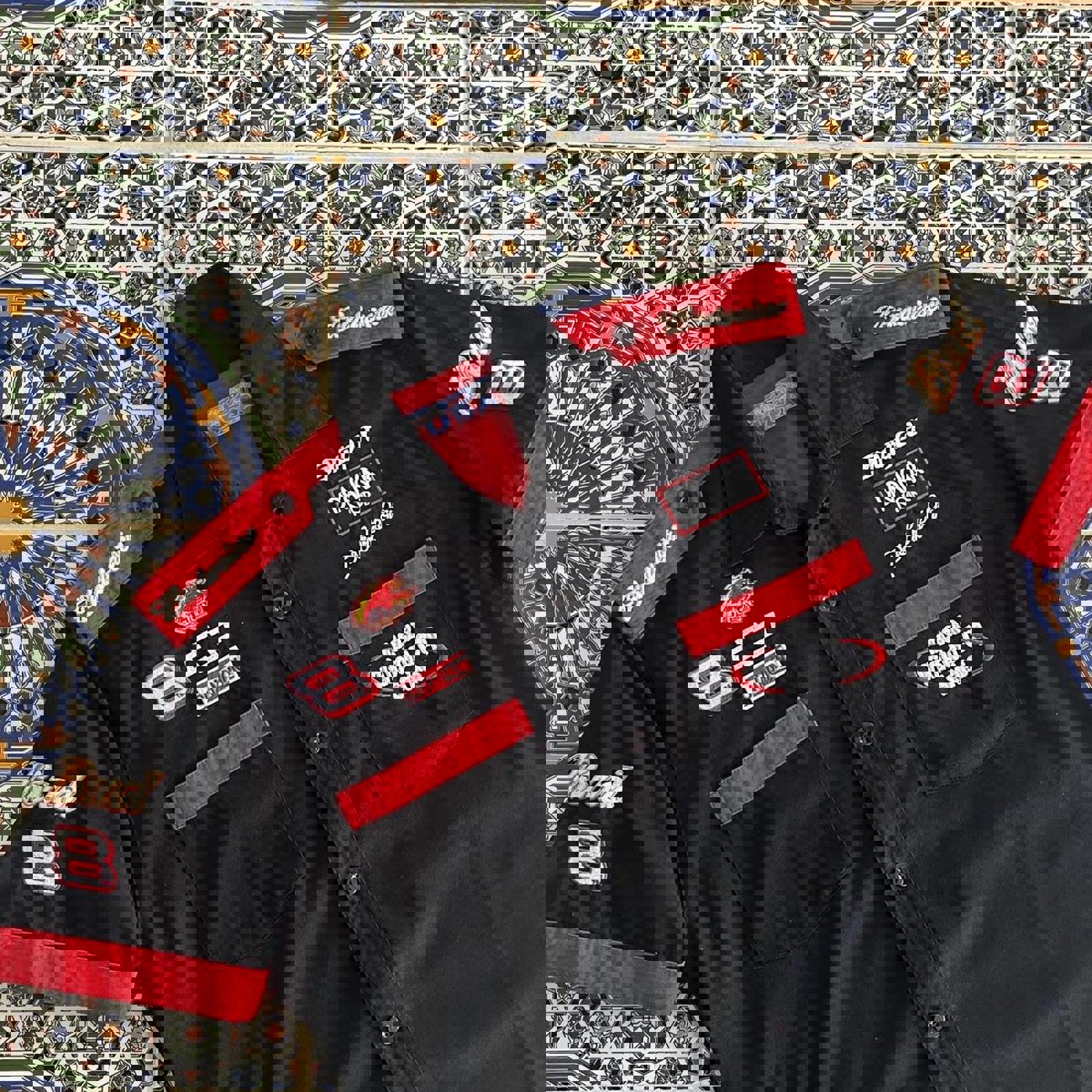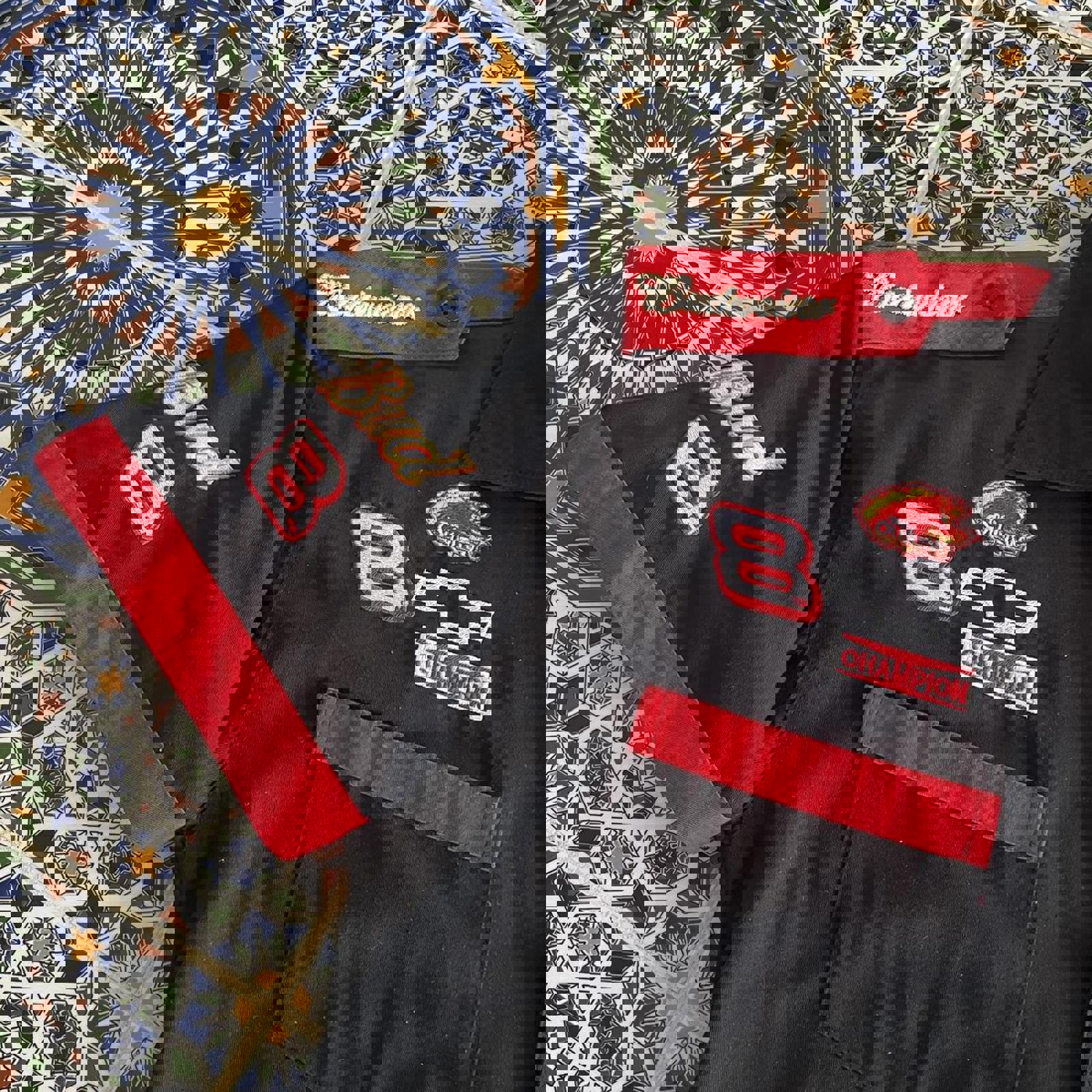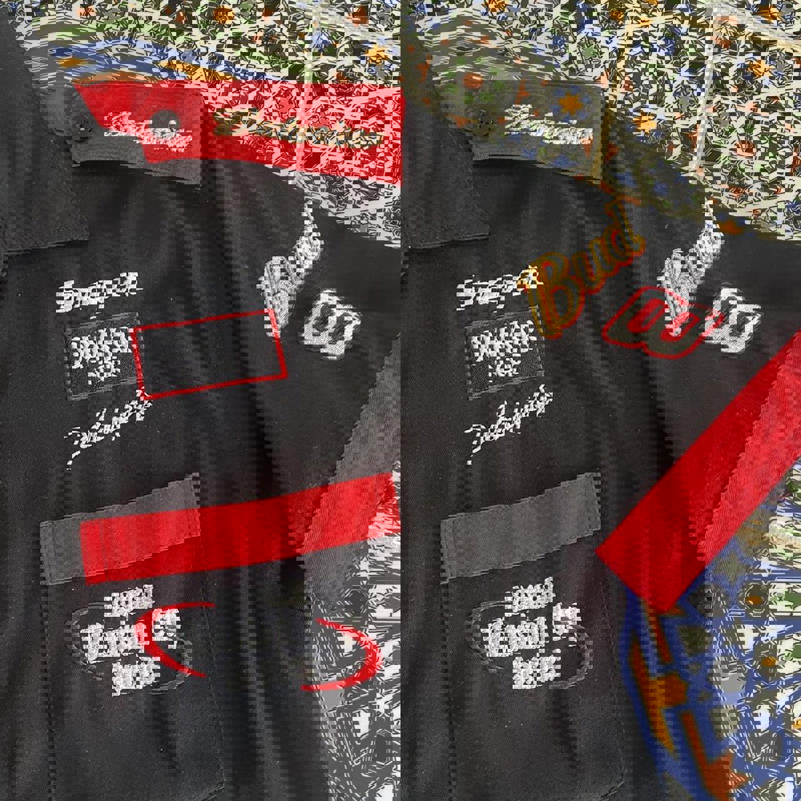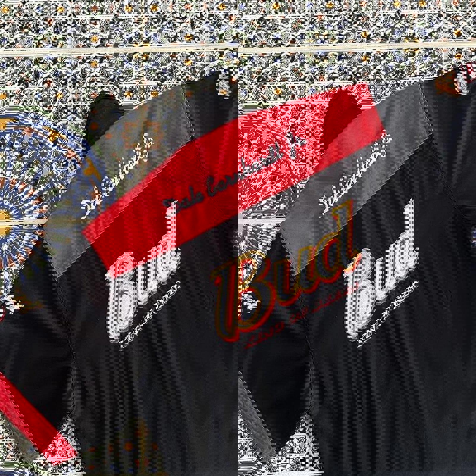 NASCAR classic red and black Dale Earnhardt shirt with embroidered sponsors on chest, shoulder, sleeves and a big Bud beer back hit