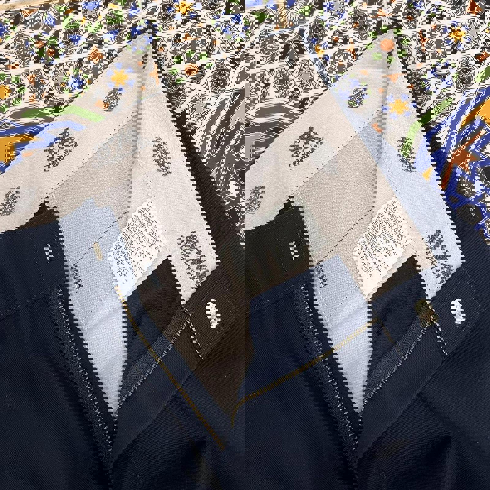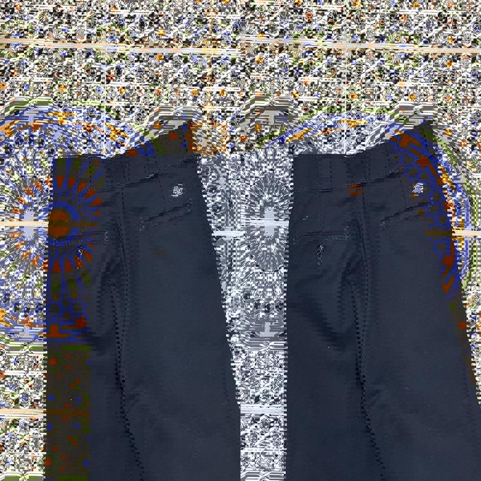 navy dickies 874 pants with a red dickies patch on the back above the pocket