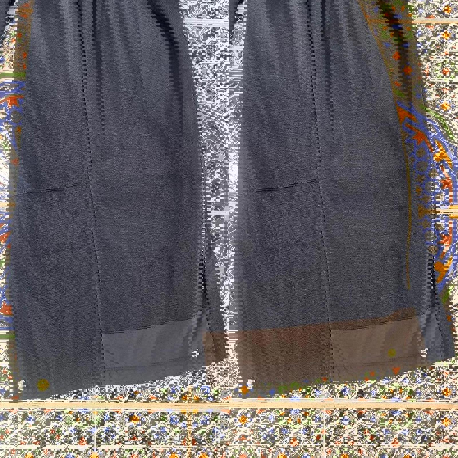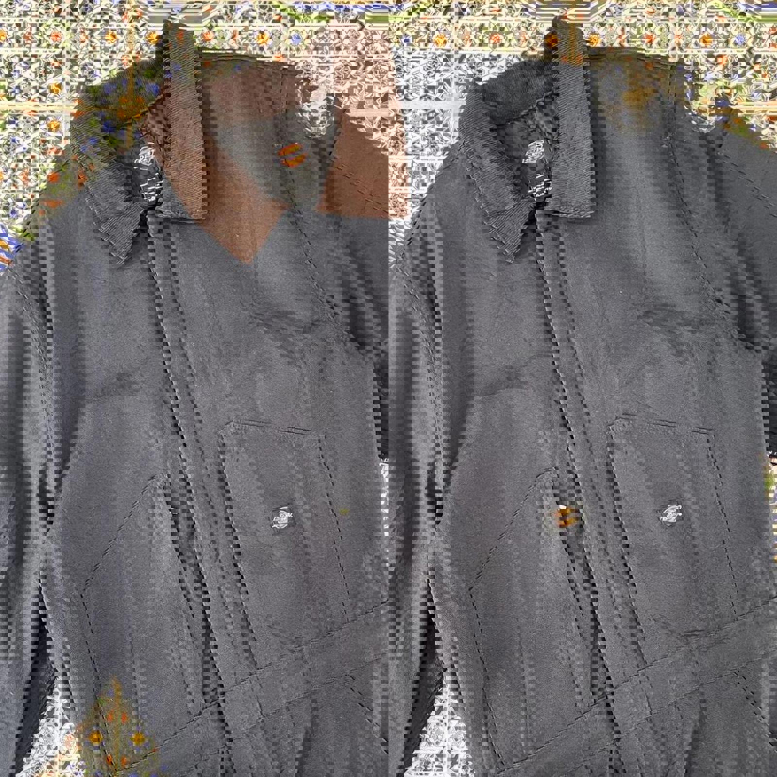 Navy dickies heavy weighted insulated carpenter coverall jumpsuit with black dickies patches on the front and back, brown corduroy collar and the option to zip legs to waist