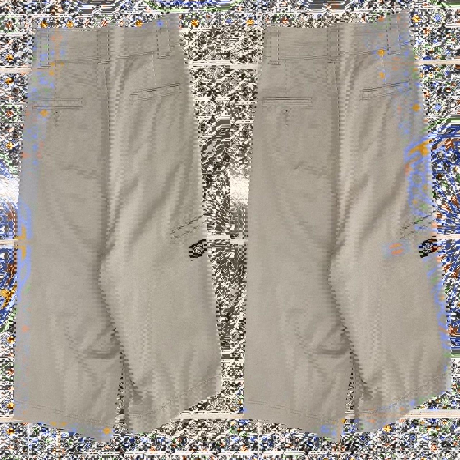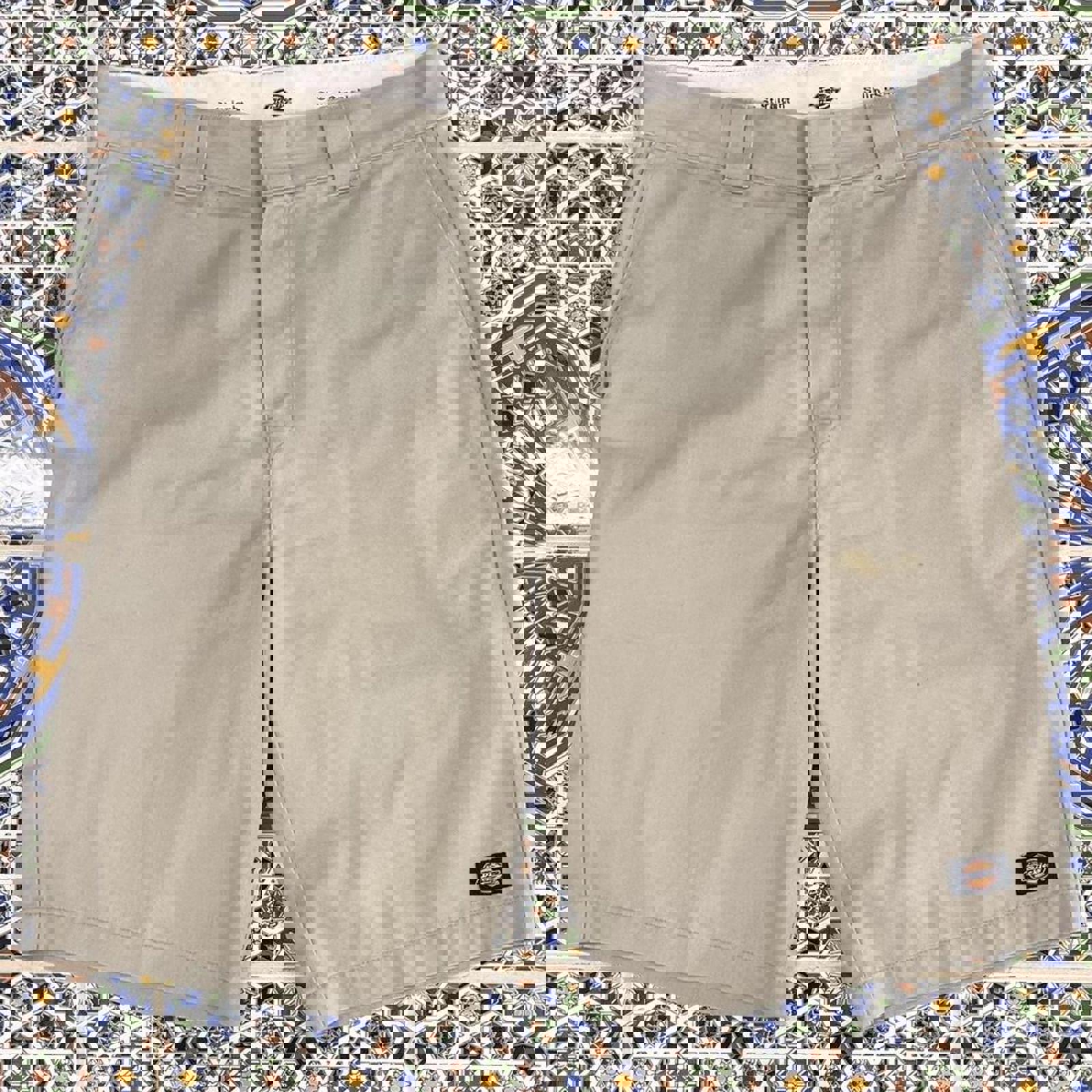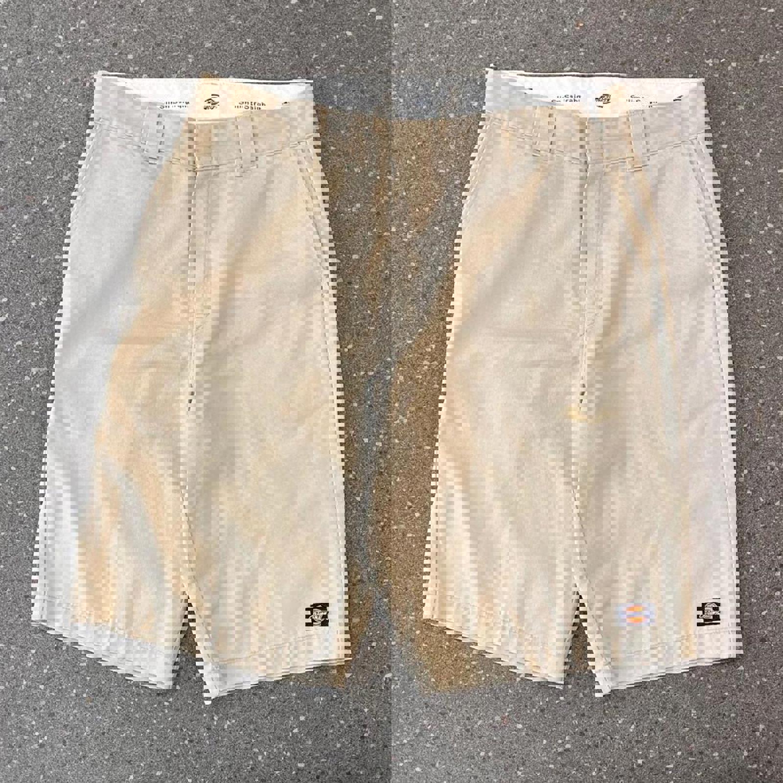 Tan dickies shorts with black dickies tabs on both sides of the legs