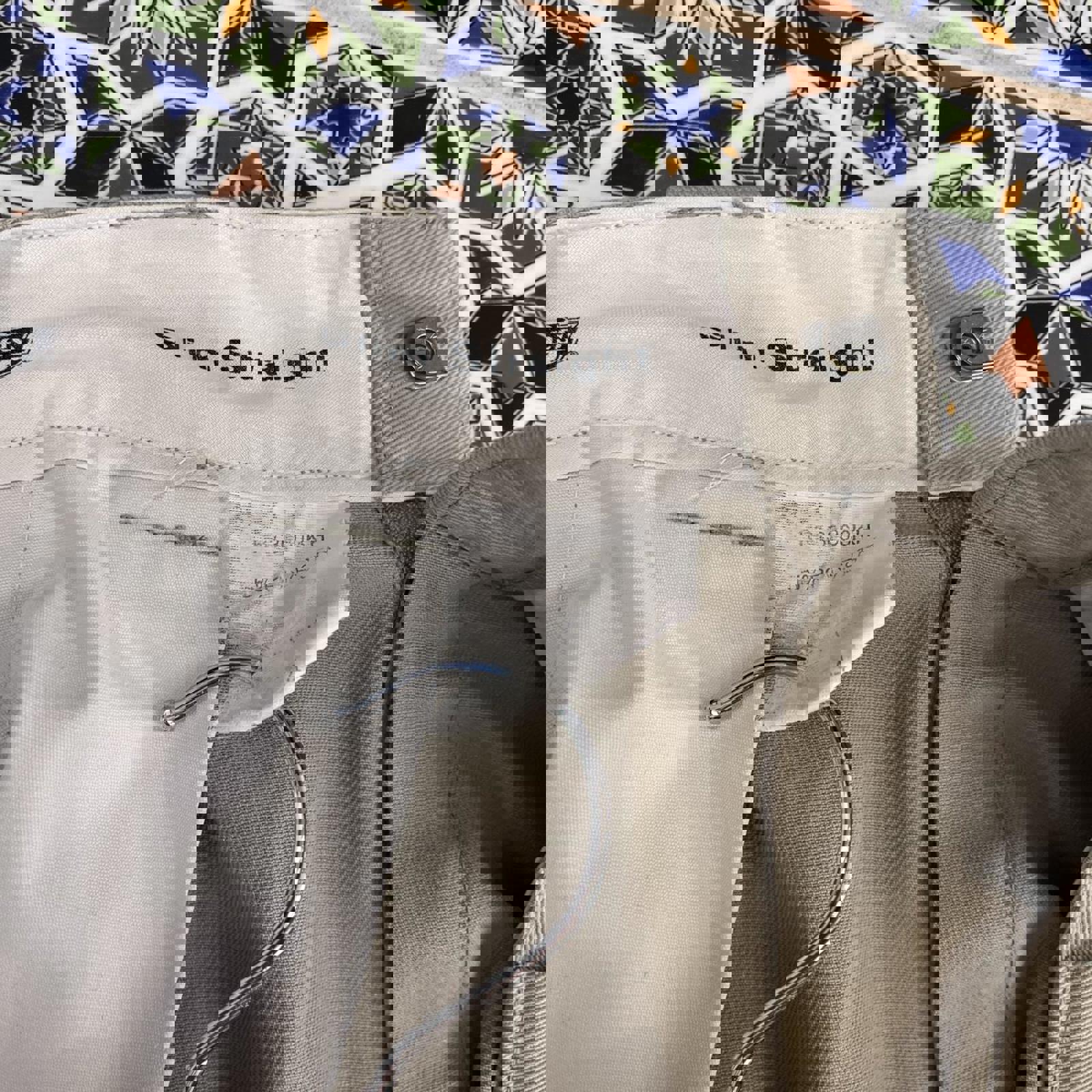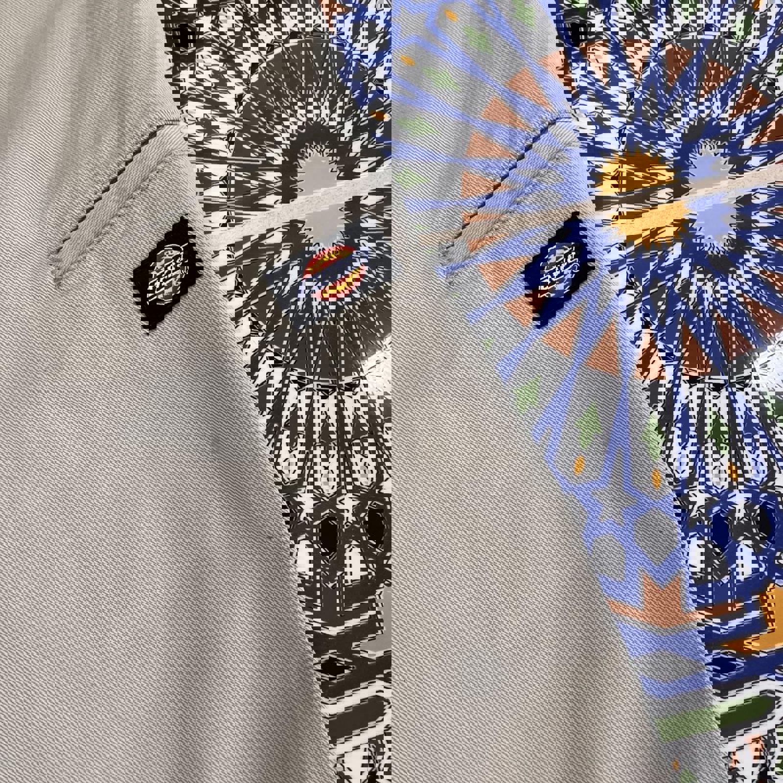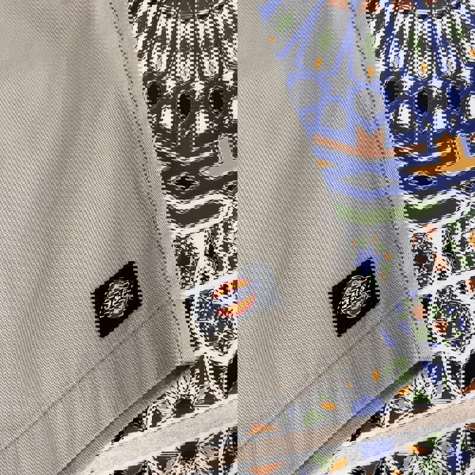 Tan dickies shorts with black dickies tabs on both sides of the legs
