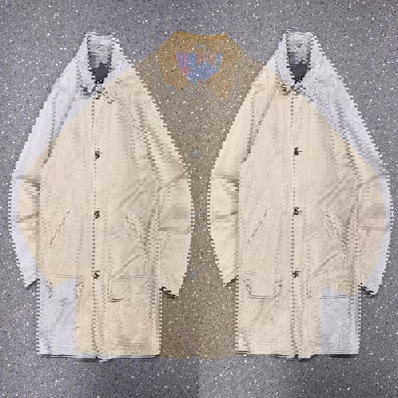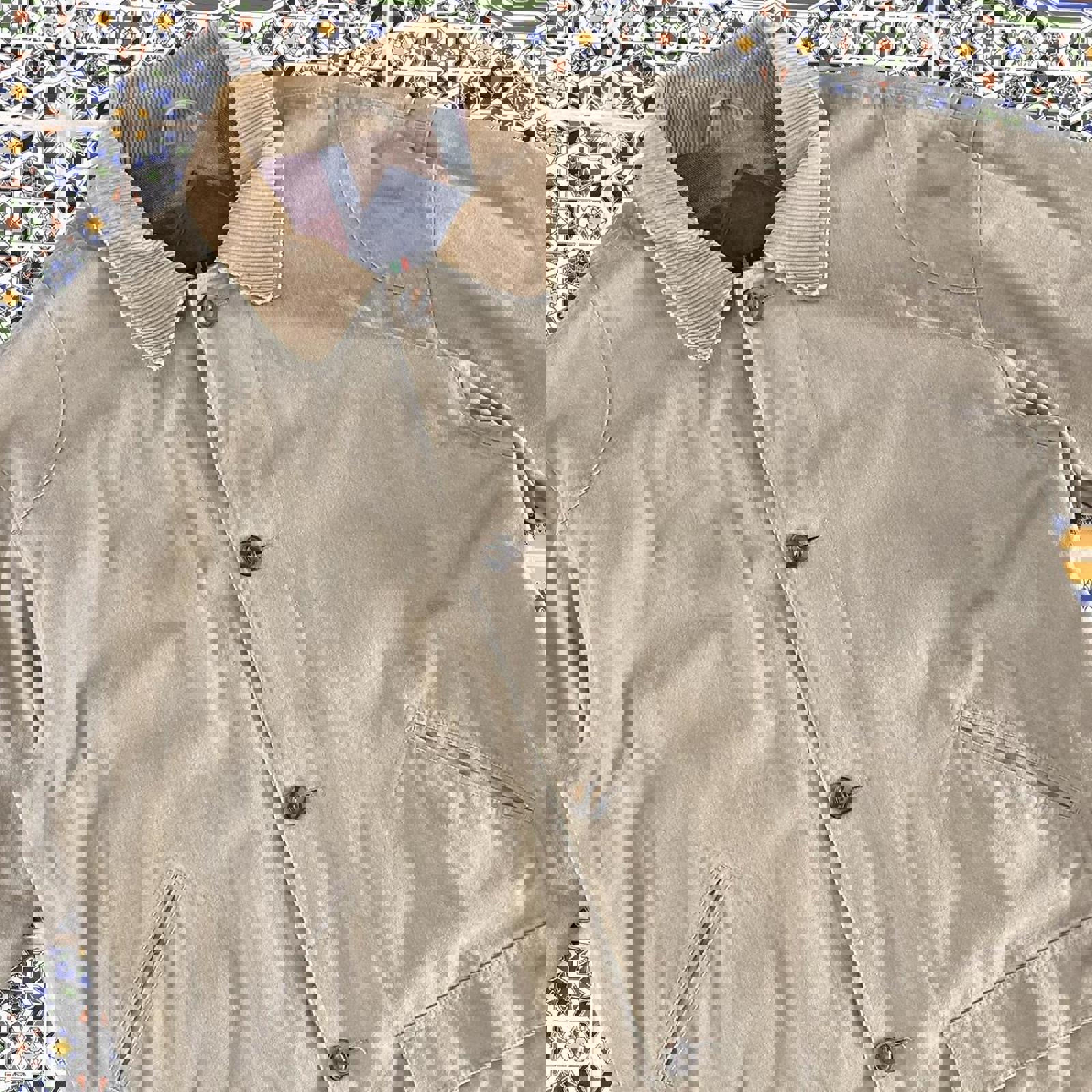 Tan DiMaggio trench button up jacket with a corduroy collar and flannel interior
