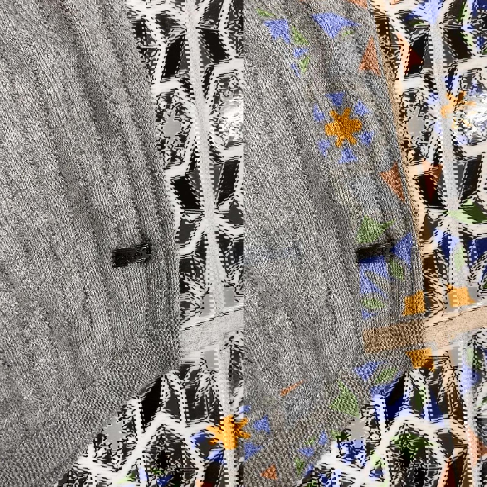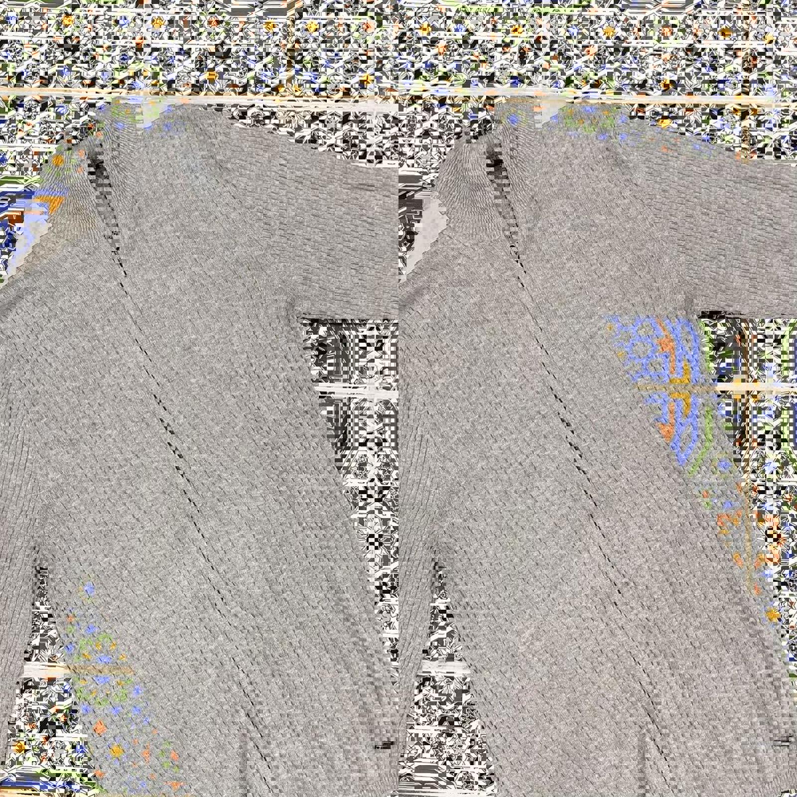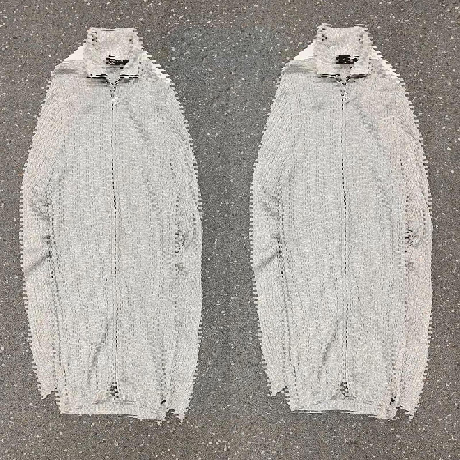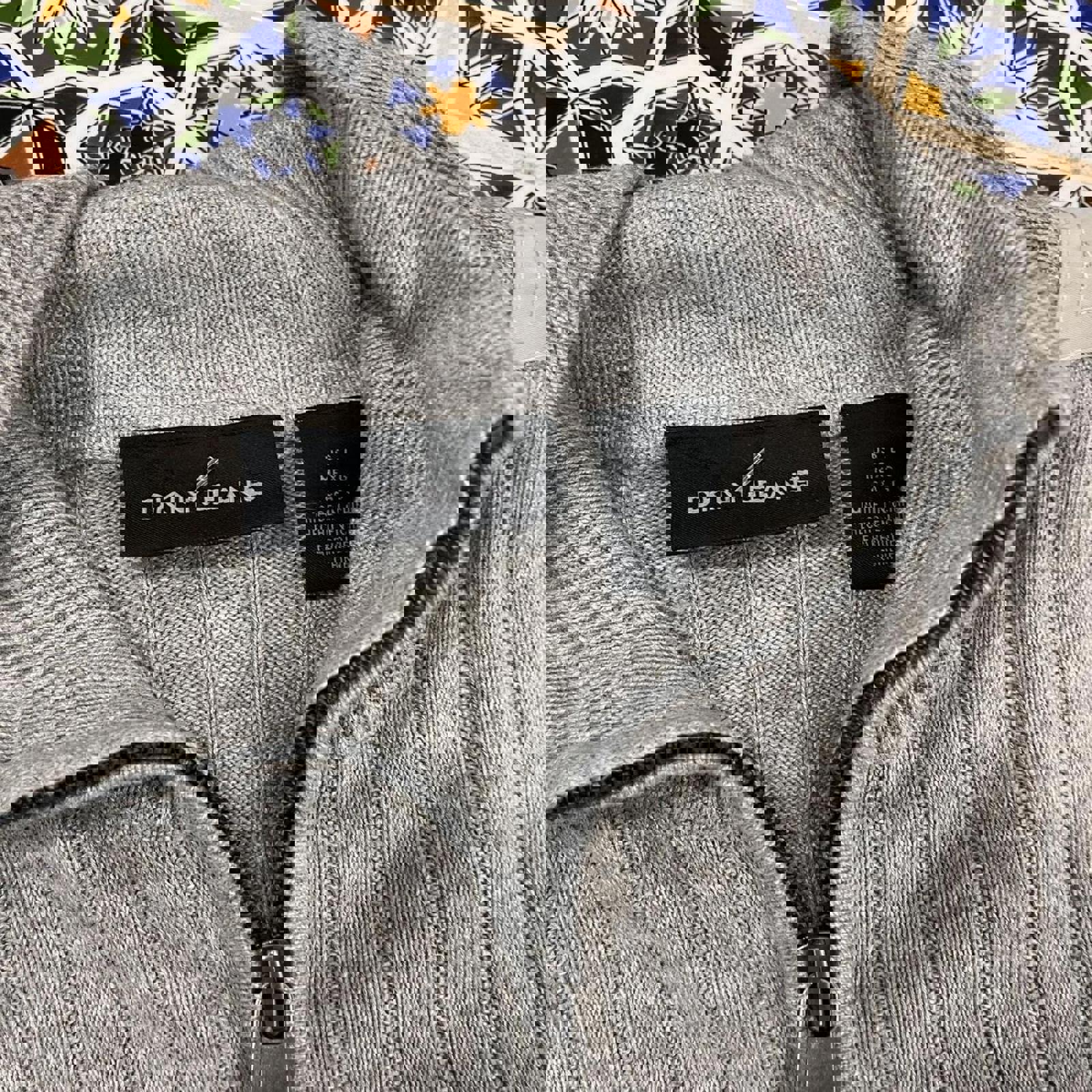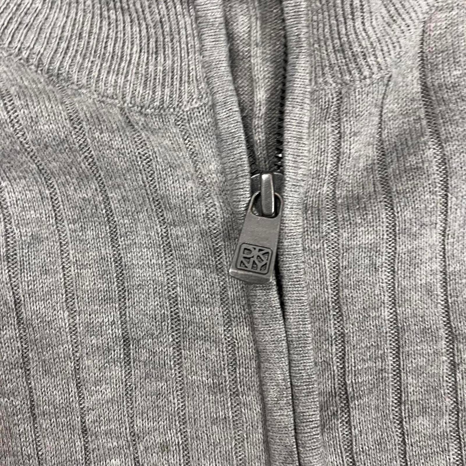 grey textured DKNY jeans cardigan sweater jacket with a detailed zipper and metal tab on the hip