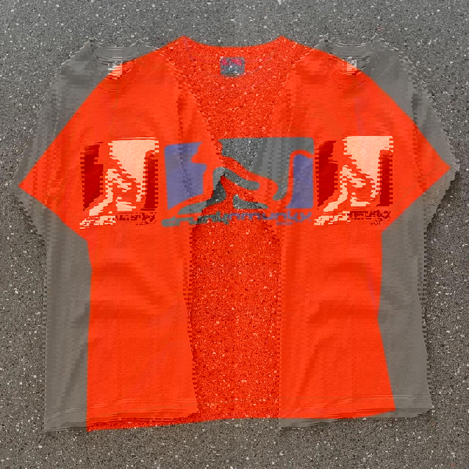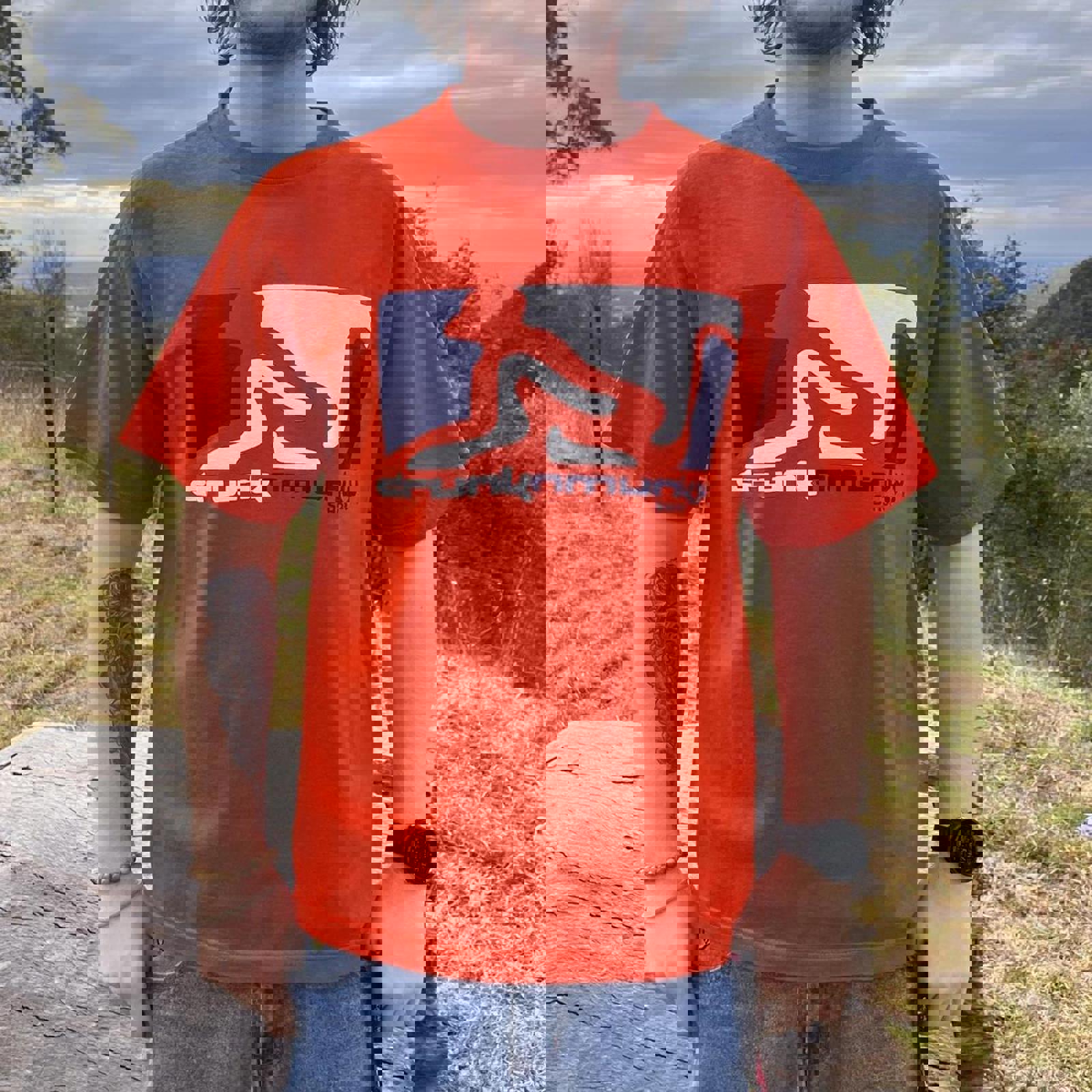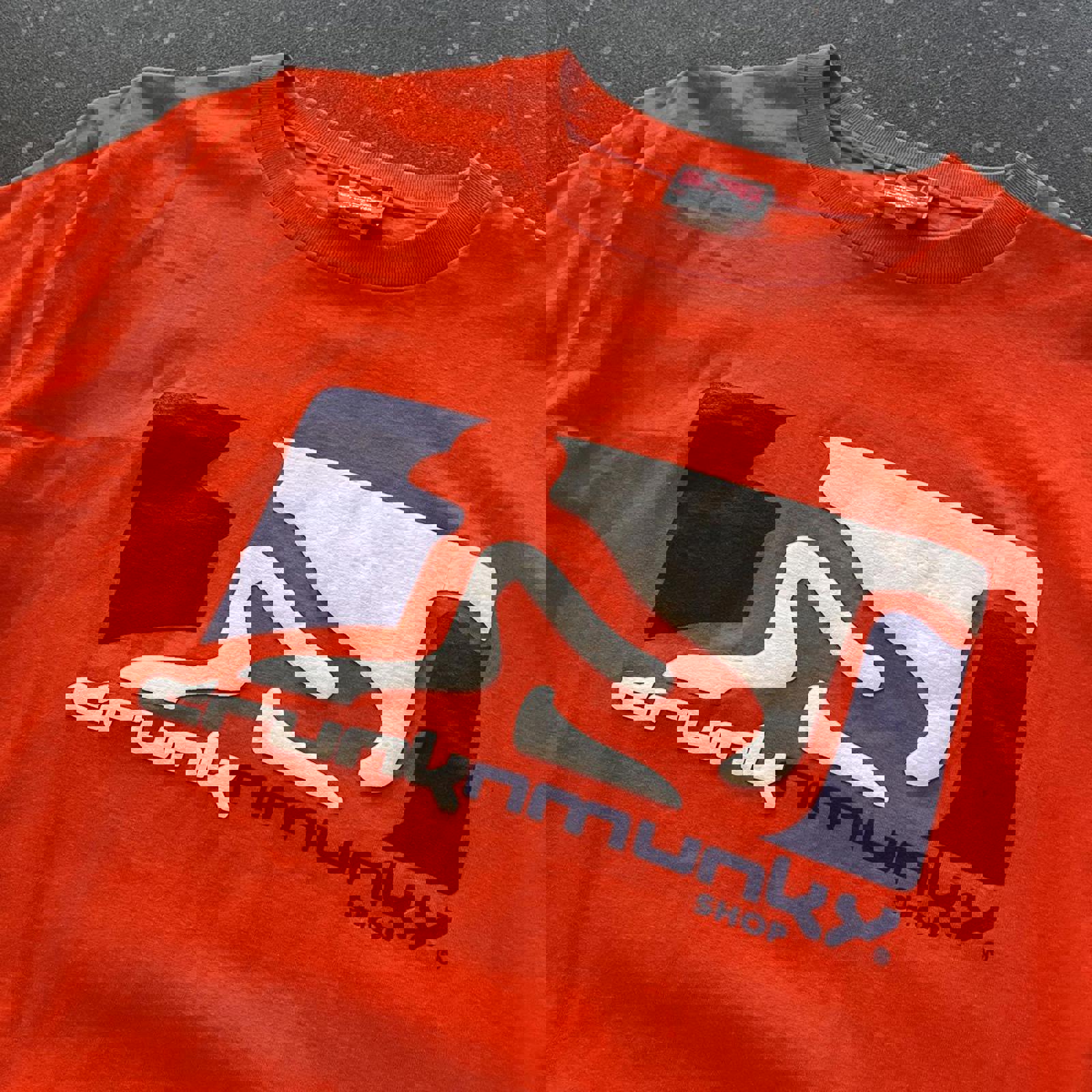 Orange drunknmonky tee with a large graphic on the front and a smaller one on the back