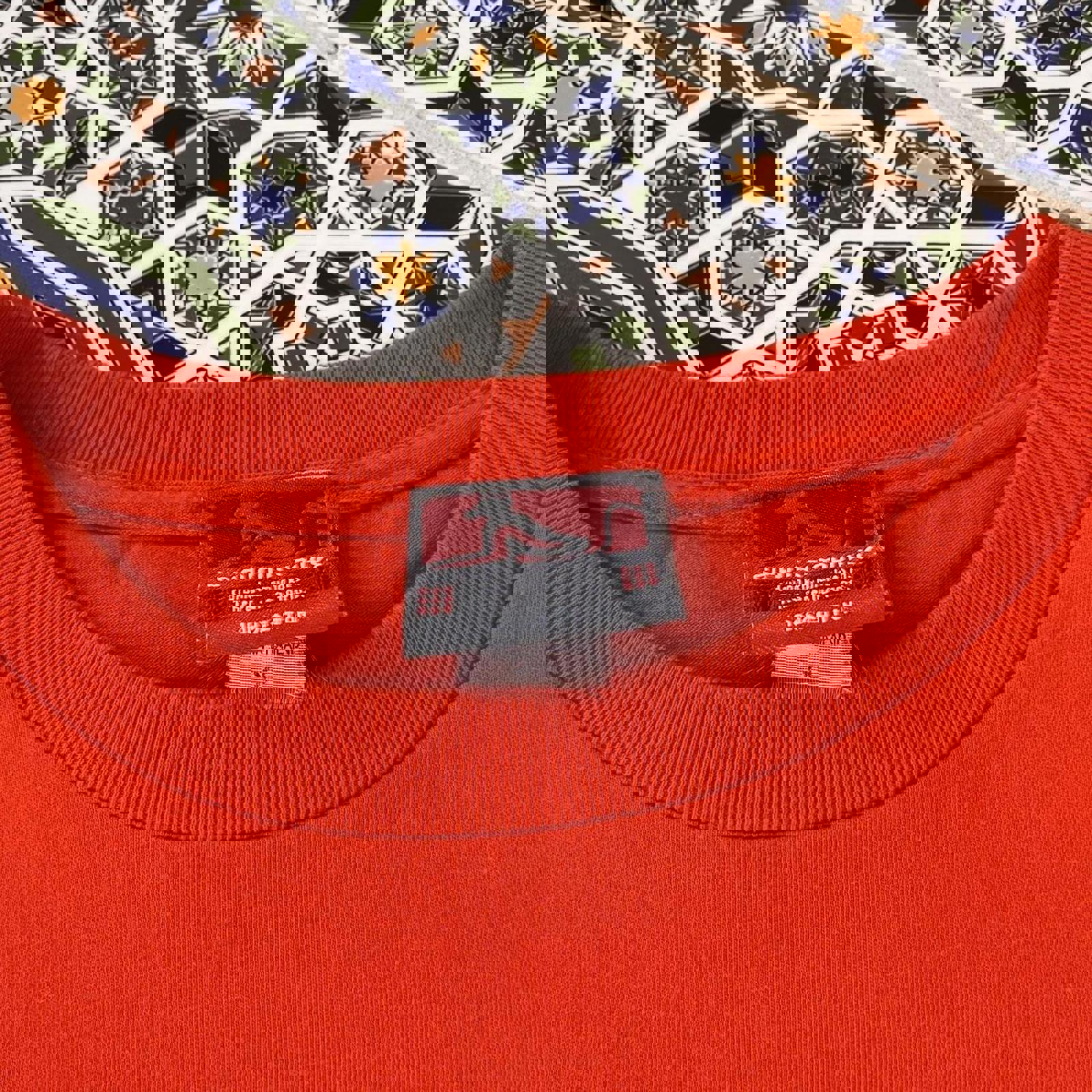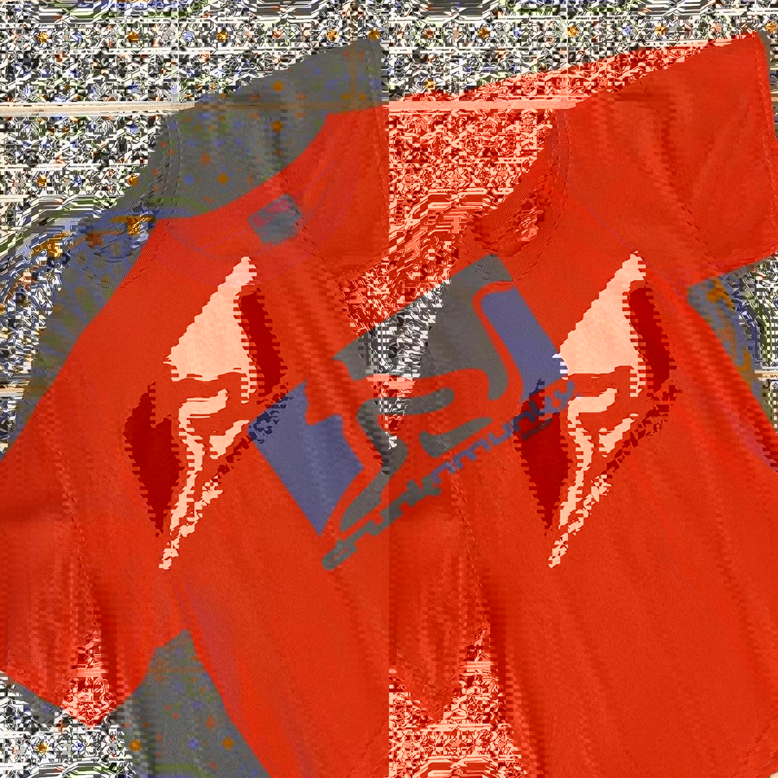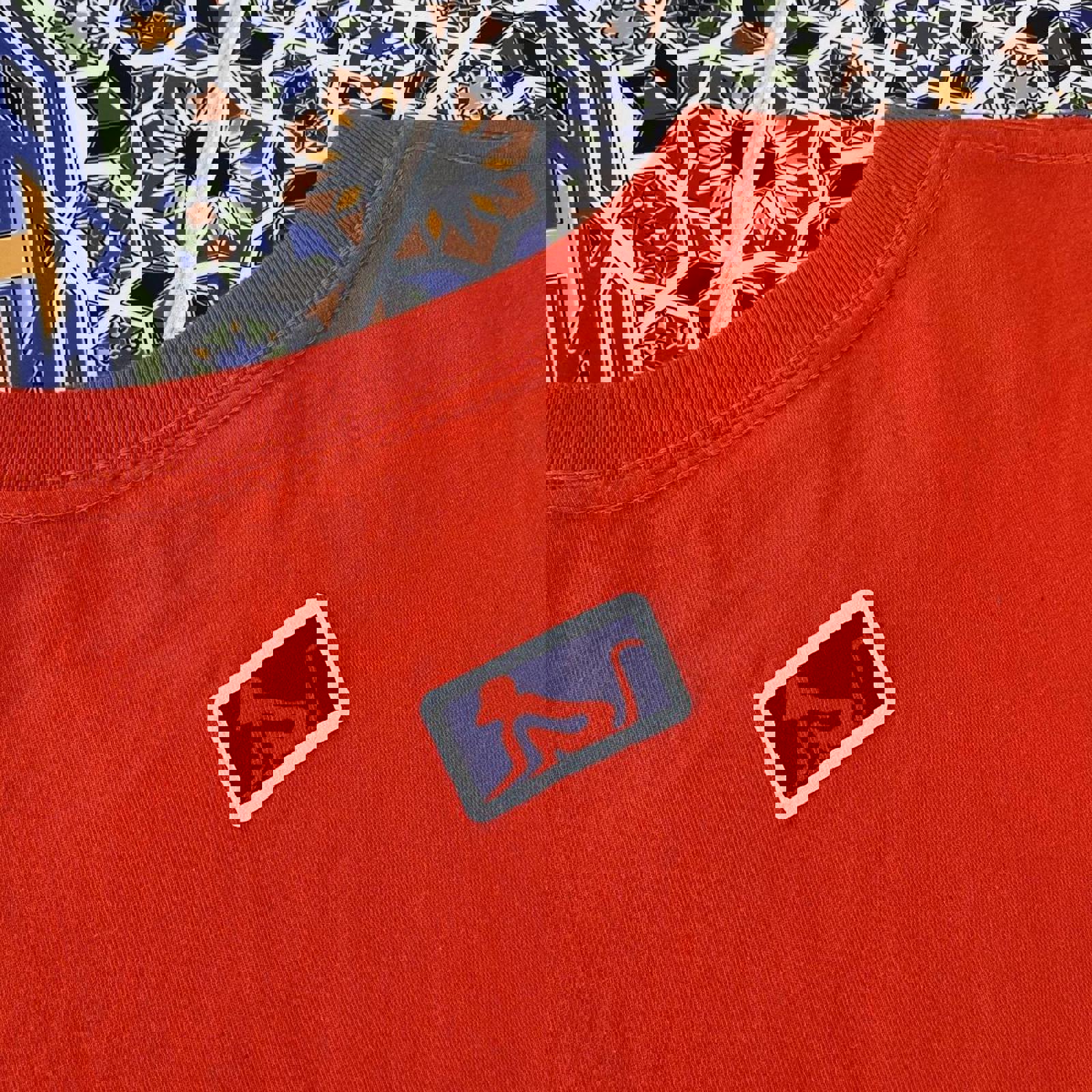 Orange drunknmonky tee with a large graphic on the front and a smaller one on the back