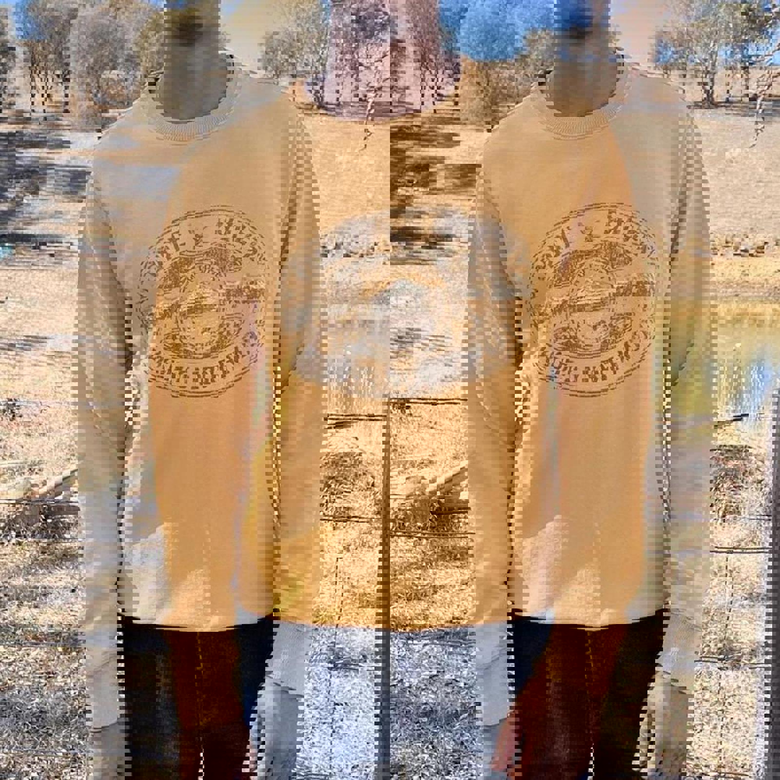 yellow eddie bauer jumper with large pacific northwest graphic on the front