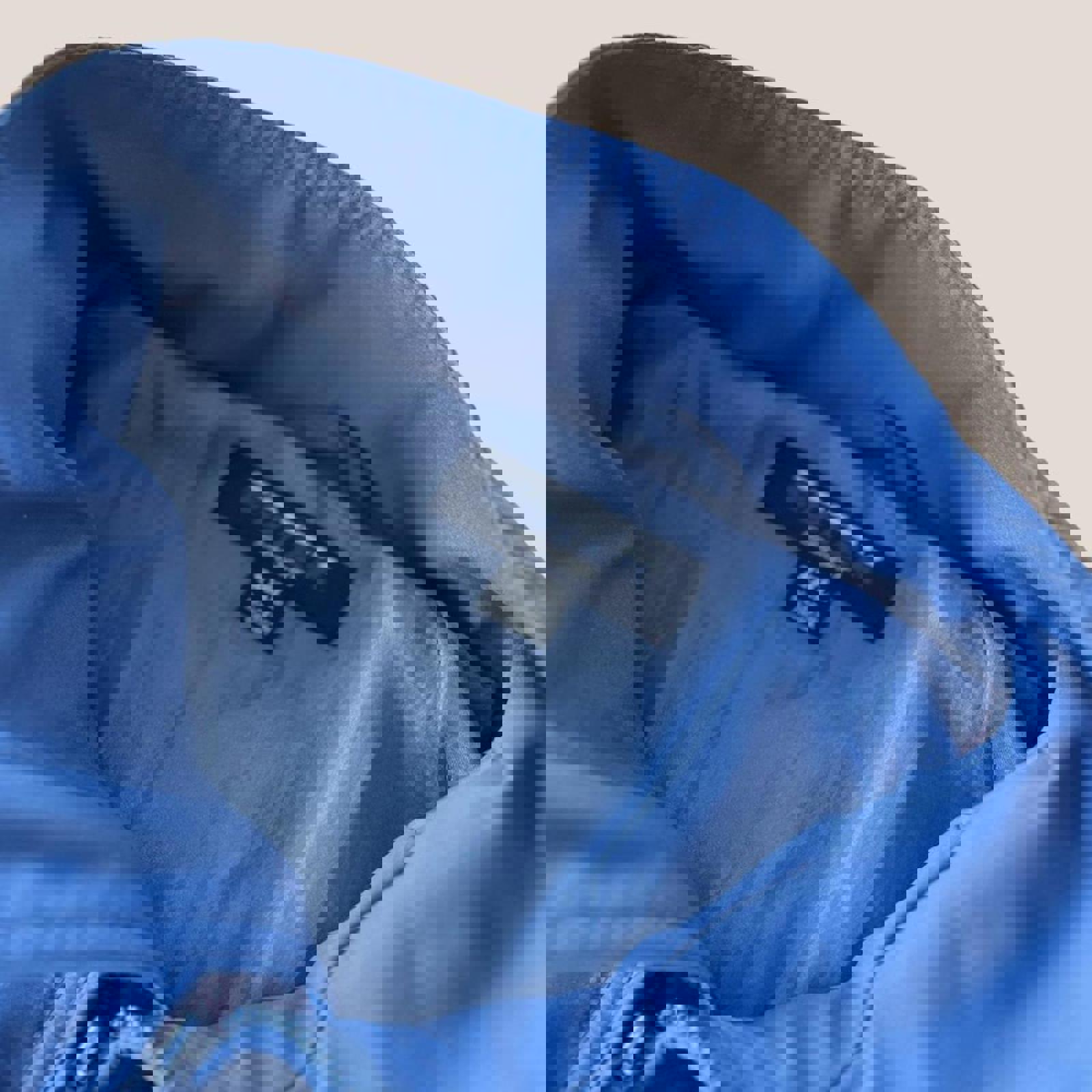 pocket inside and adjustable at waist baby blue and navy block colours with white strip on sides and piping Small red and navy edtek badge on chest