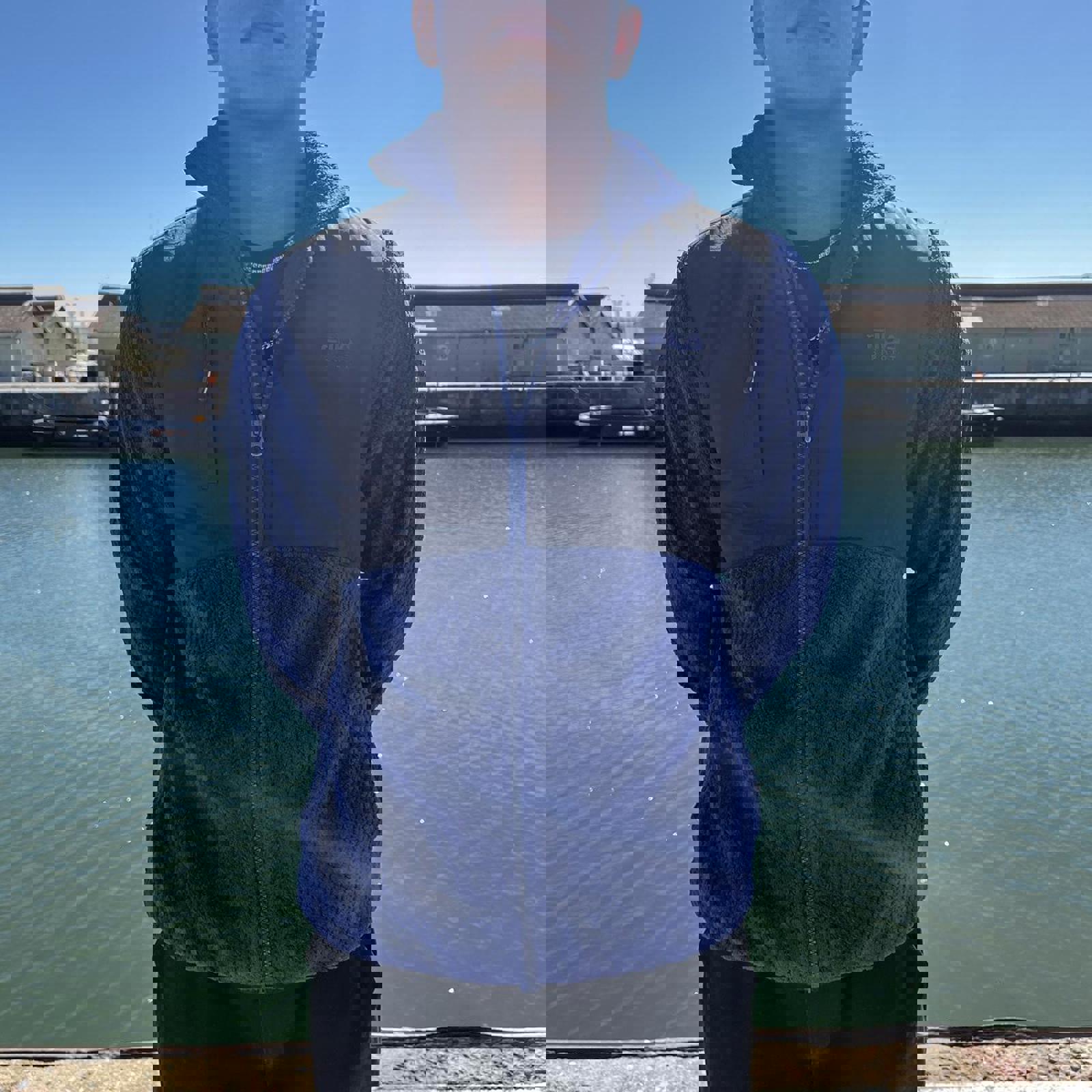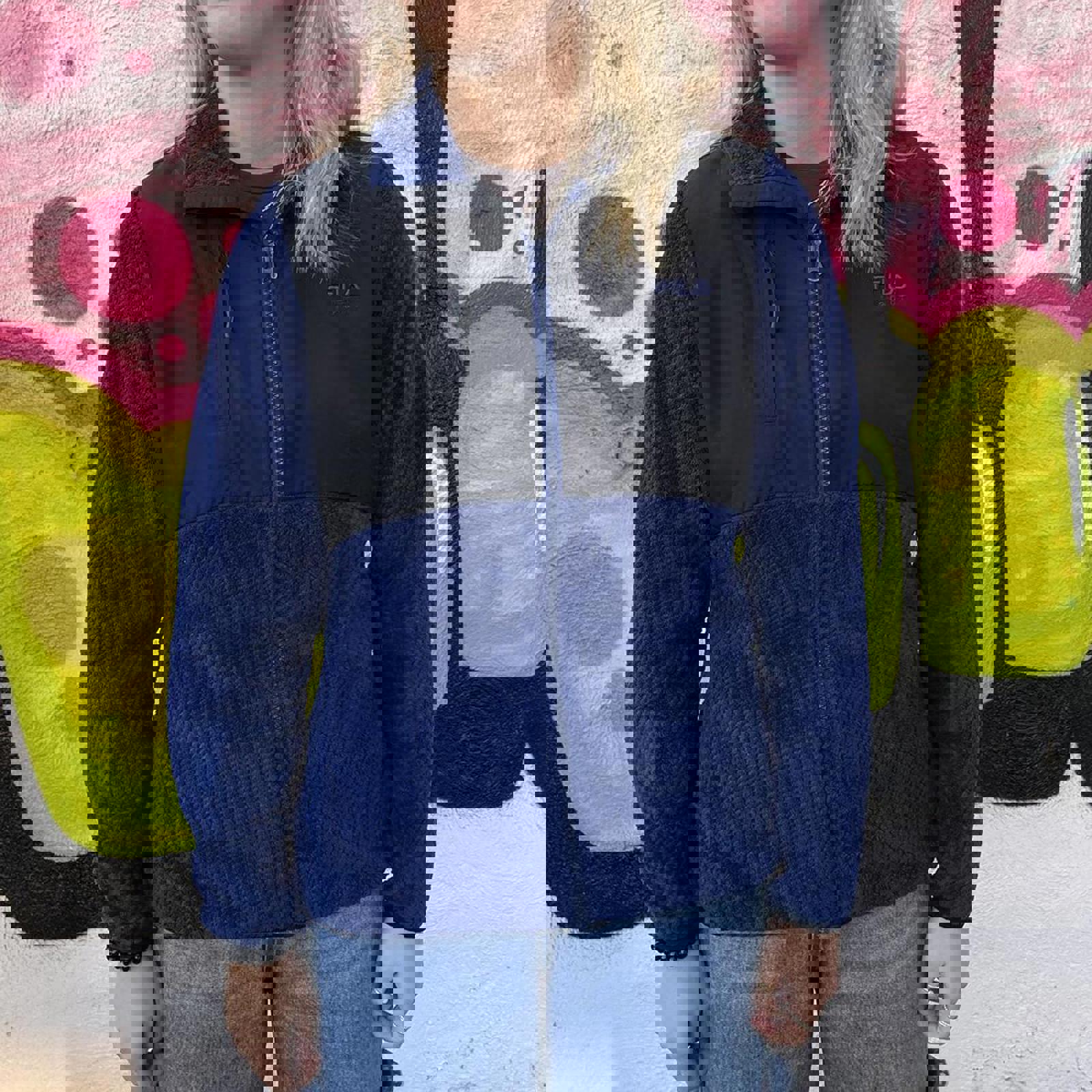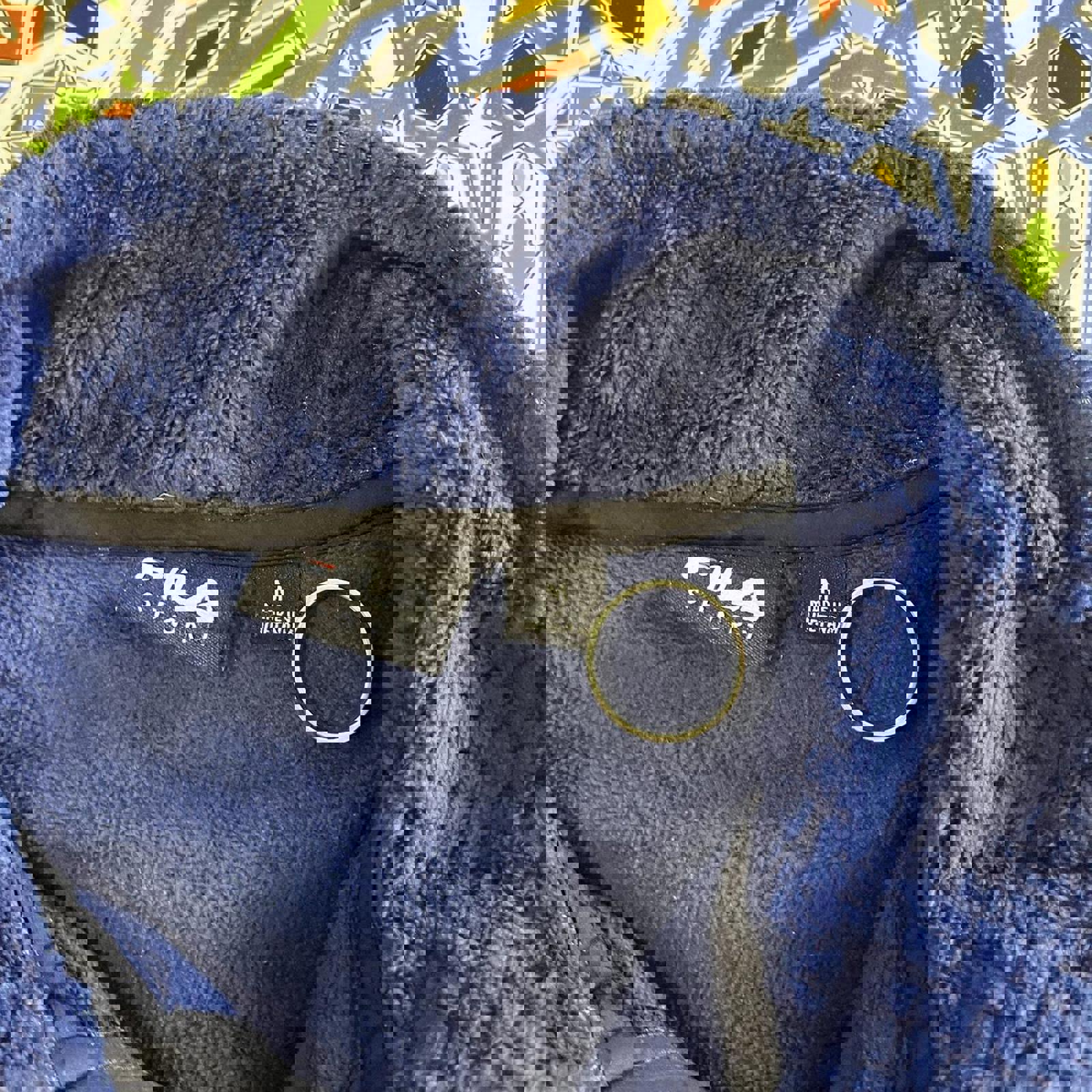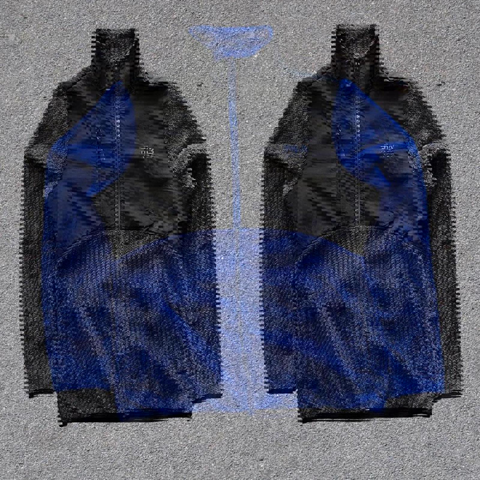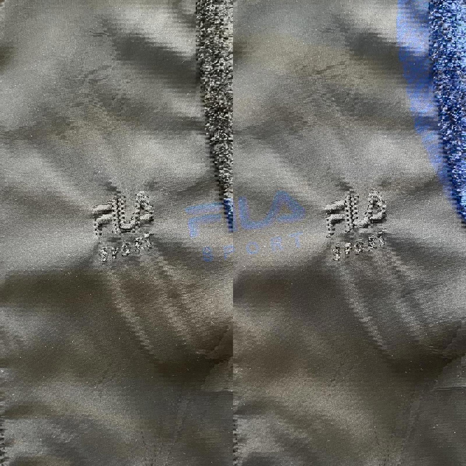 blue and black, fleece and nylon fila sweater jacket with an embroidered fila logo on the chest
