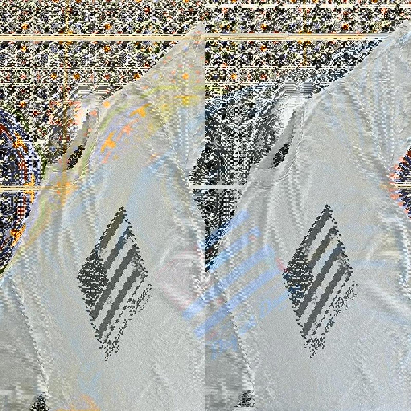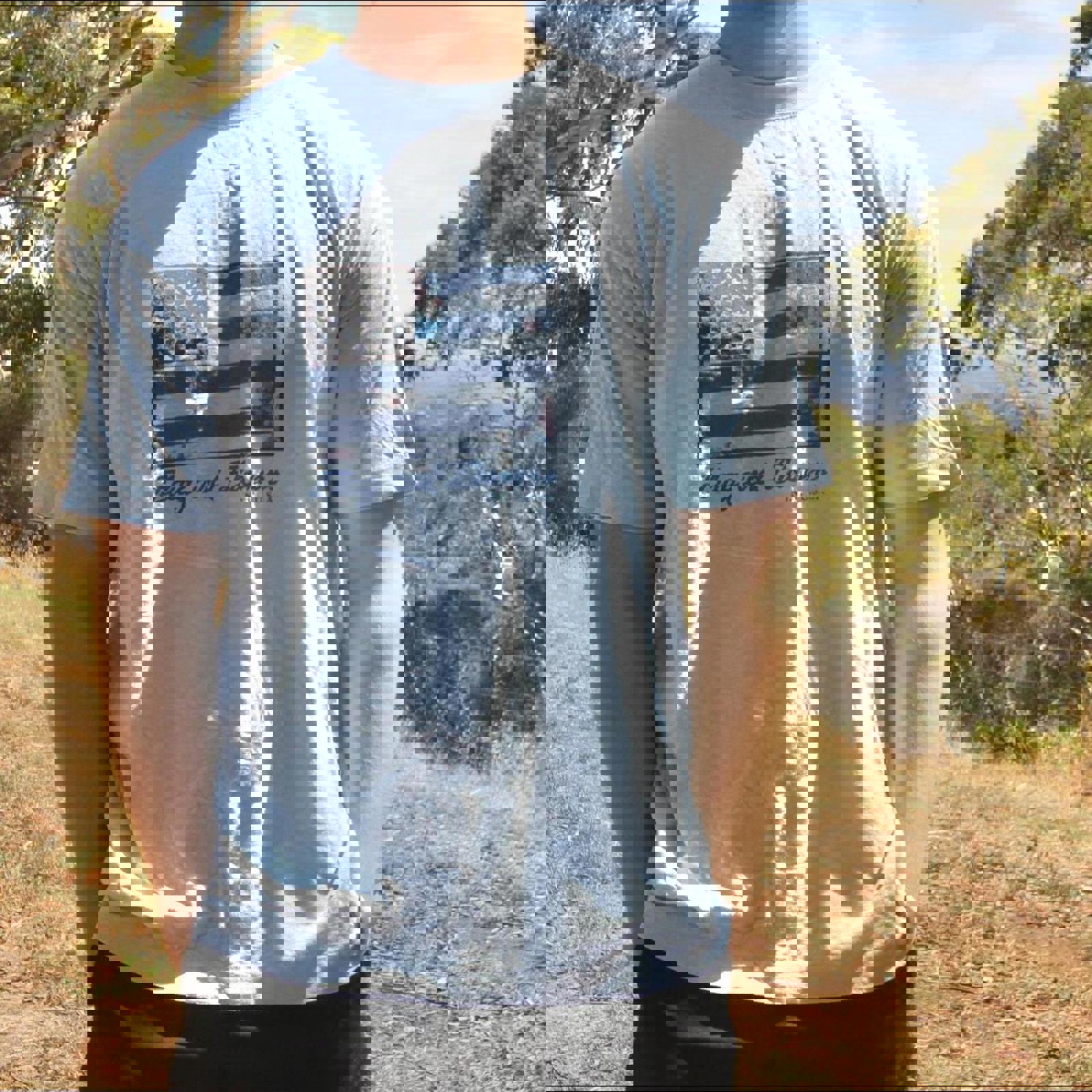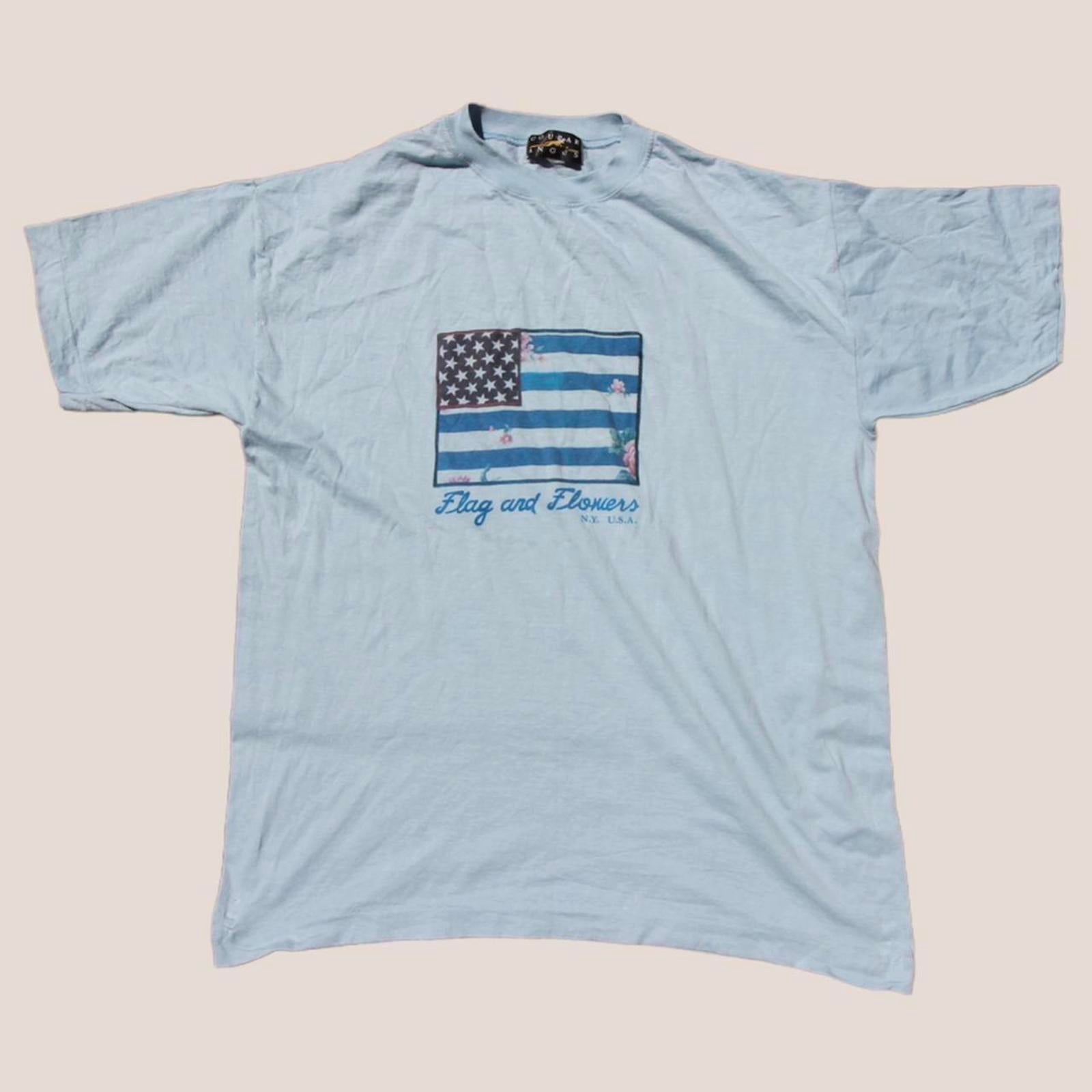 baby blue single stitch tee with screen printed American flag and flowers graphic on front couper angus
