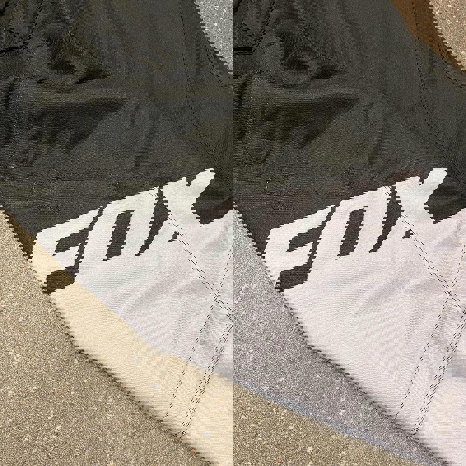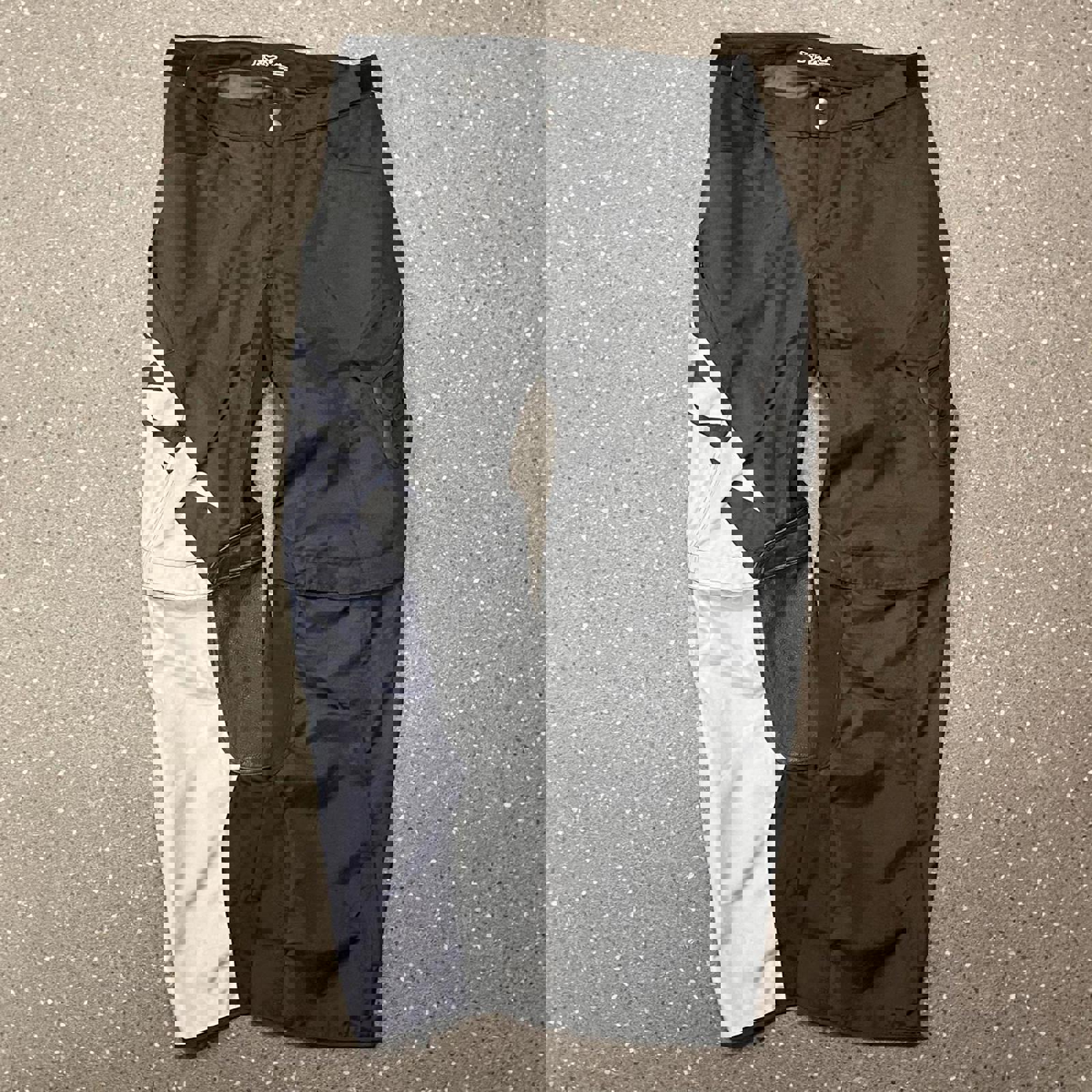 Black and grey/blue fox racing zip off pants with a fox spell out built into the colour blocking and a large rubber fox patch adjustable at waist and ankles