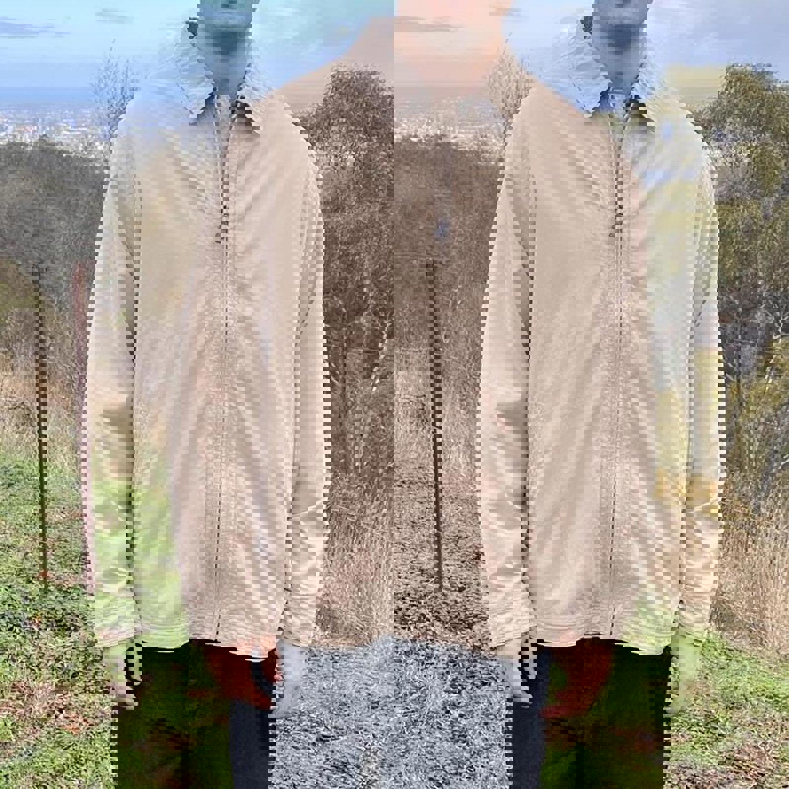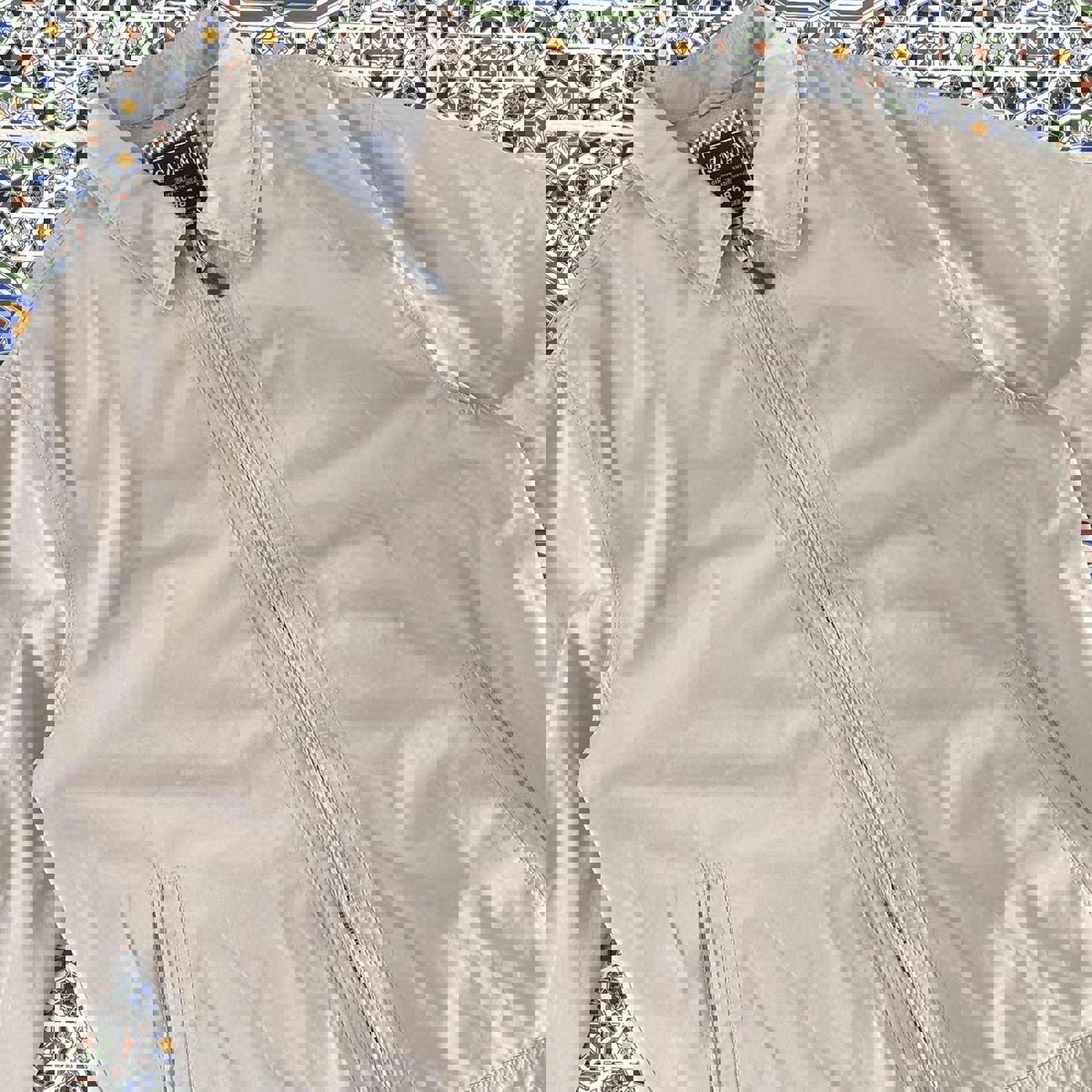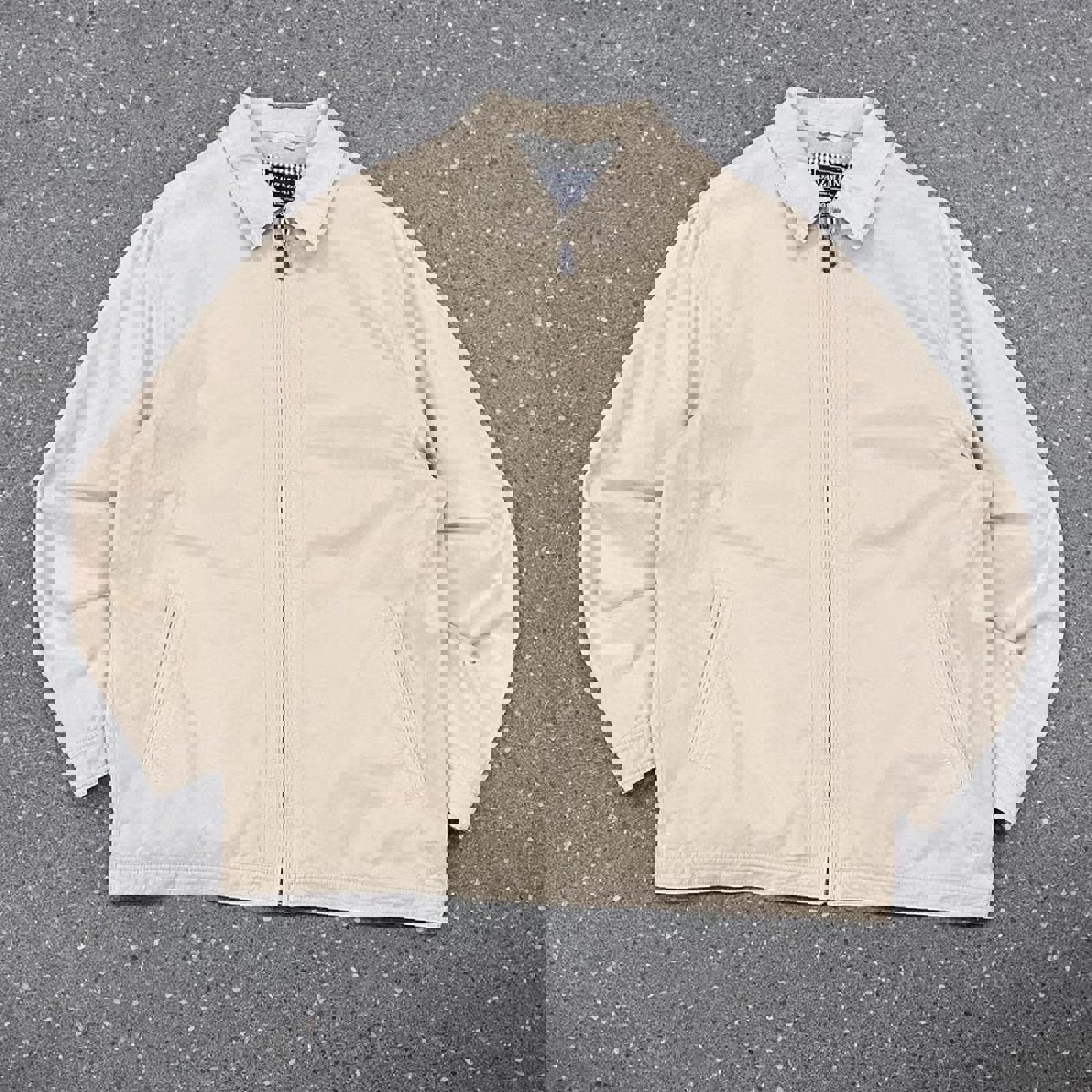Beige zip up Gazman coach jacket with a leather zip tab and adjustability at the waist