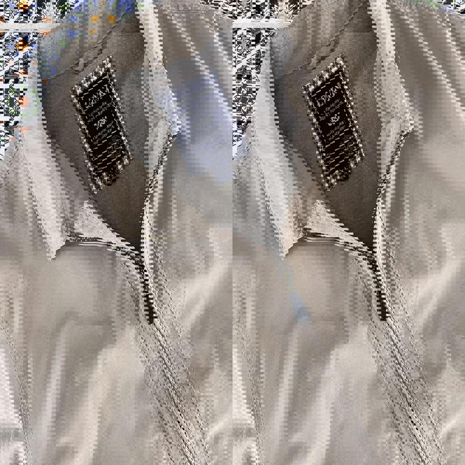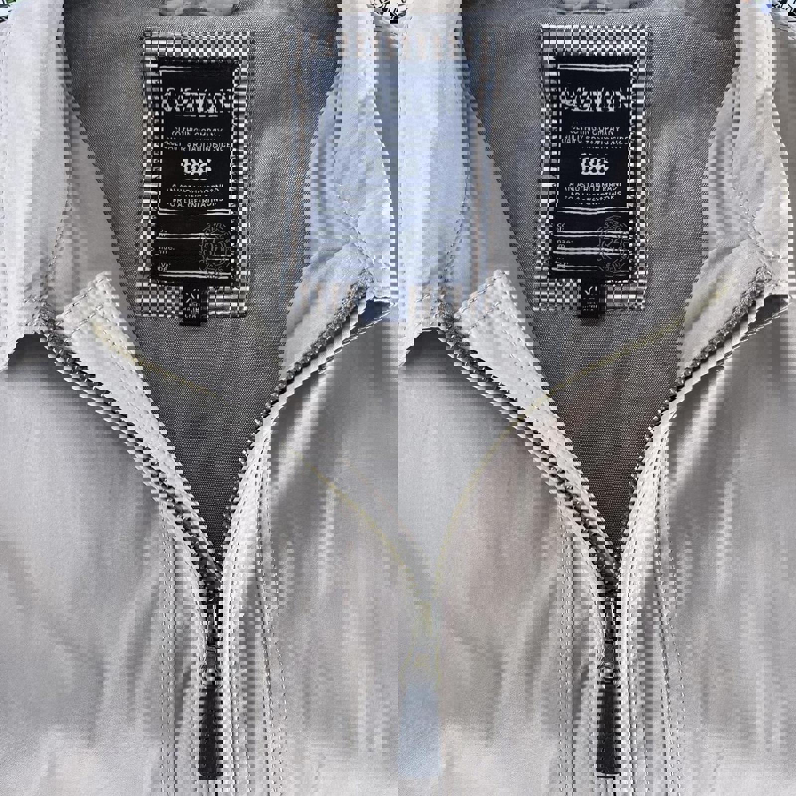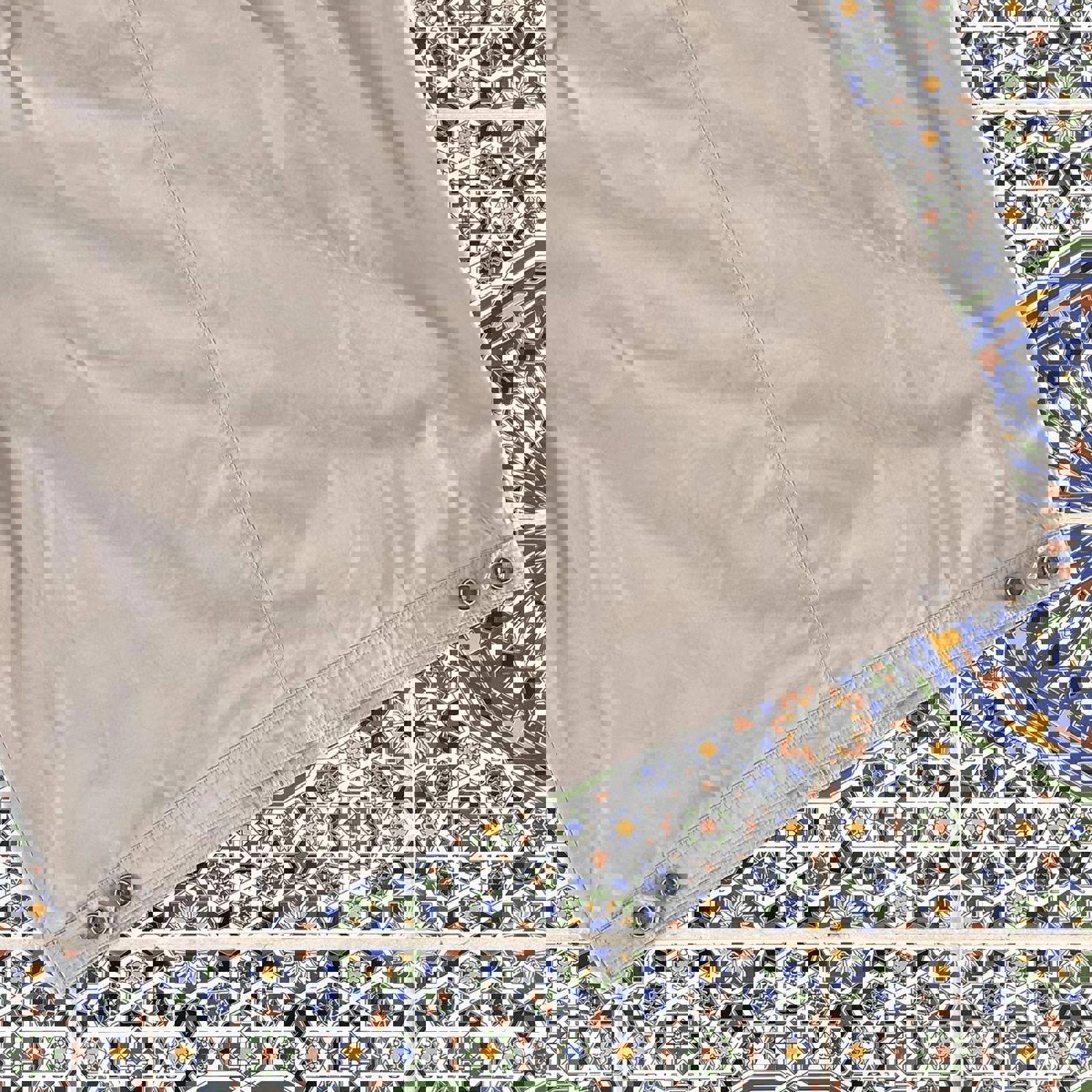 Beige zip up Gazman coach jacket with a leather zip tab and adjustability at the waist