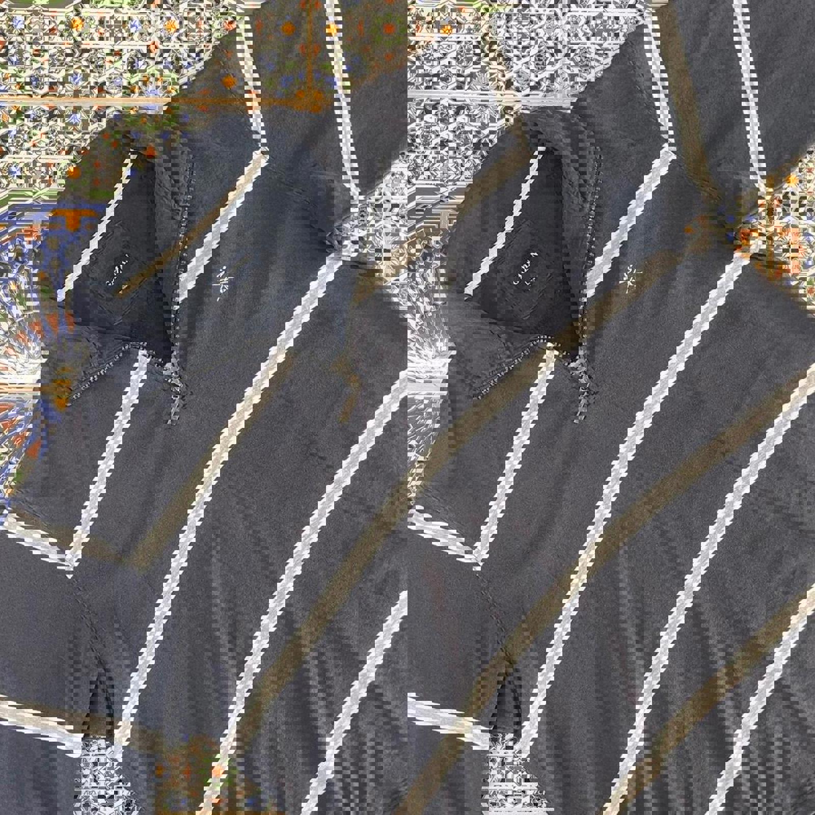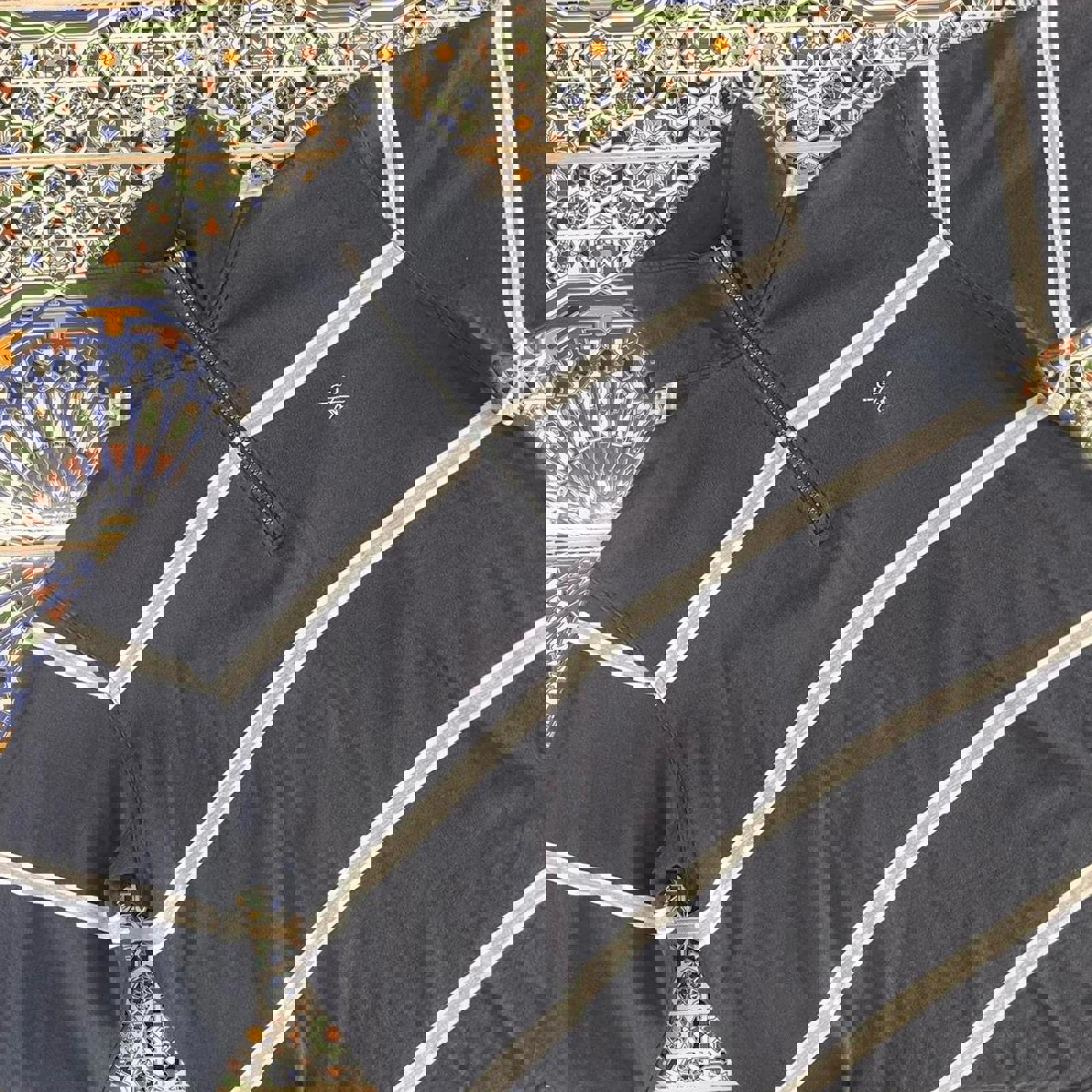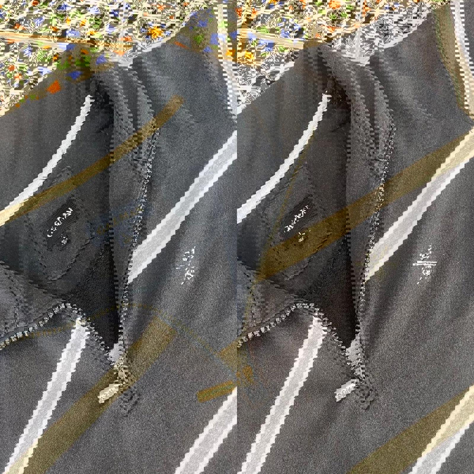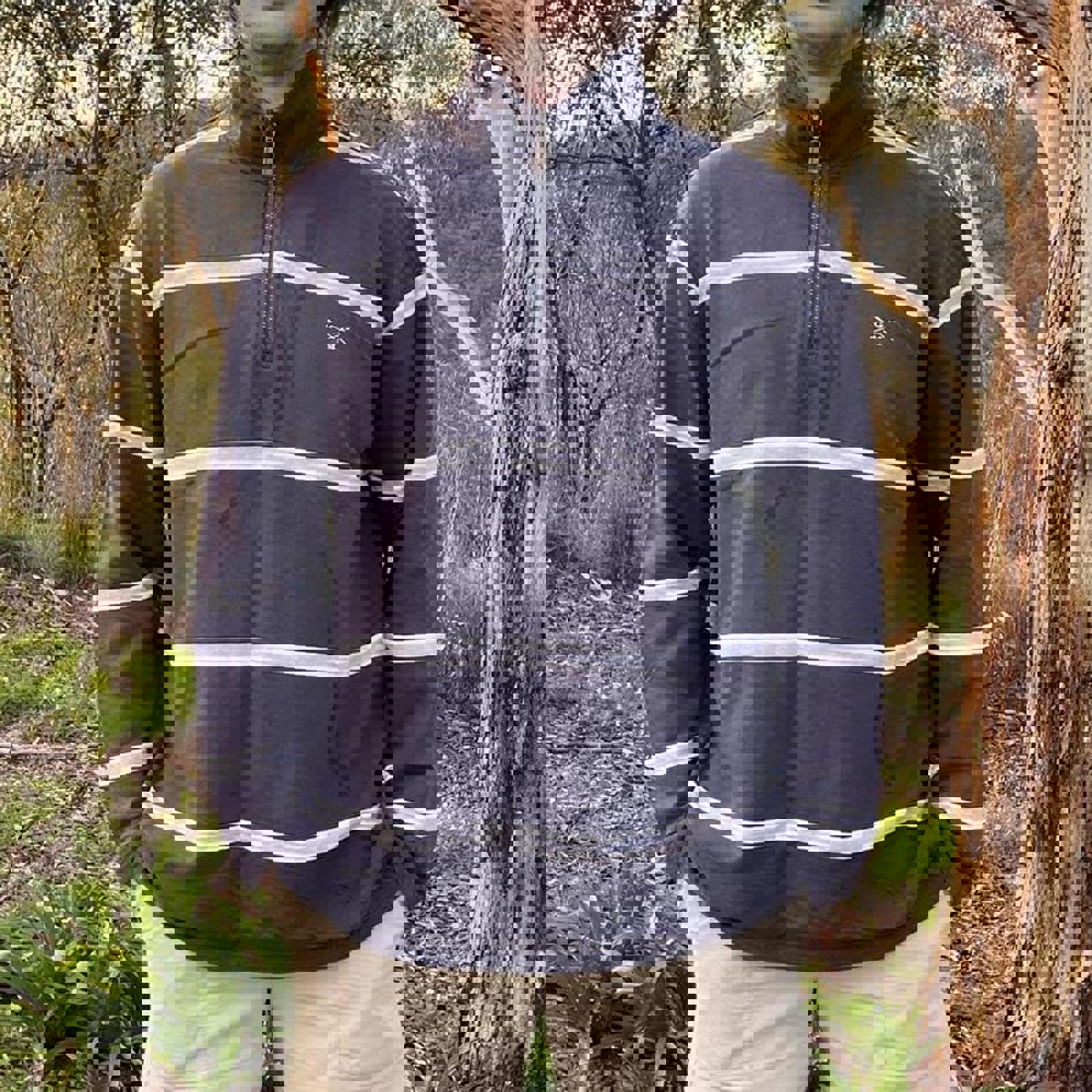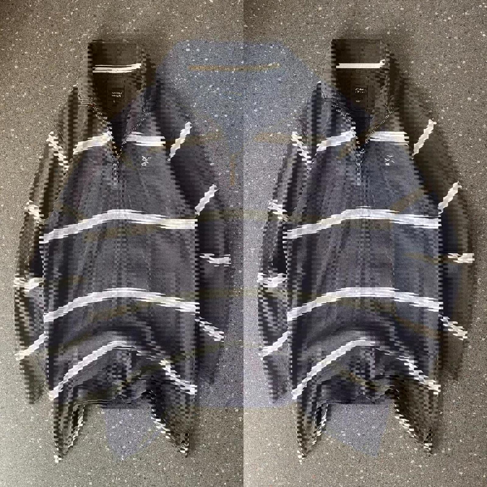 Navy, grey and white striped Gazman 1/4 zip jumper with an embroidered logo on the chest