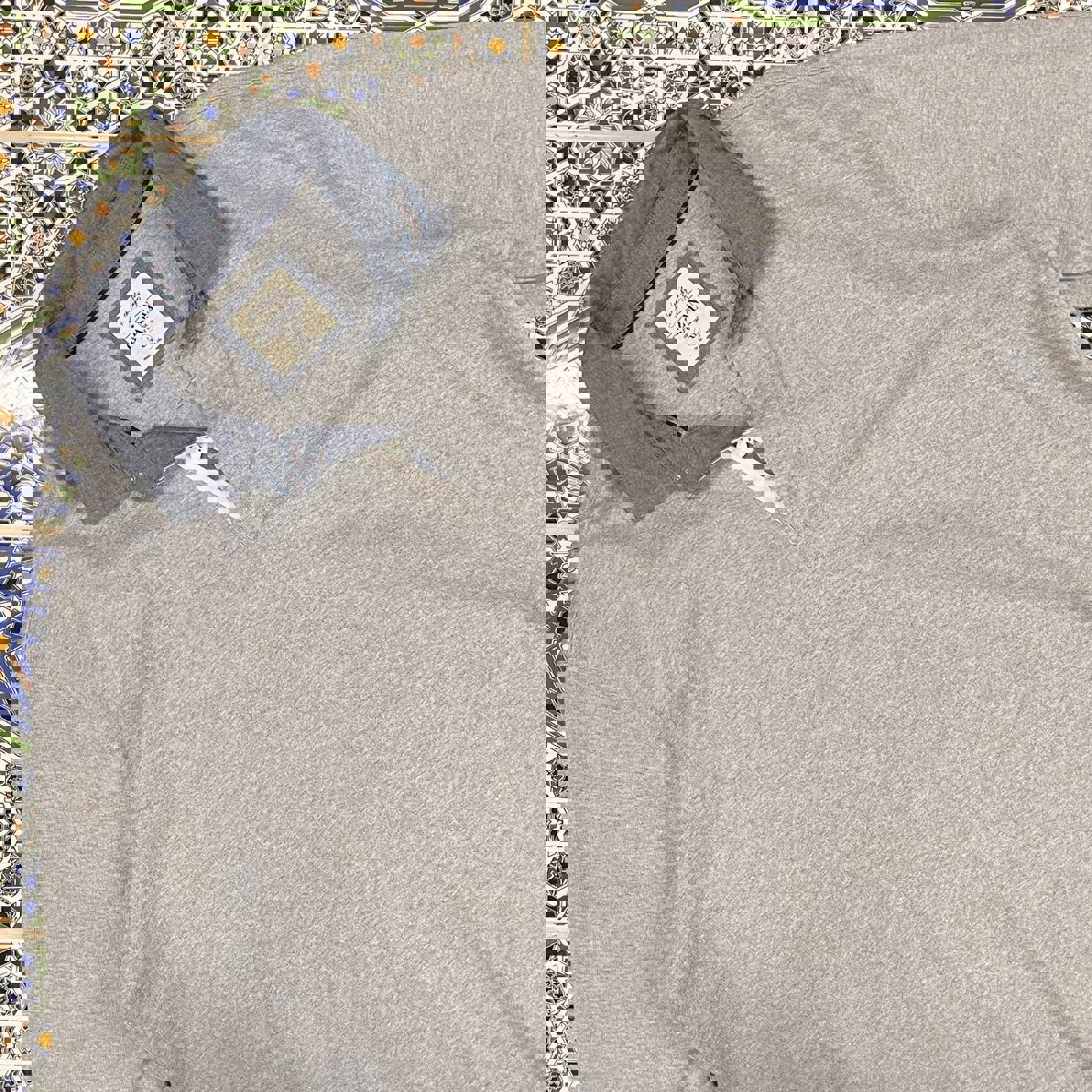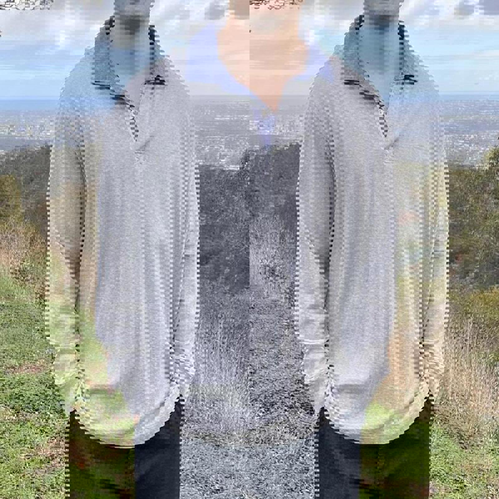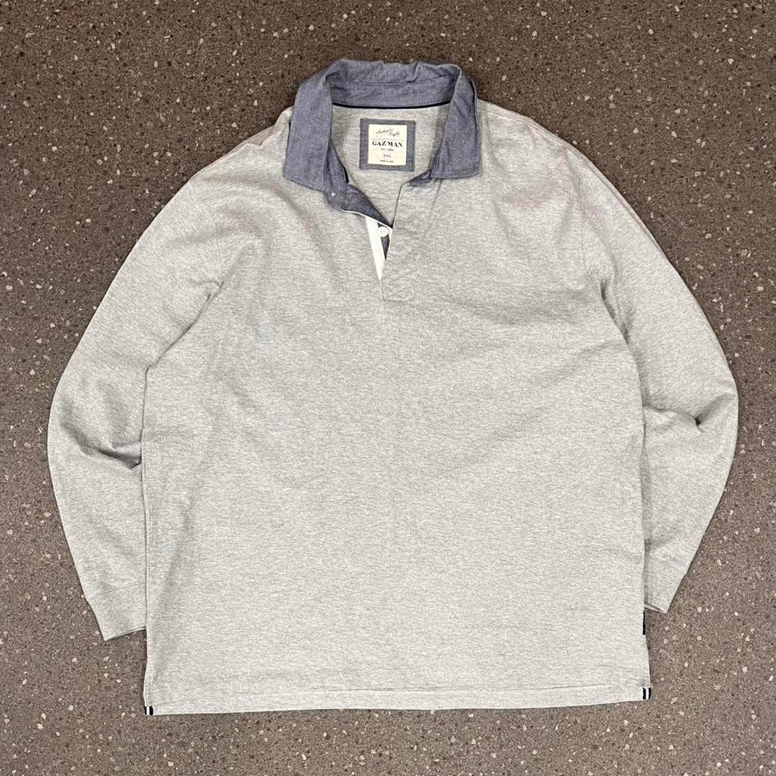 Grey Gazman long sleeve polo with a blue collar and patch on the hip
