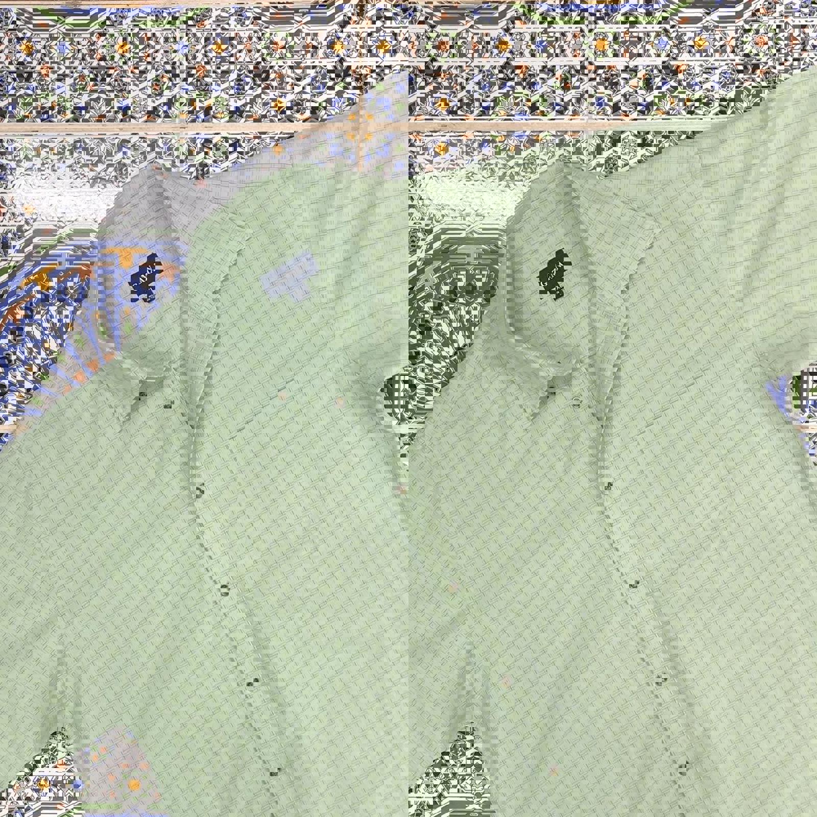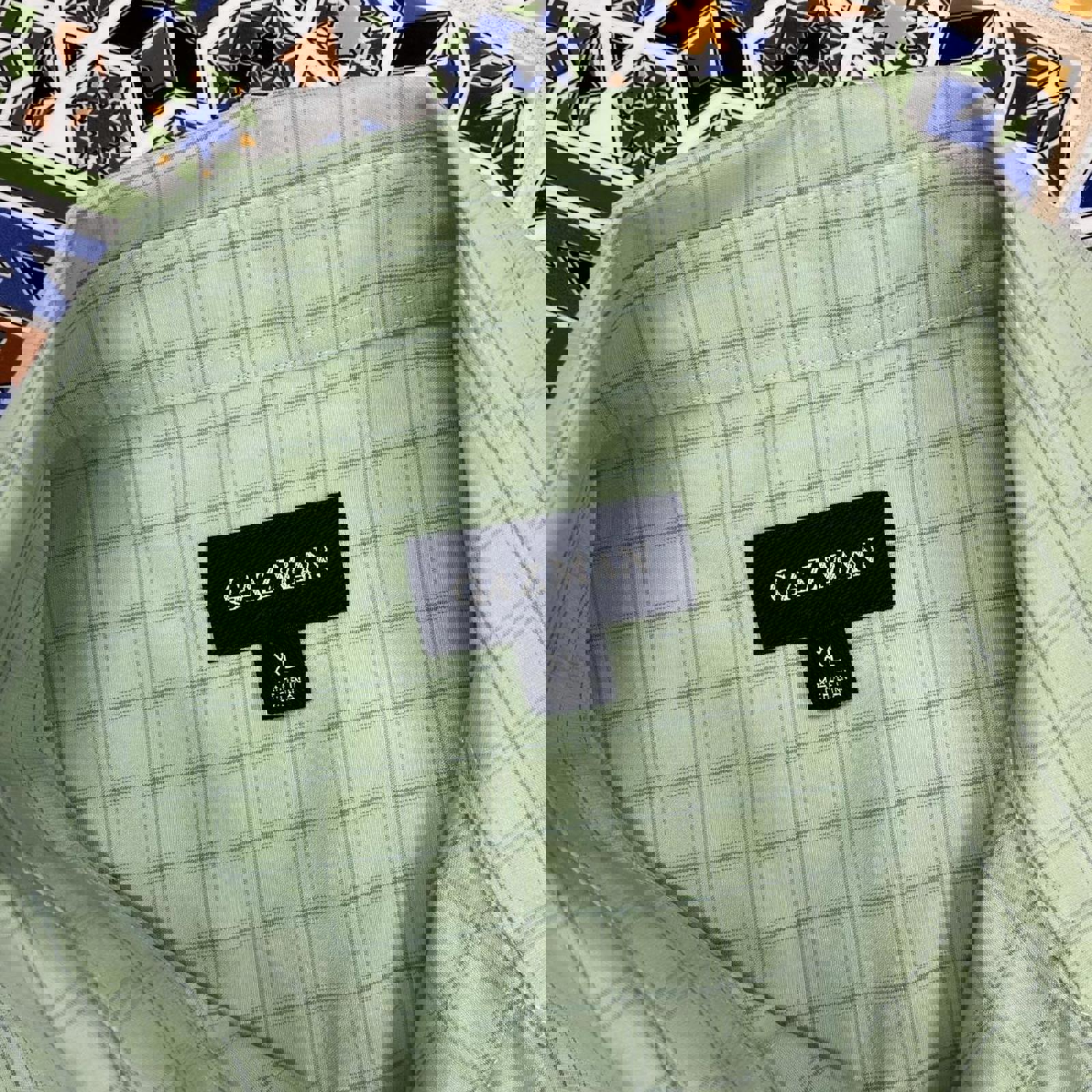 green checkered gazman short sleeved button up shirt with a gazman tab on the lower button line