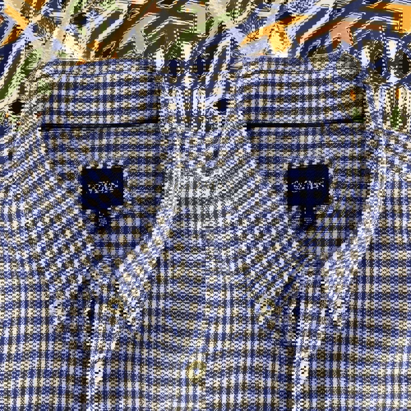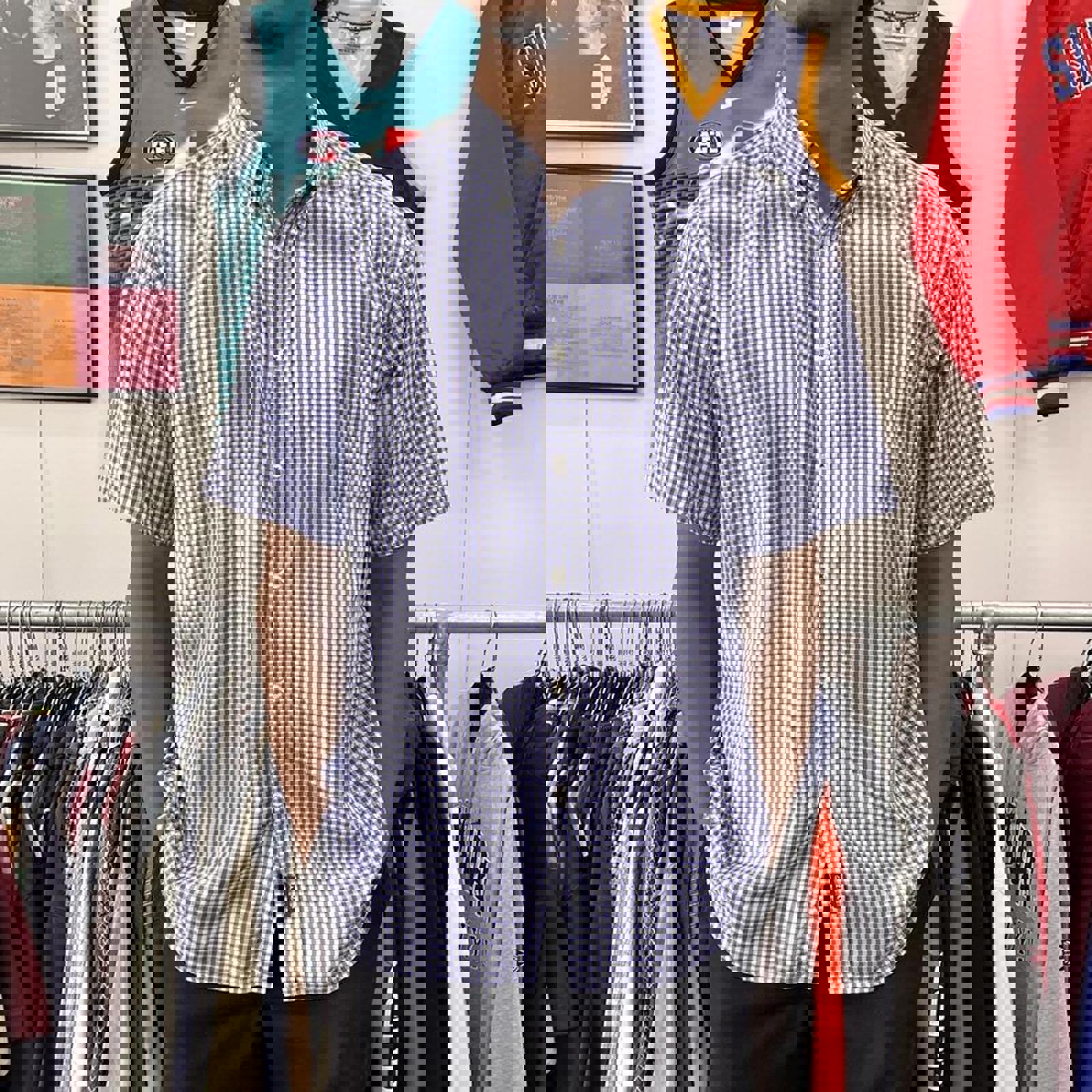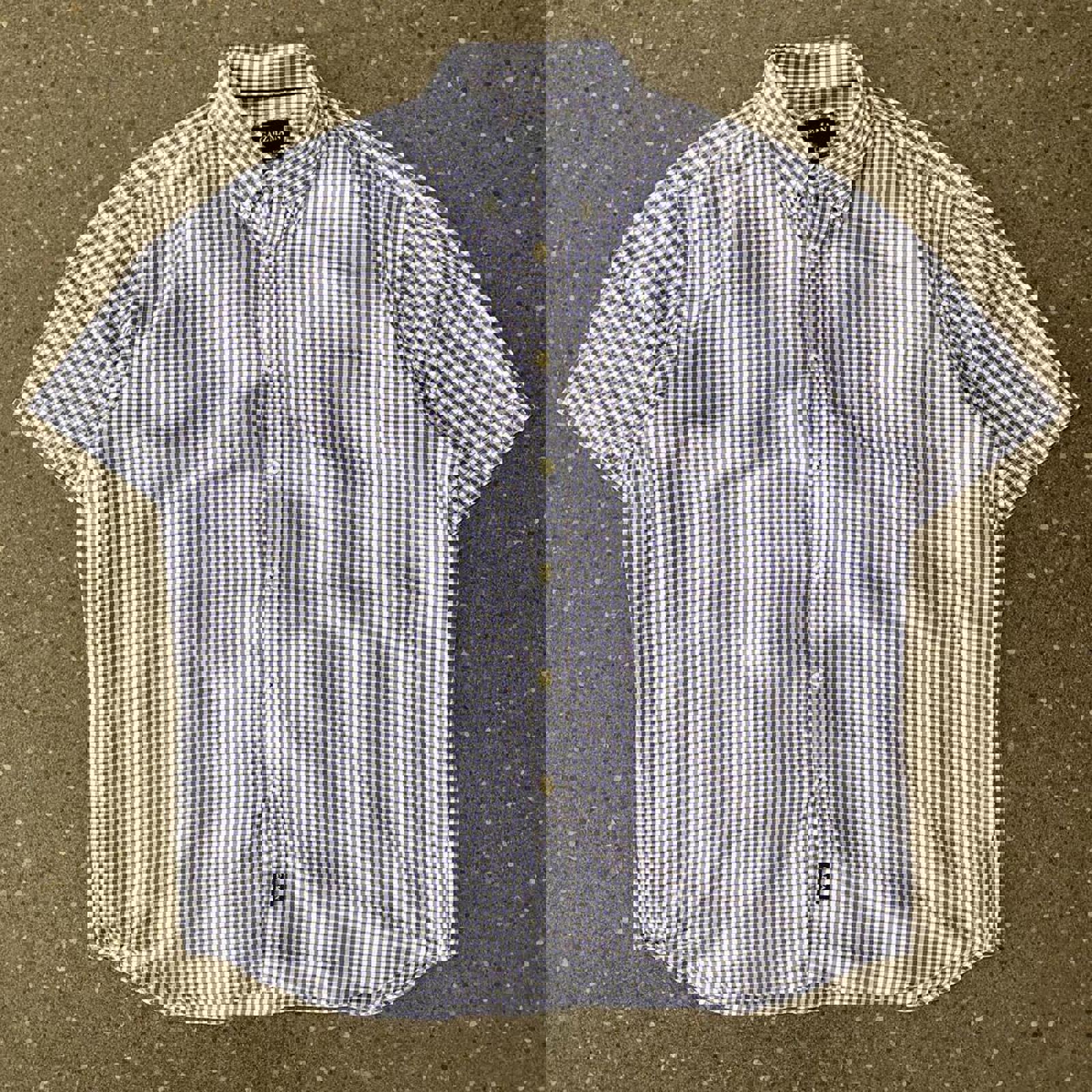blue and white checkered gazman short sleeved button up shirt with a patch on the crotch