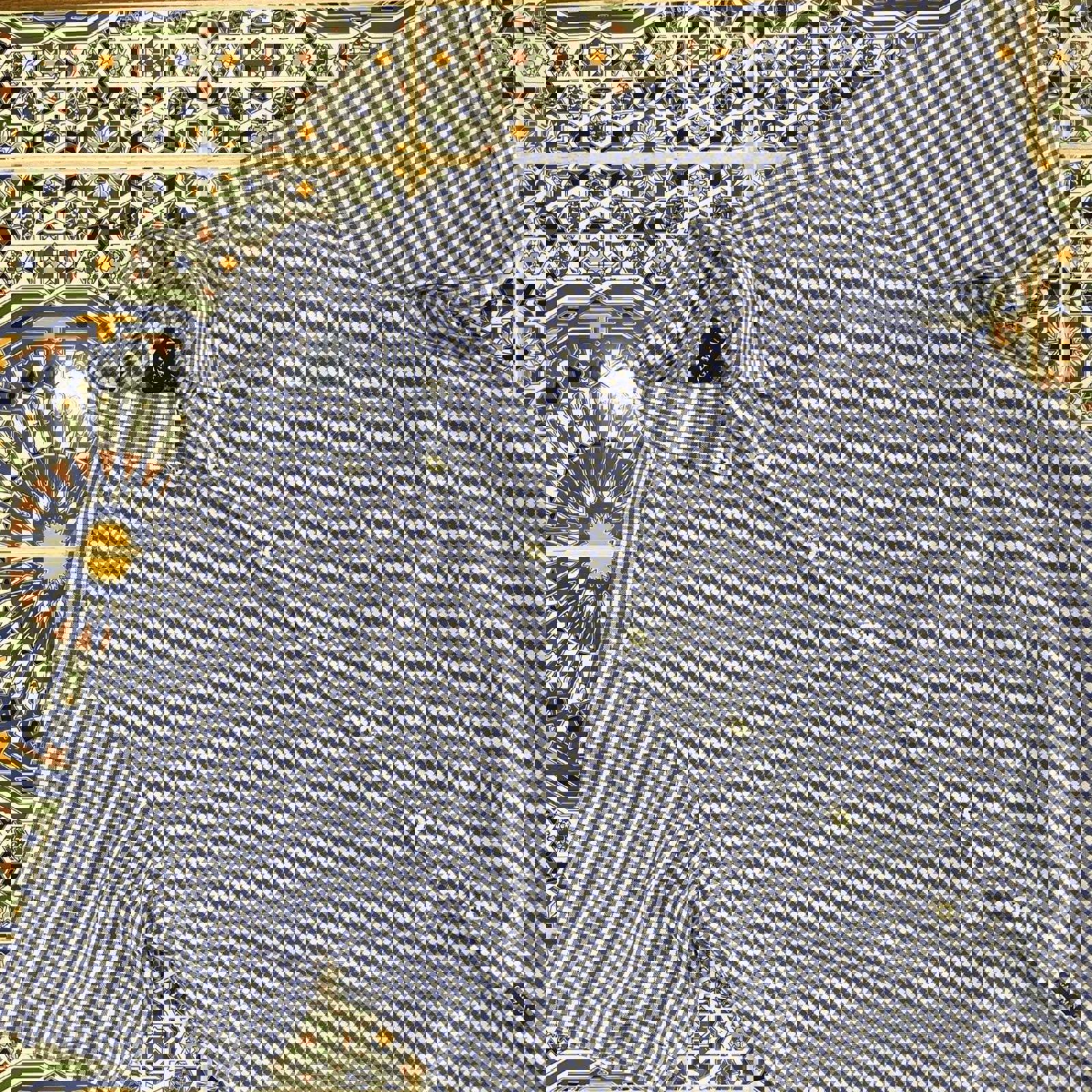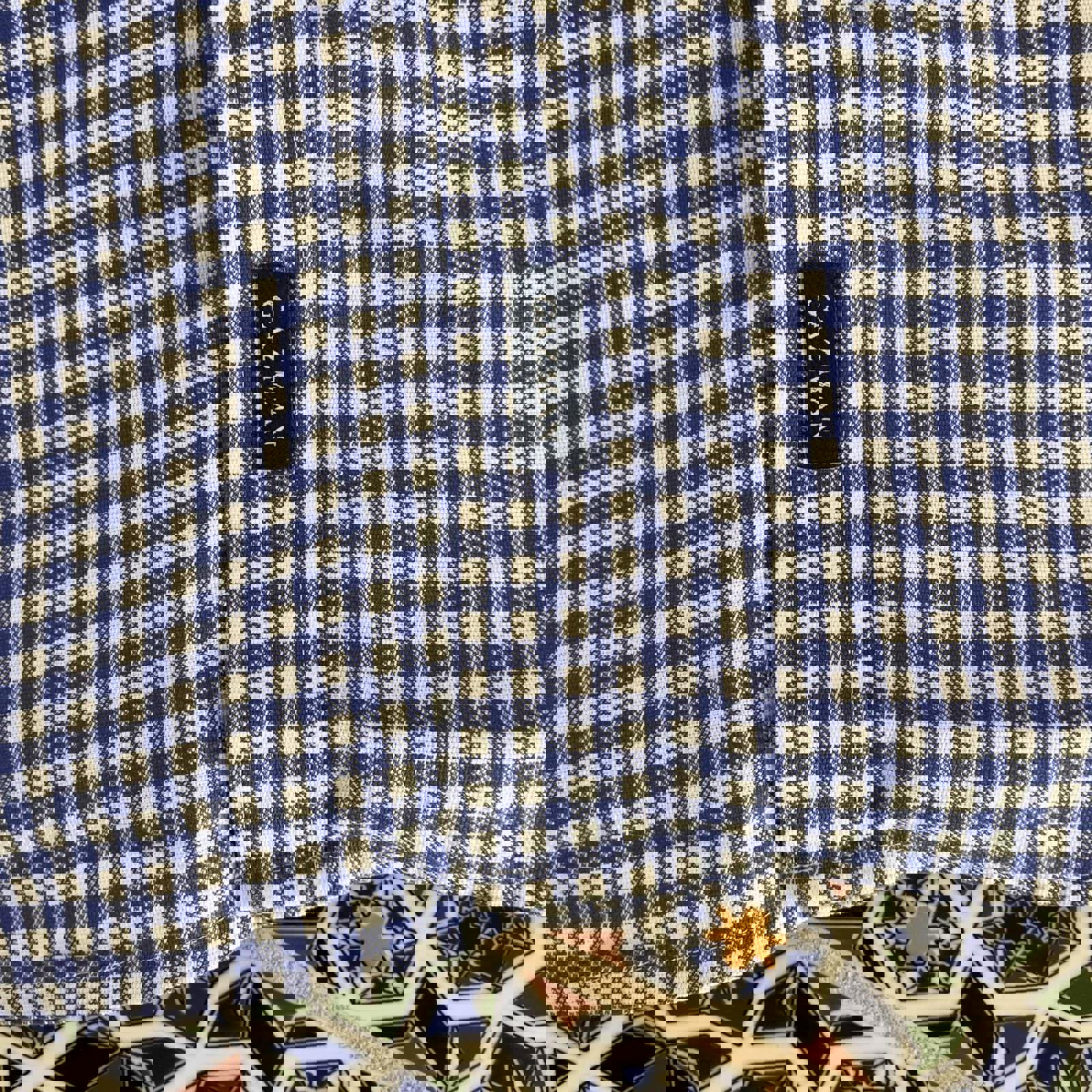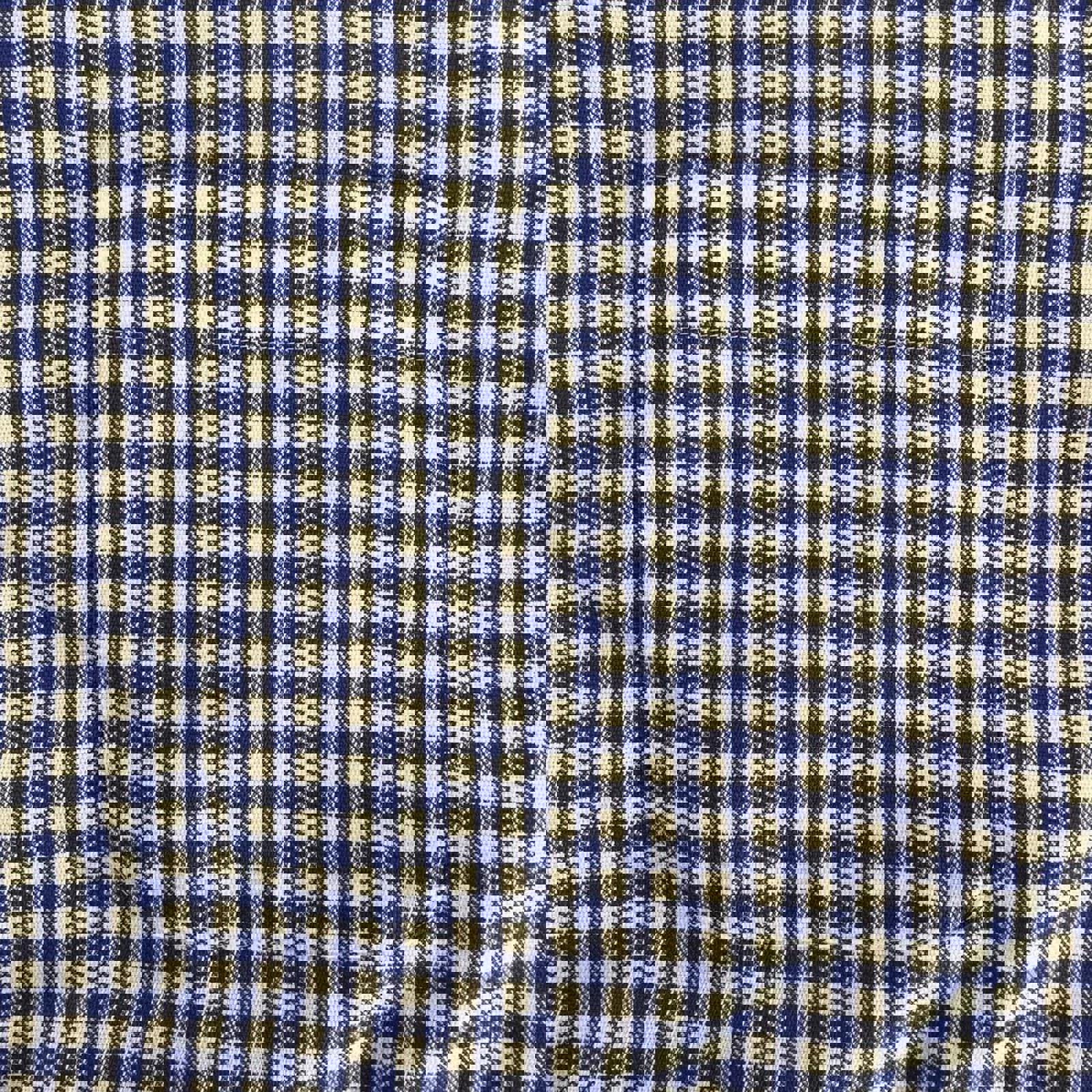 blue and white checkered gazman short sleeved button up shirt with a patch on the crotch