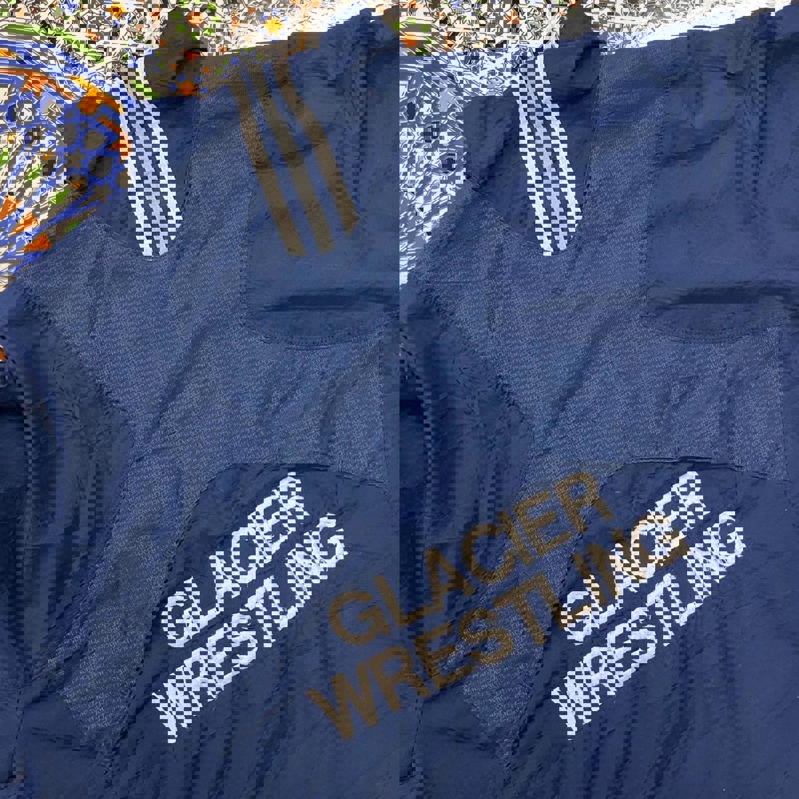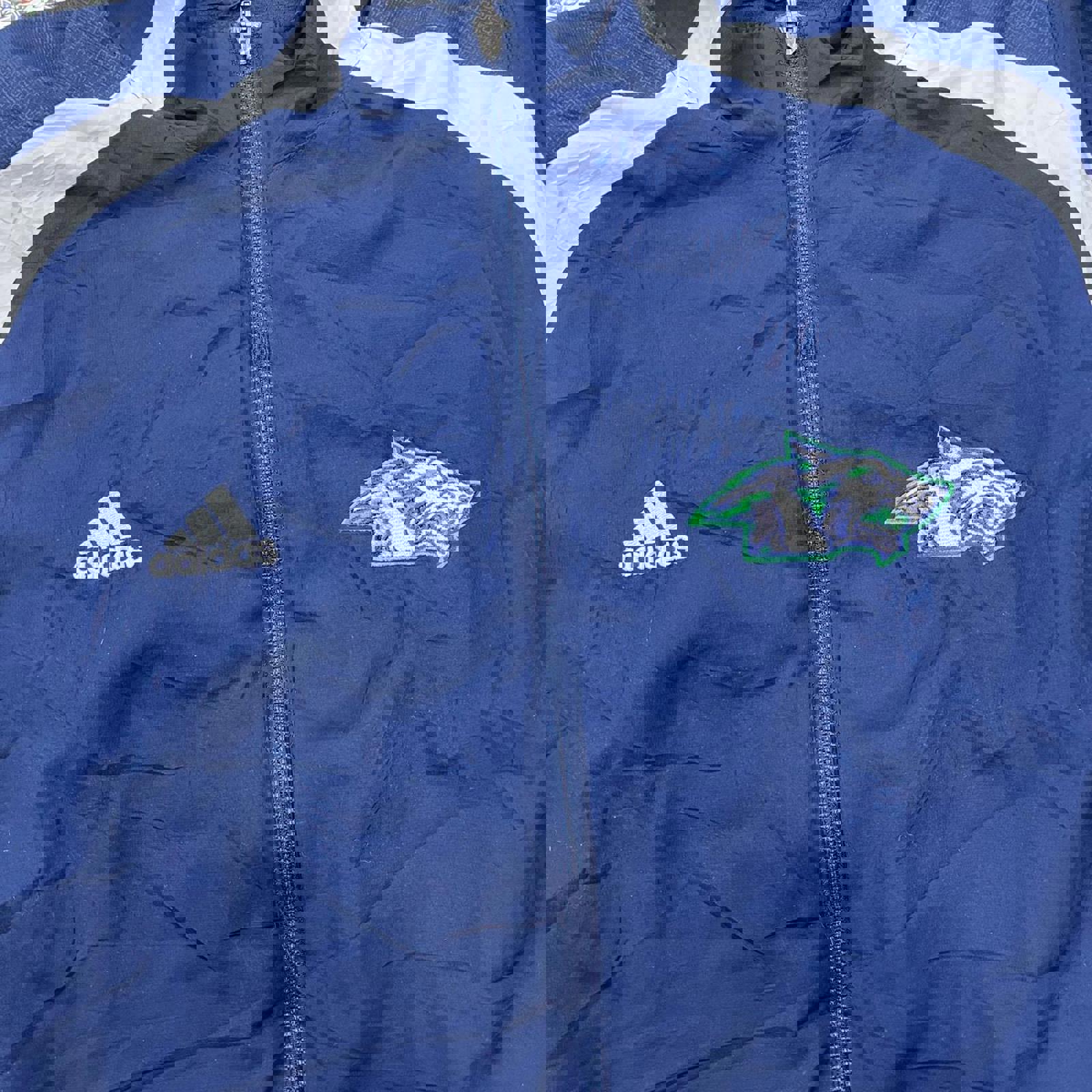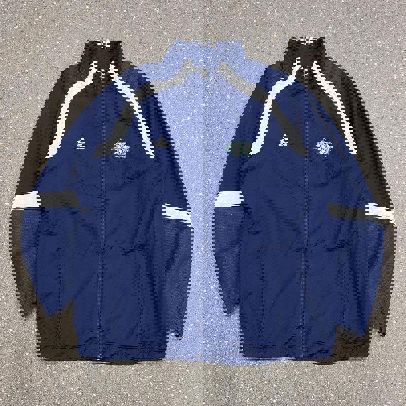navy and white adidas jacket, with all embroidered logos, large embroidered glacier wrestling on the back and 3 stripes on the back of the neck
