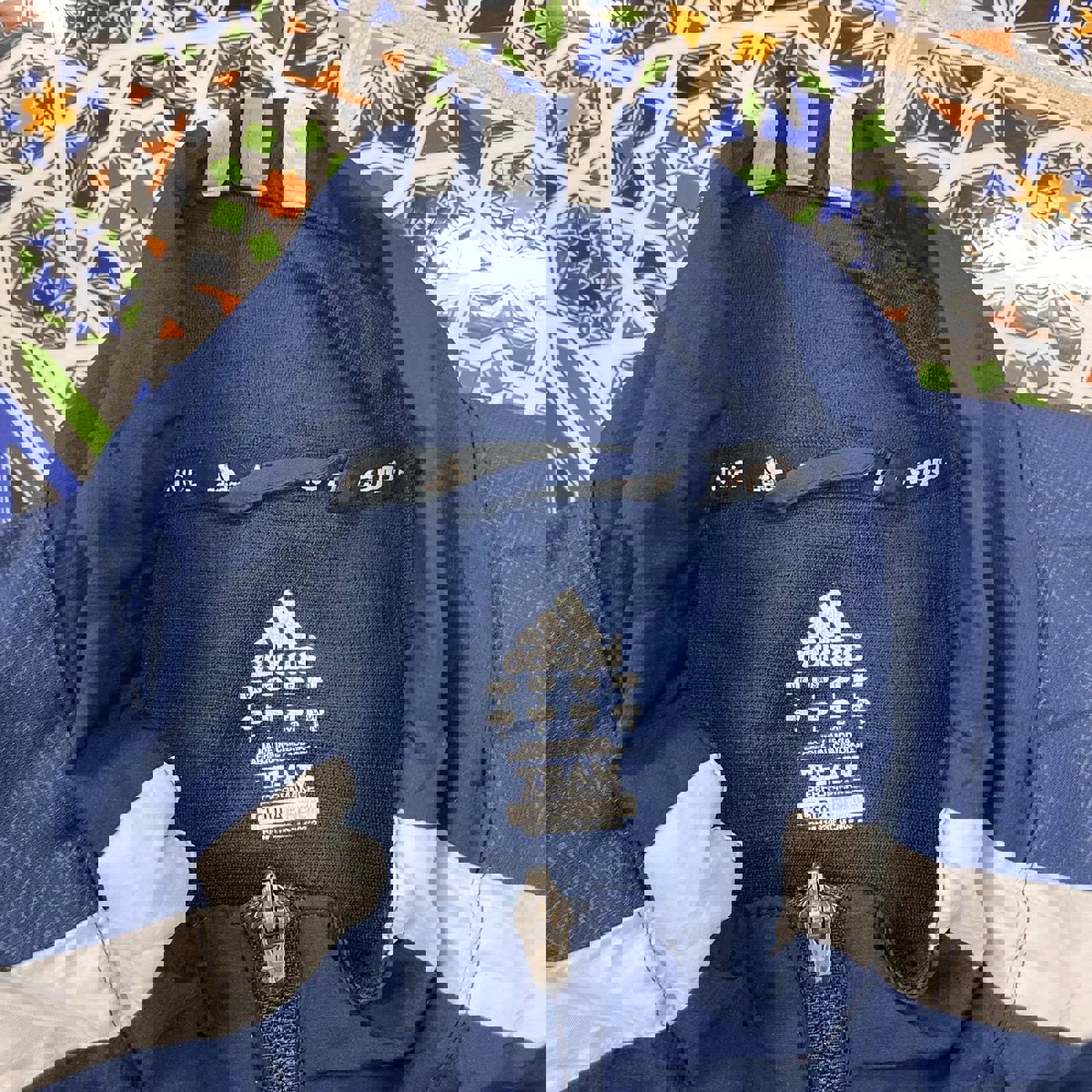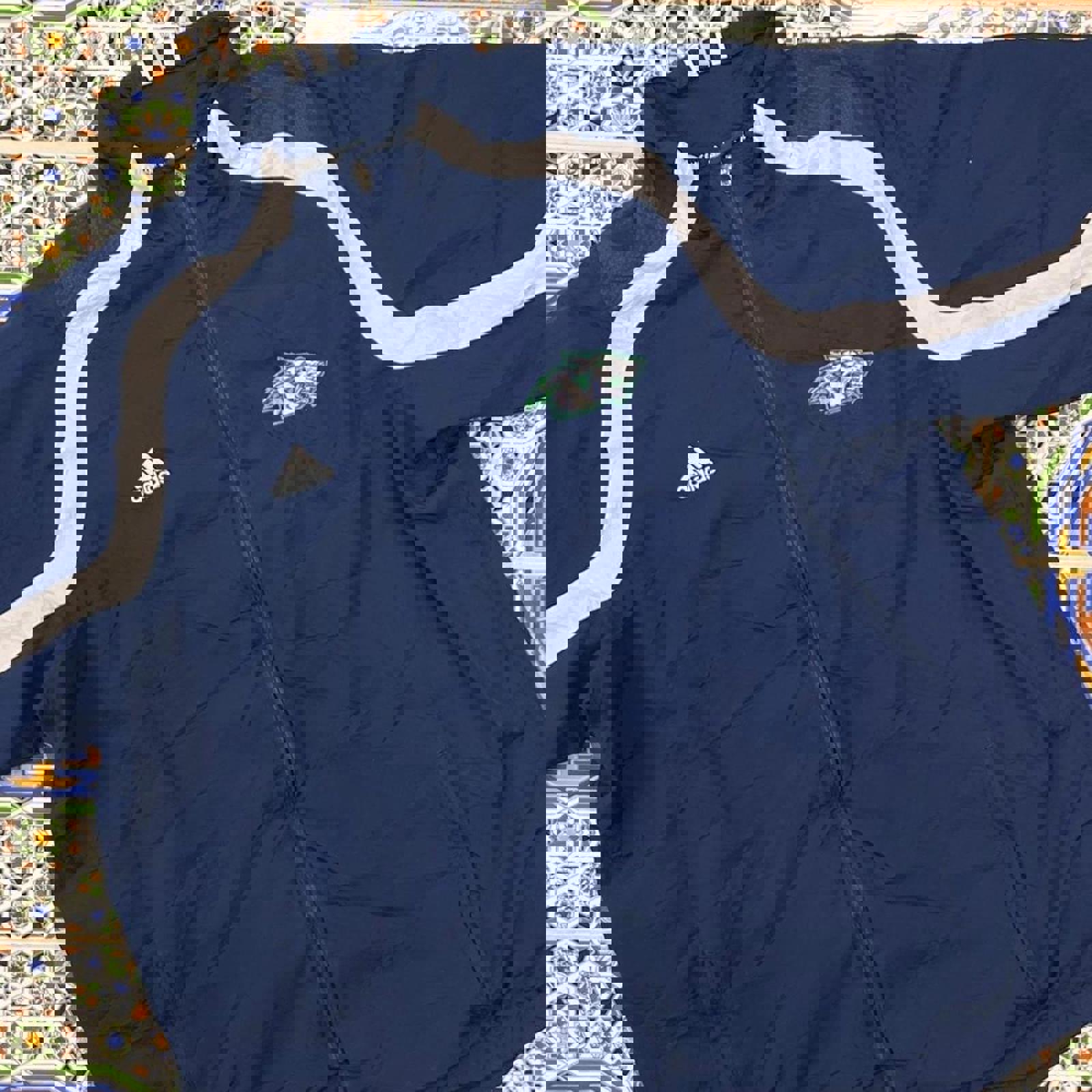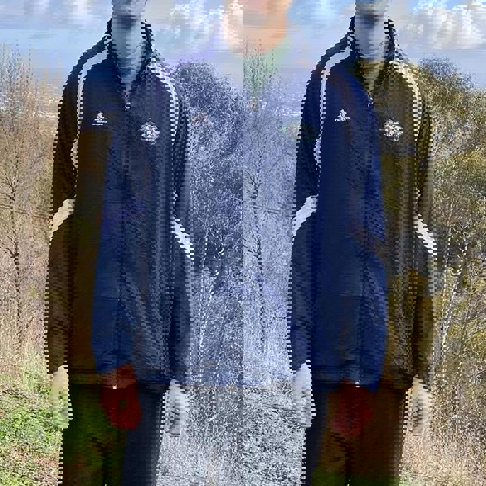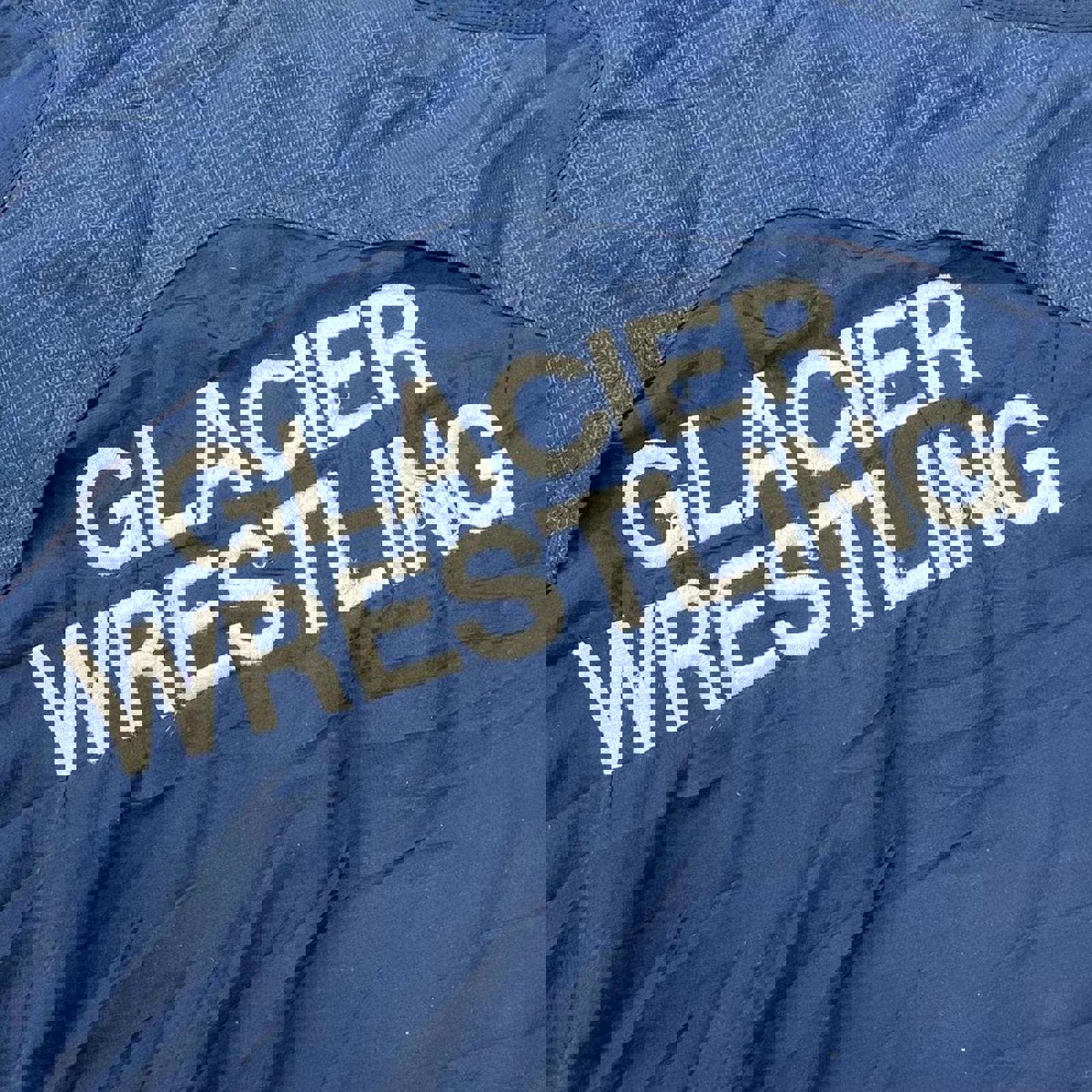 navy and white adidas jacket, with all embroidered logos, large embroidered glacier wrestling on the back and 3 stripes on the back of the neck