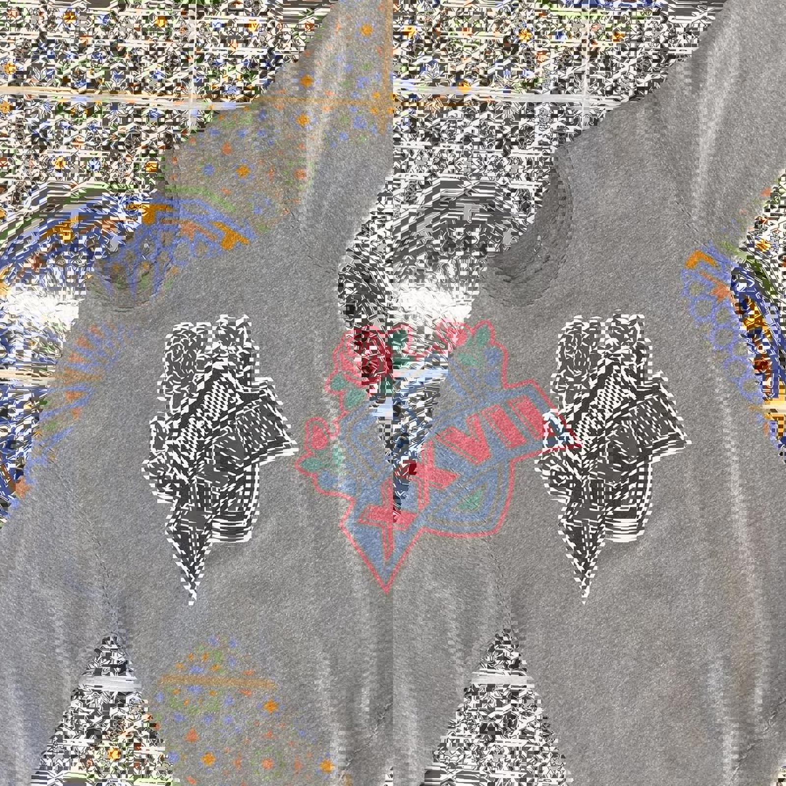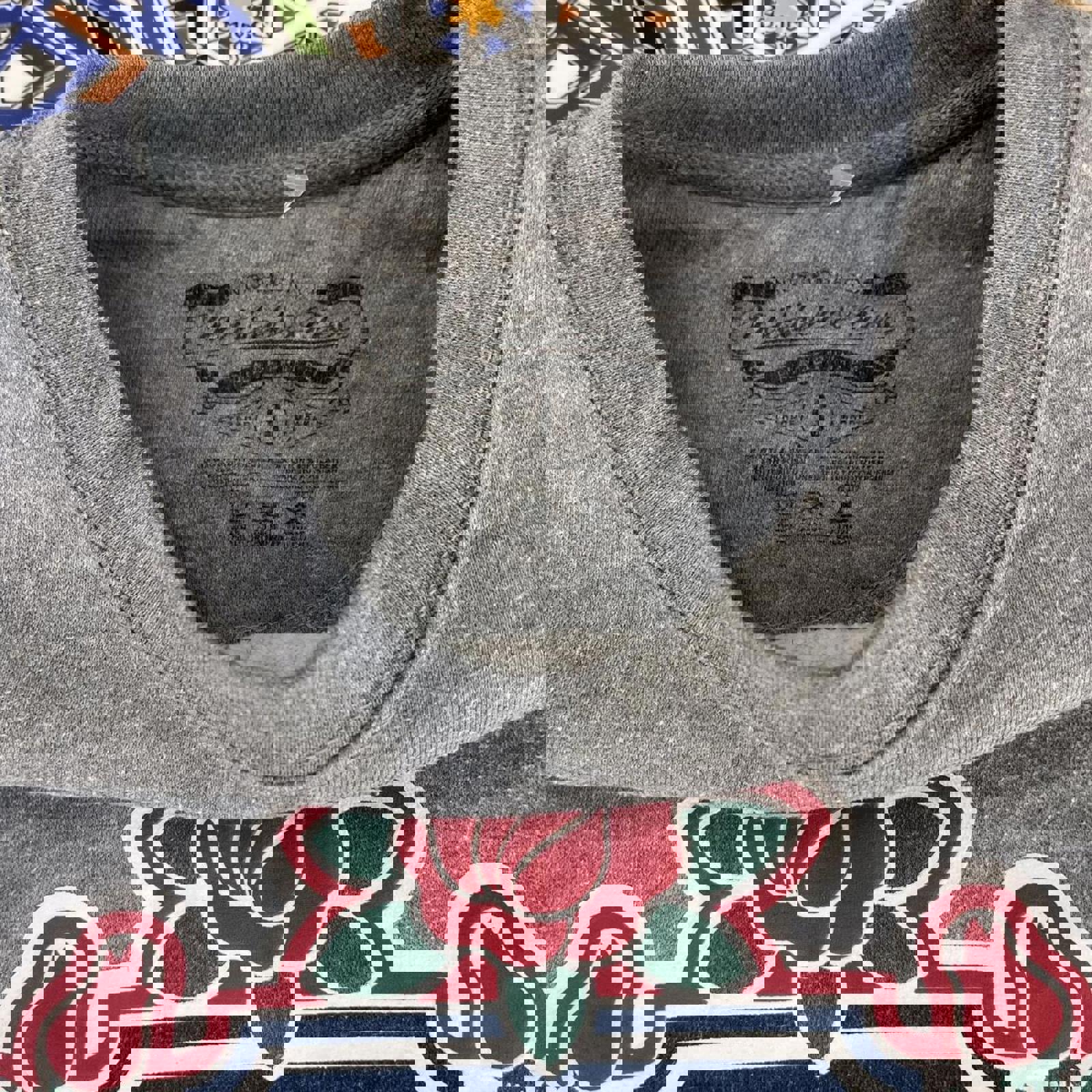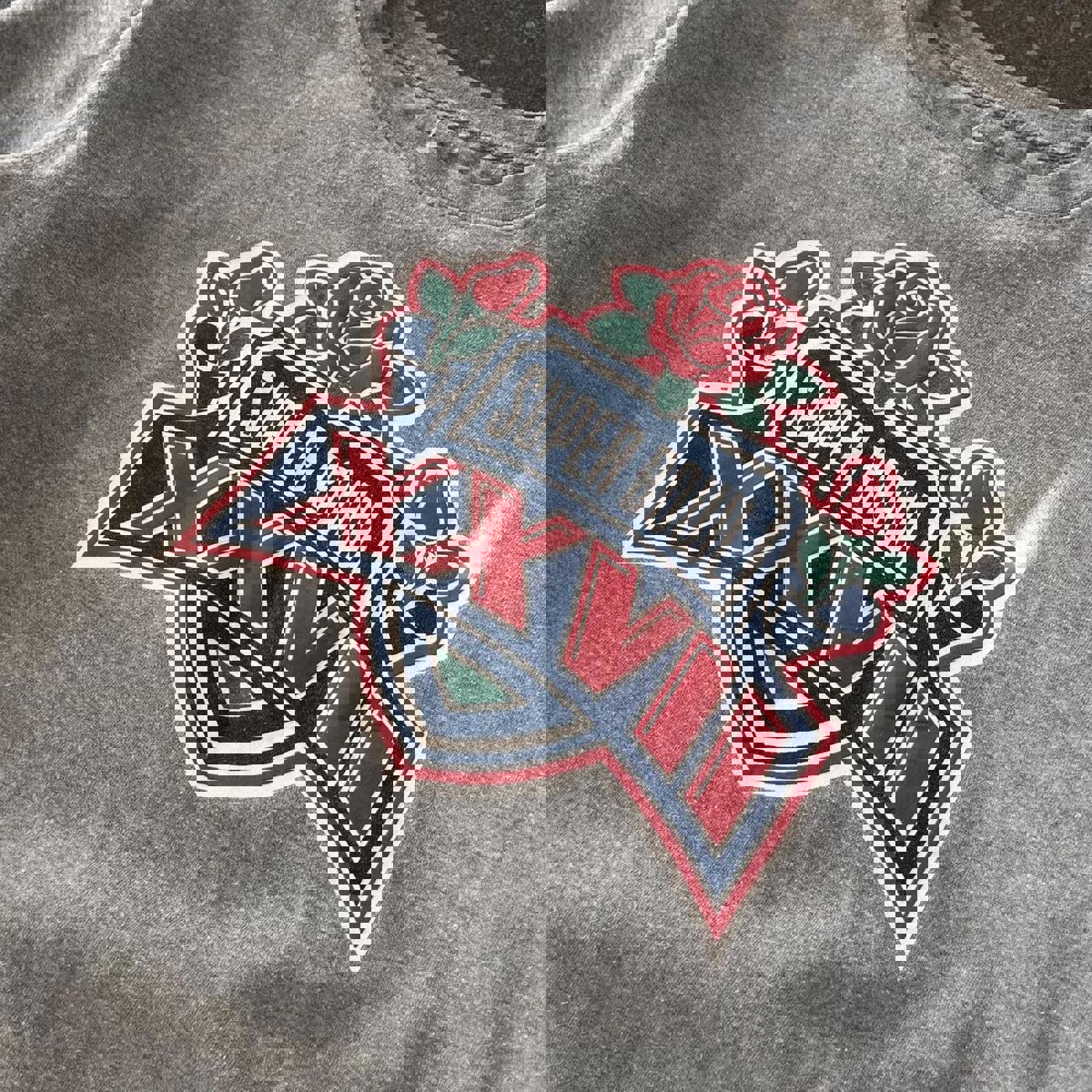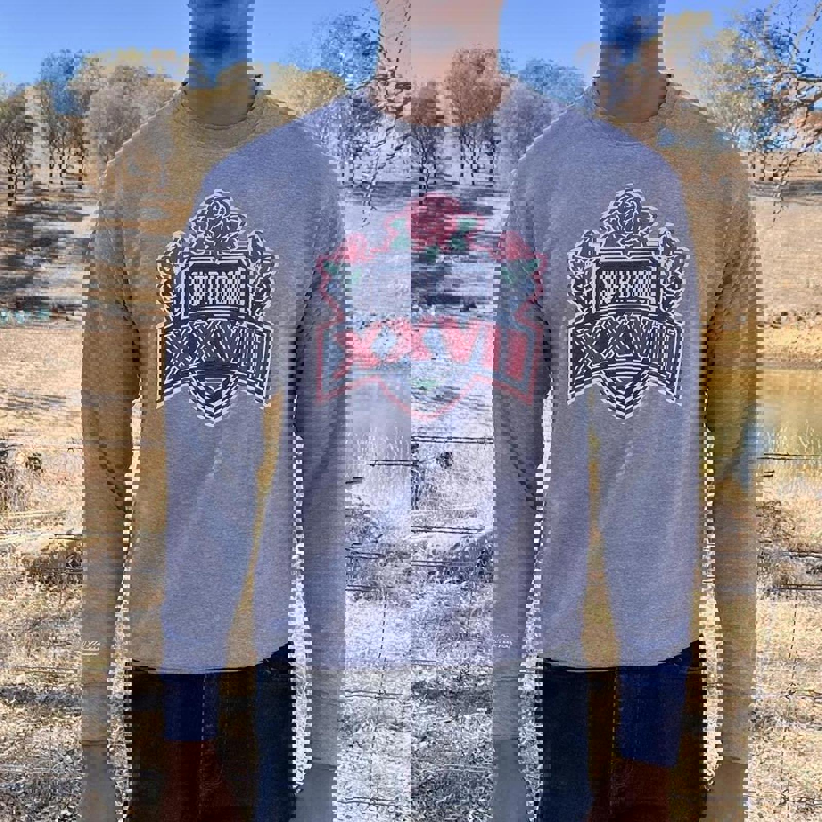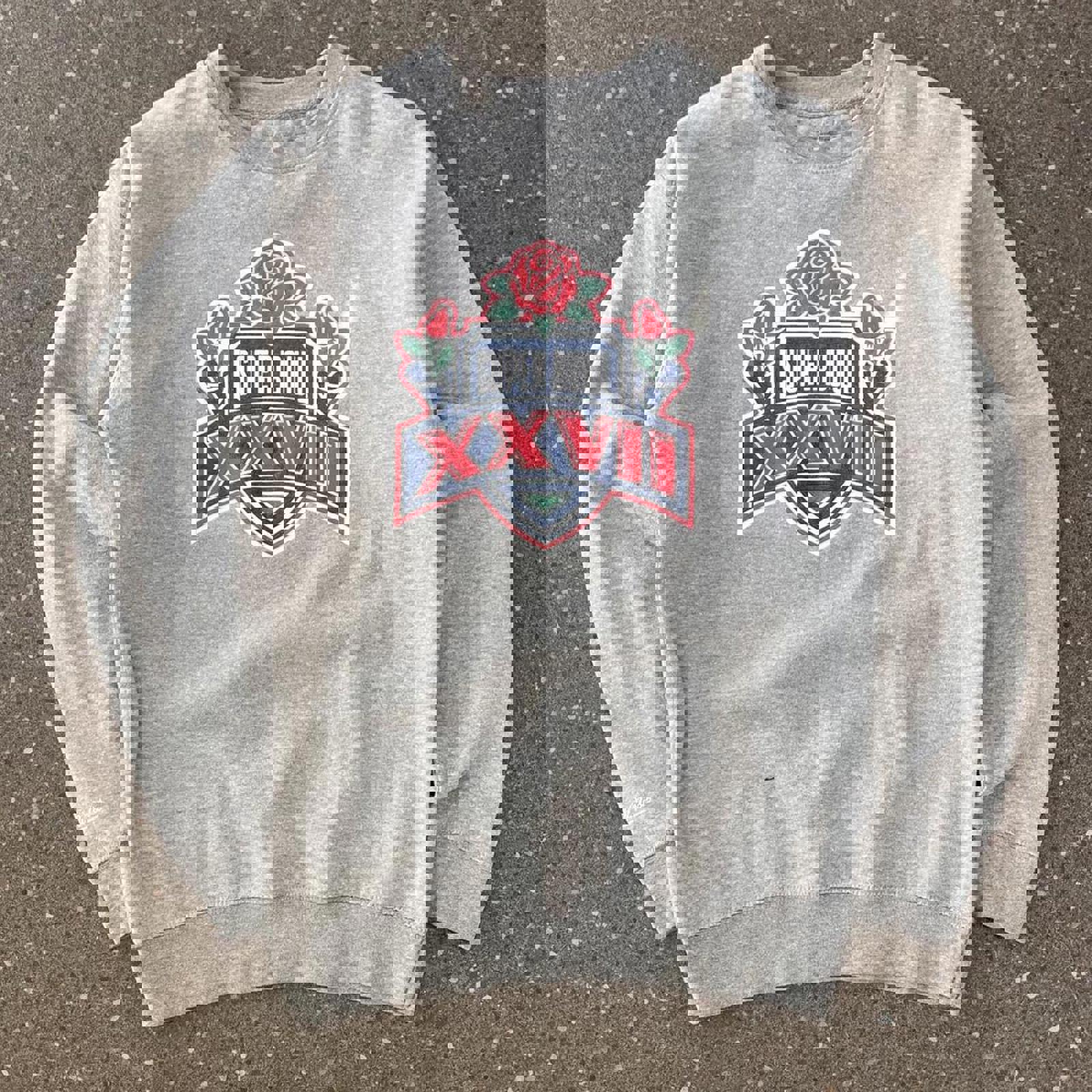 grey mitchell and ness jumper with a large throwback 1992/93 super bowl 27 graphic on the front
