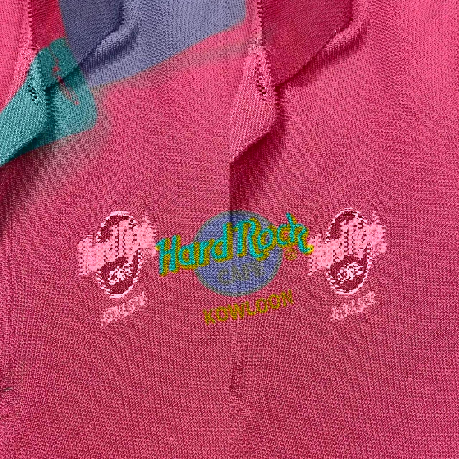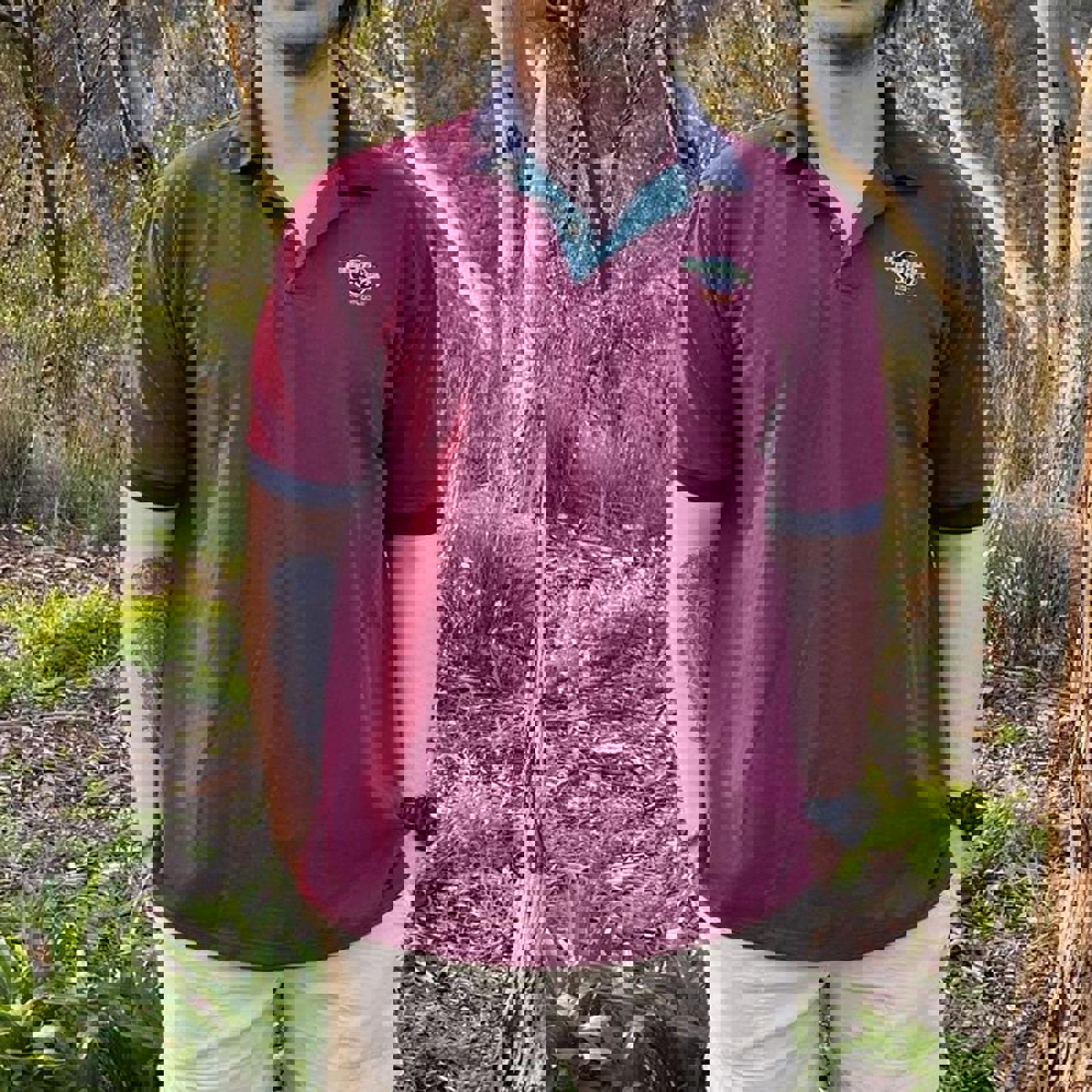 maroon and navy hard rock polo shirt with a colourful embroidered polo on the chest