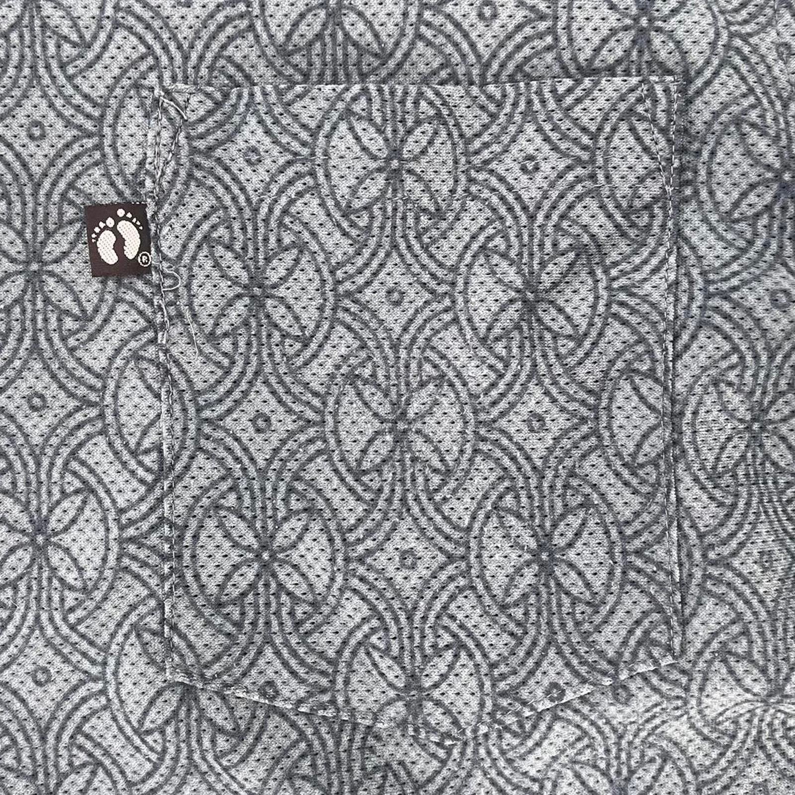 Turquoise blue and white hang ten Hawaiian short sleeved button up shirt with a pattern all over and a flower strip around the waist
