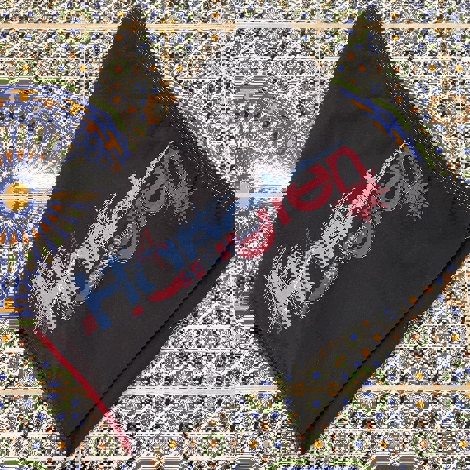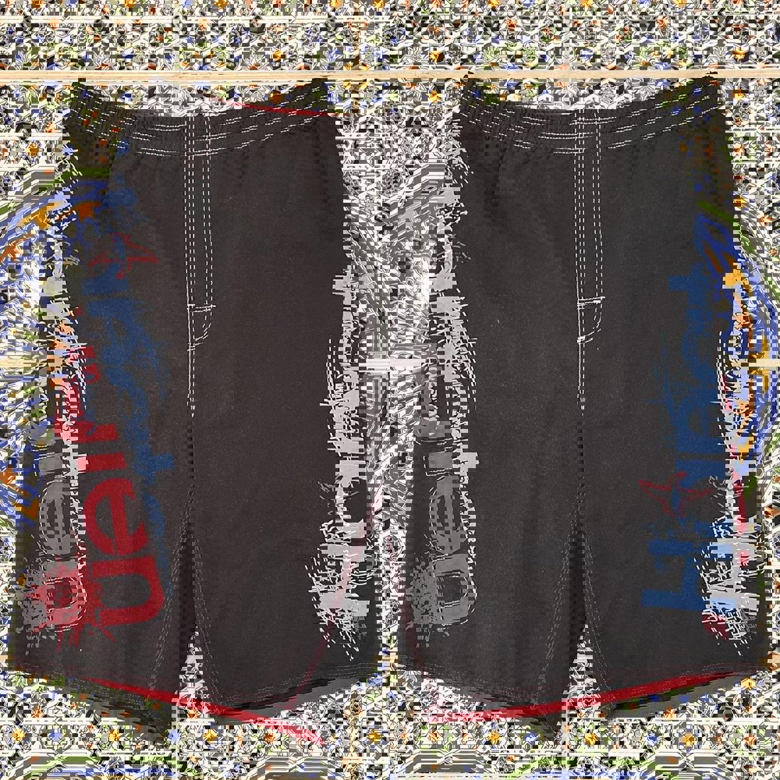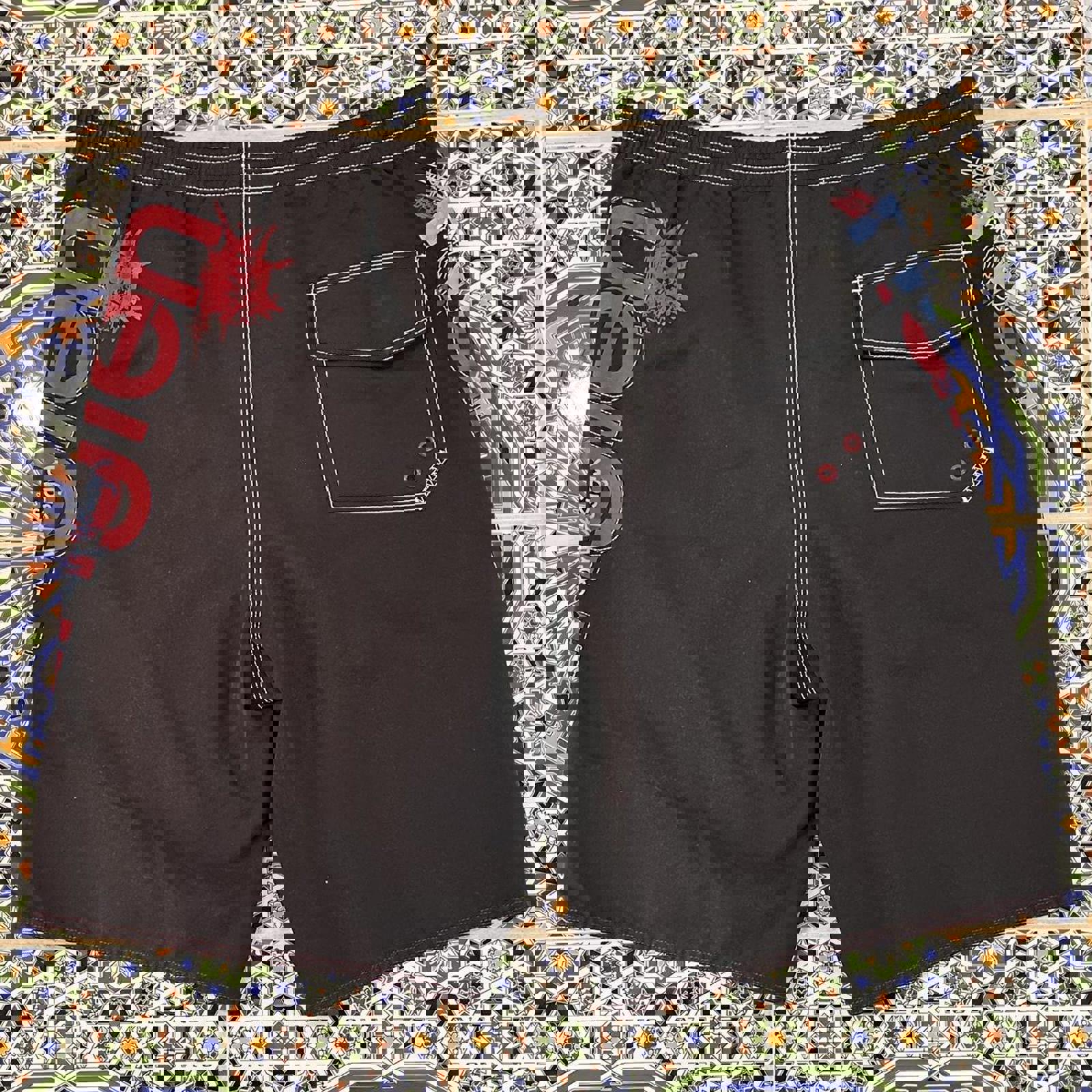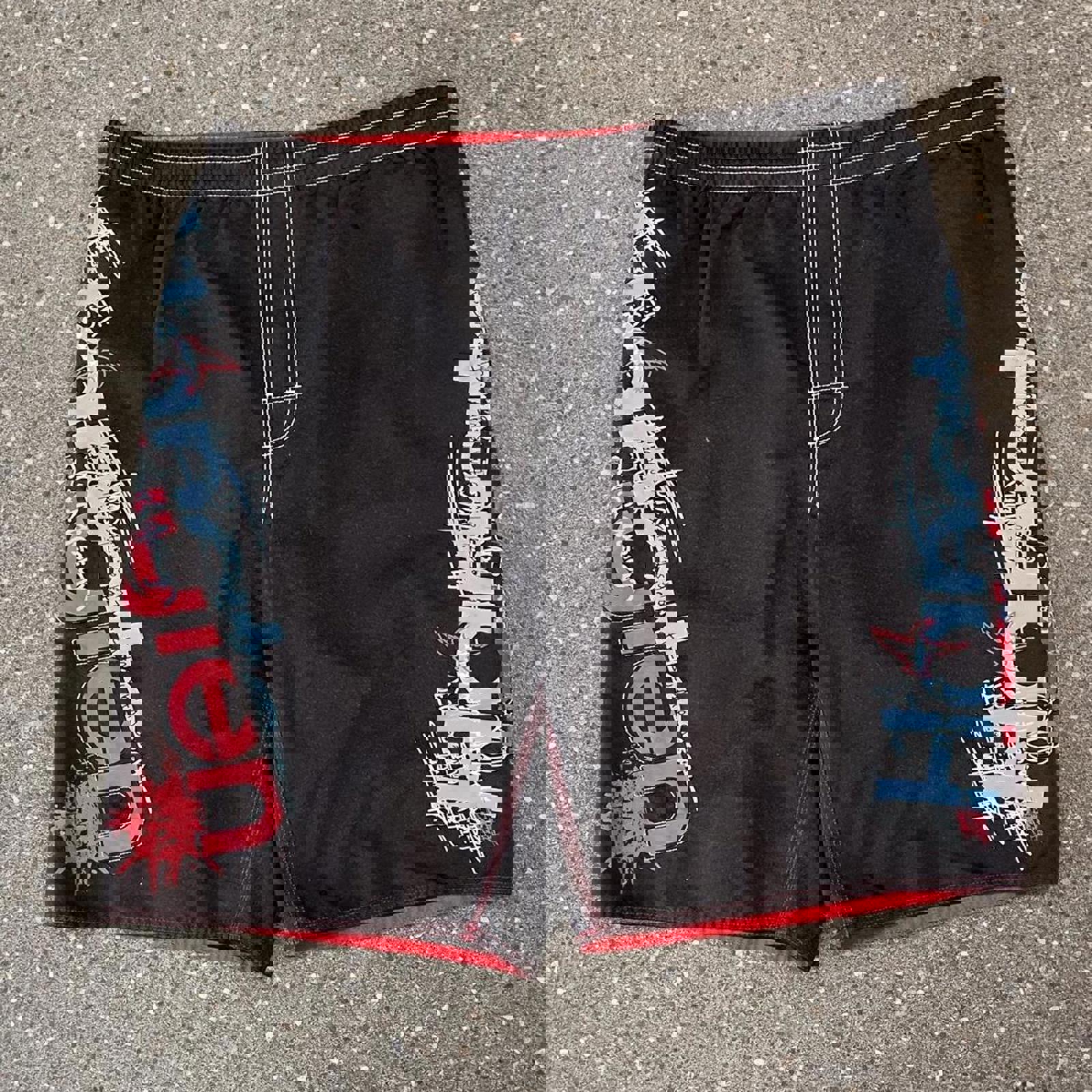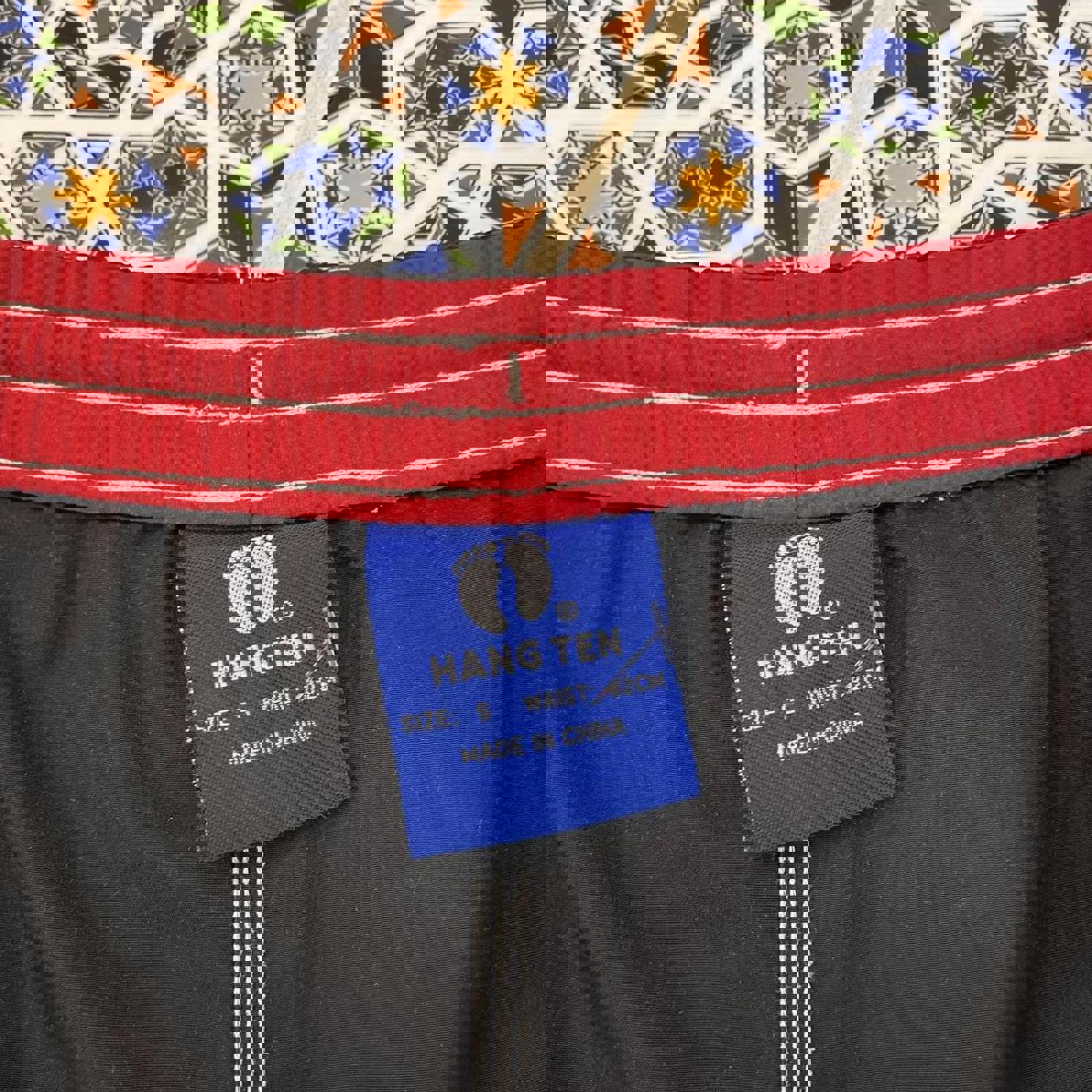 red, blue, white and black hang ten swimmers with spellout graphics on both legs