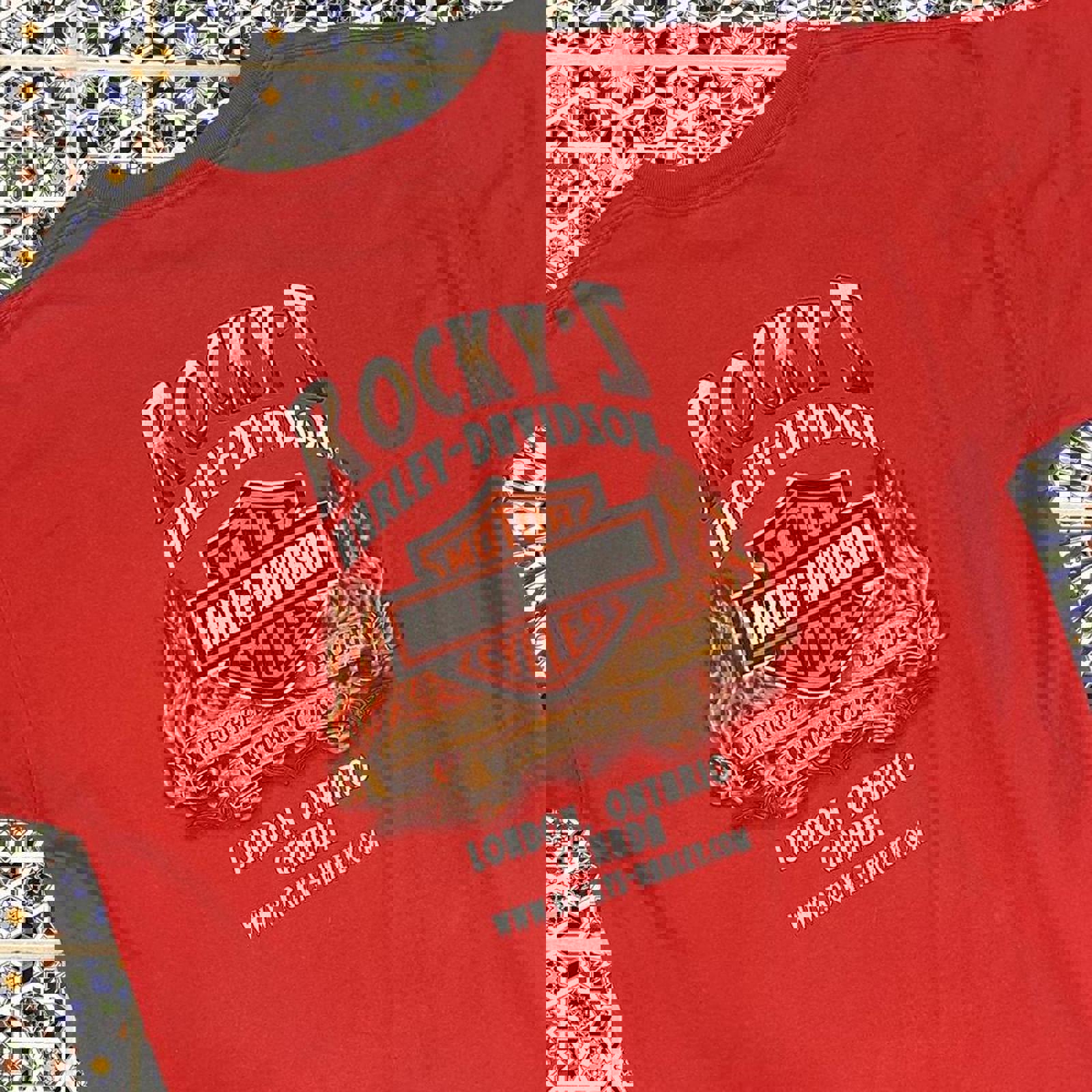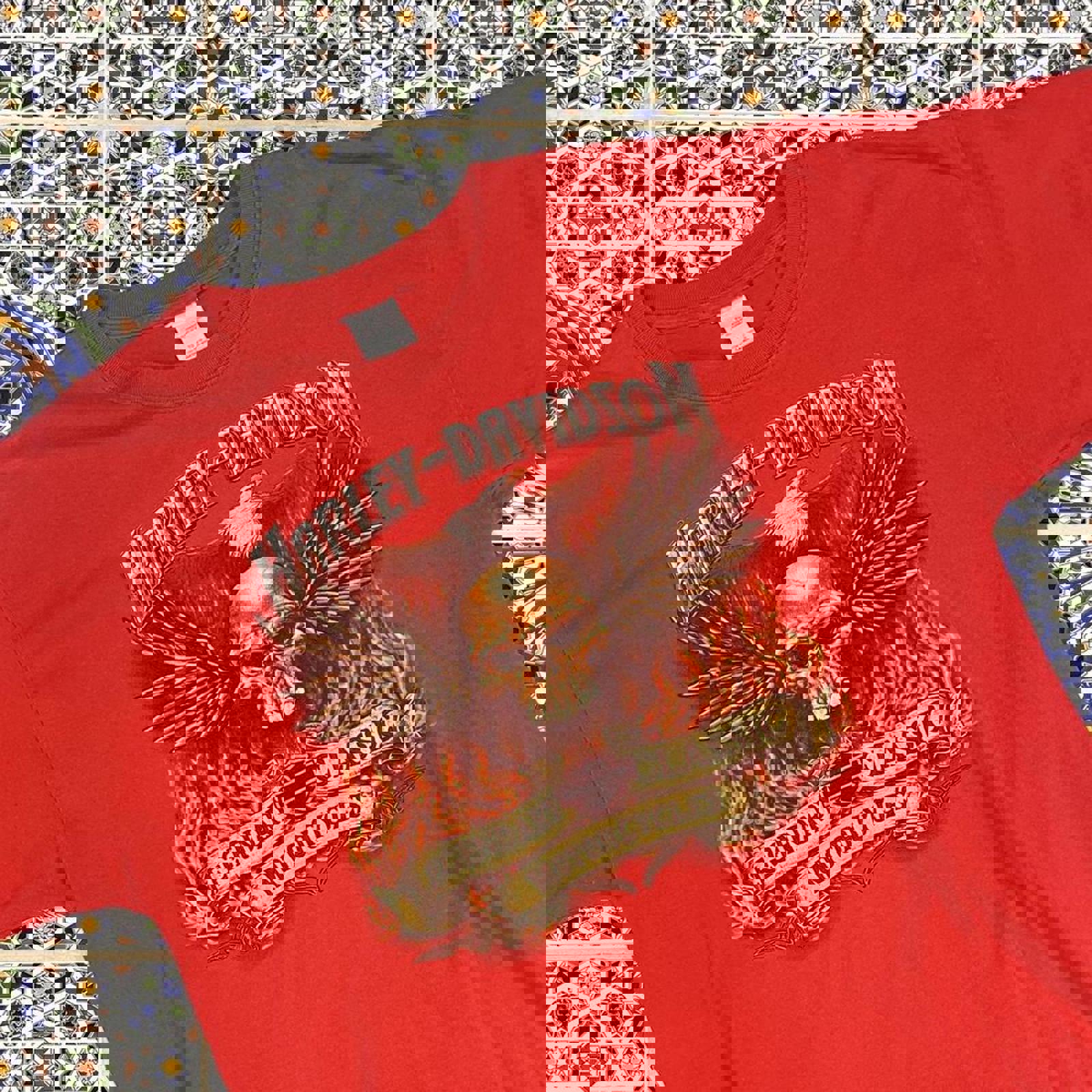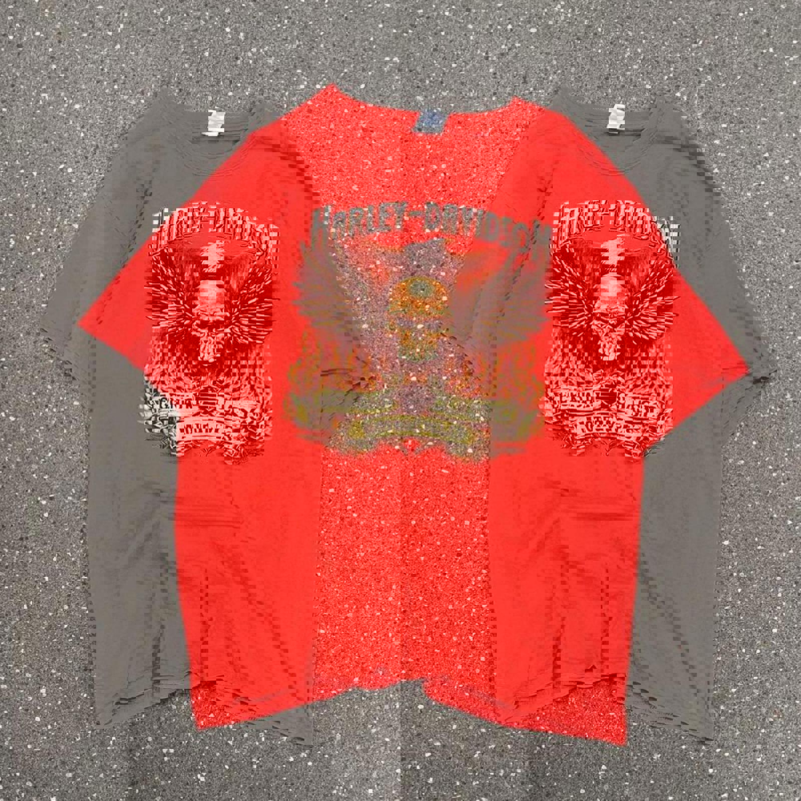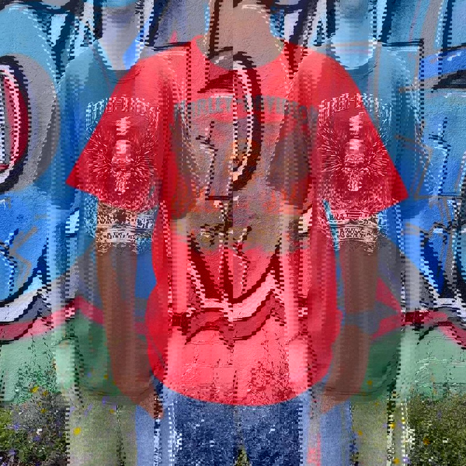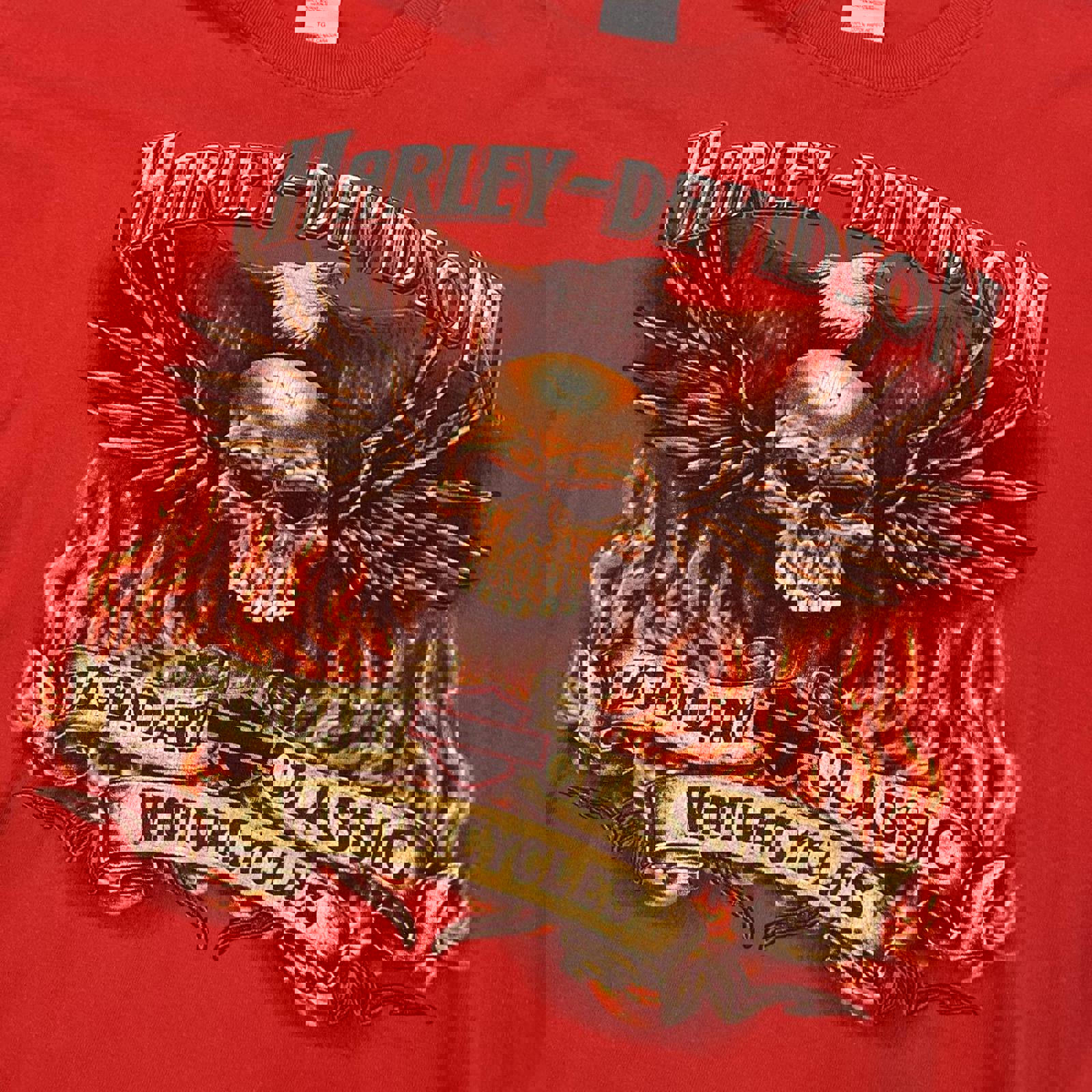 Red Harley Davidson tshirt with large flaming graphics on either side