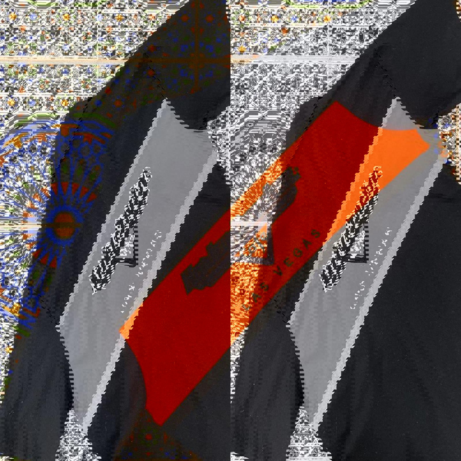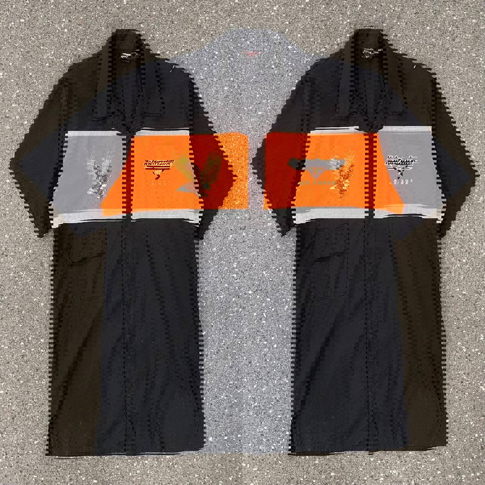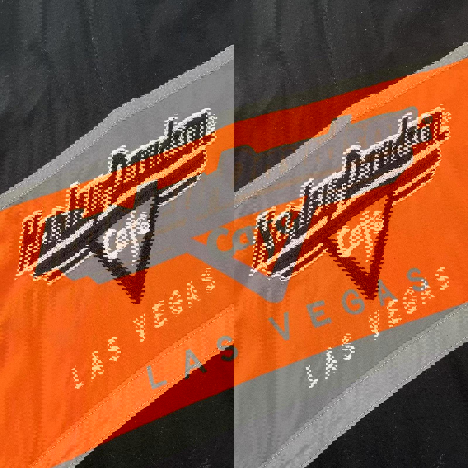 black and orange block coloured Harley Davidson las vegas cafe short sleeved button up shirt with an embroidery on the chest and back