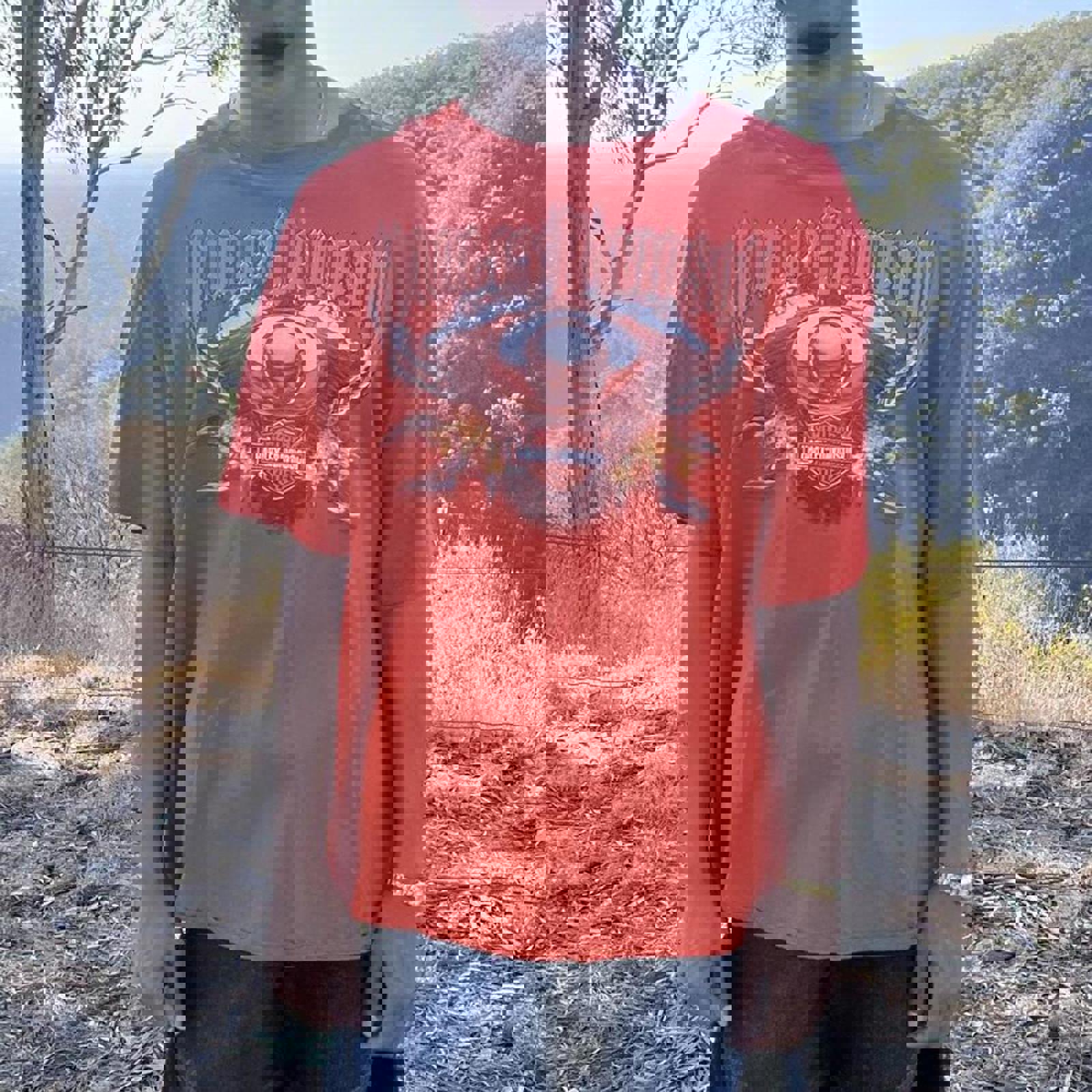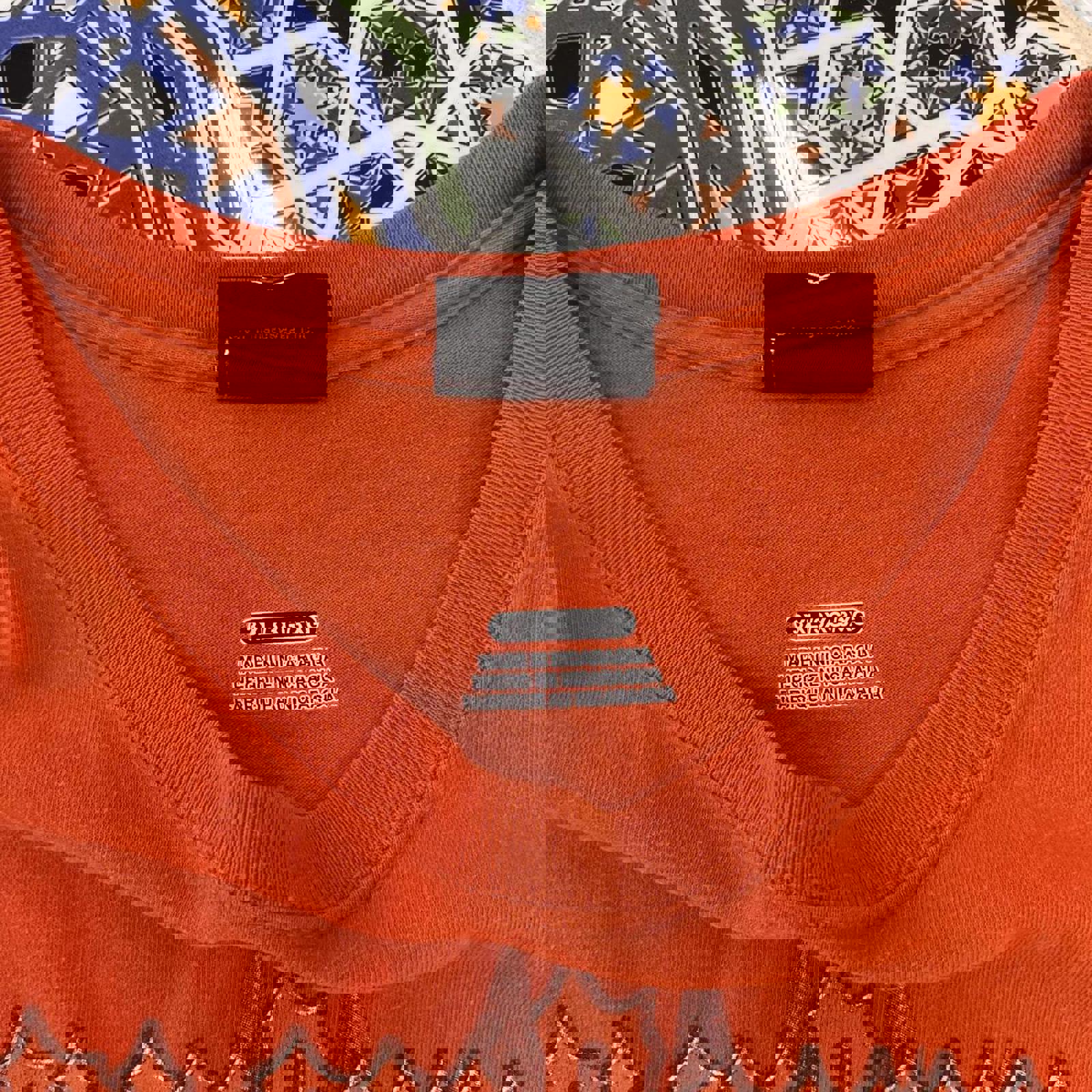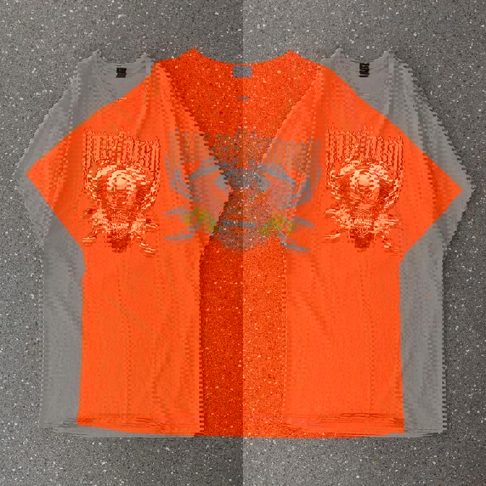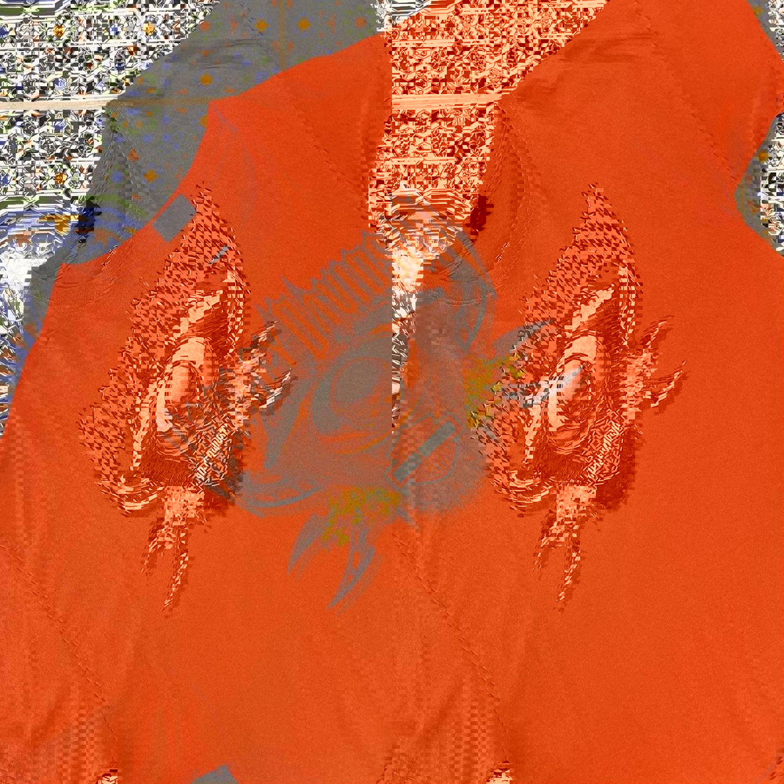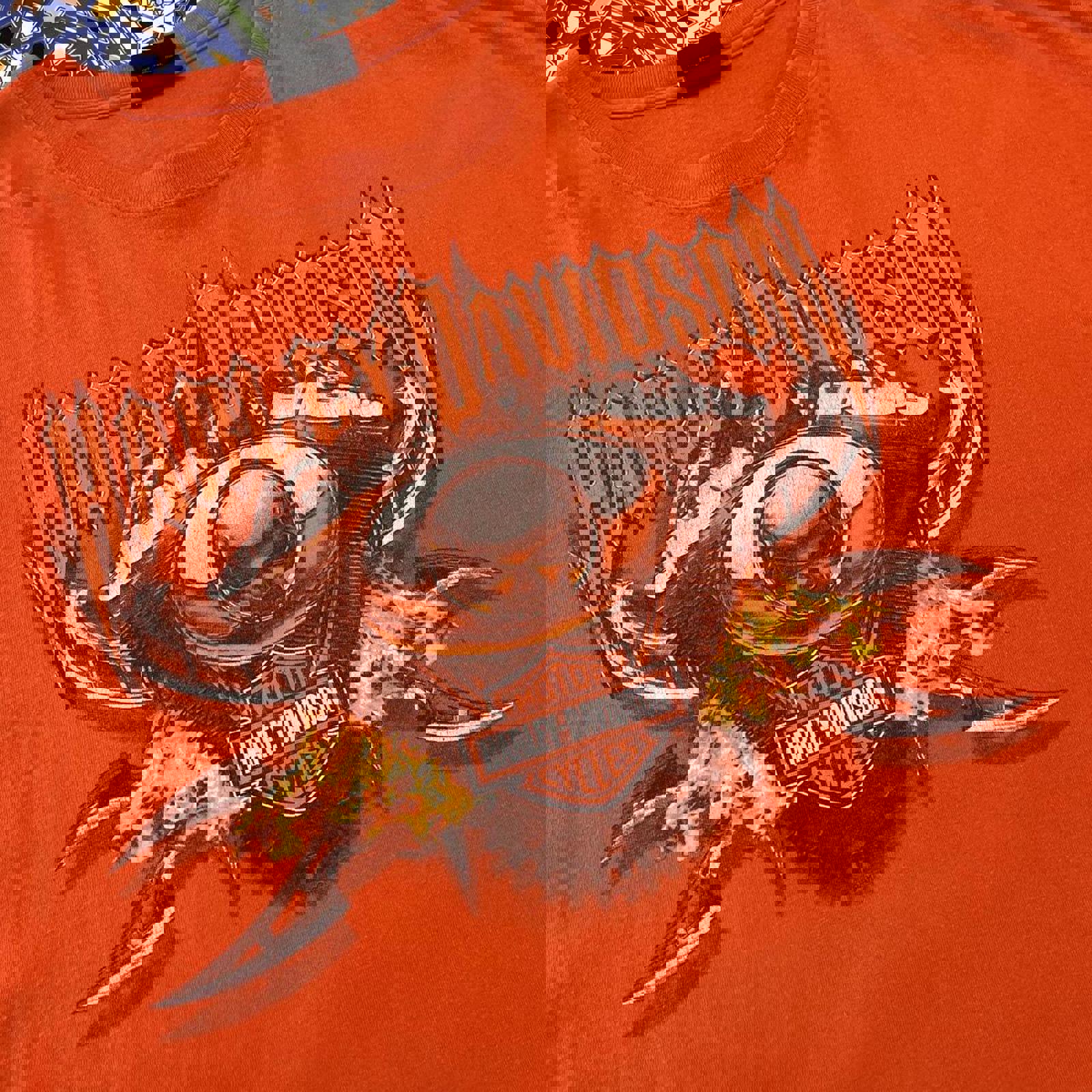 orange harley davidson tshirt with a large motor flame graphic on the front