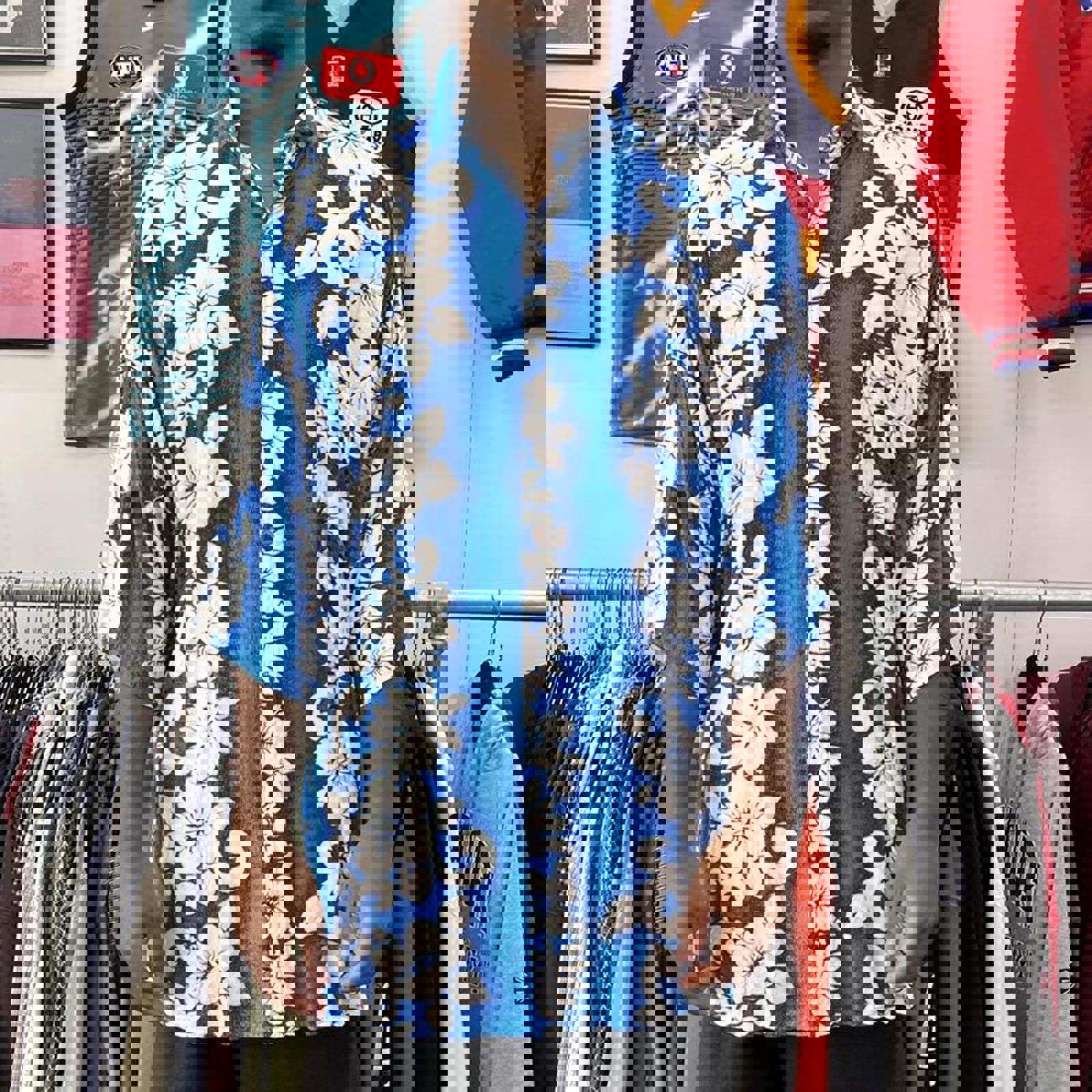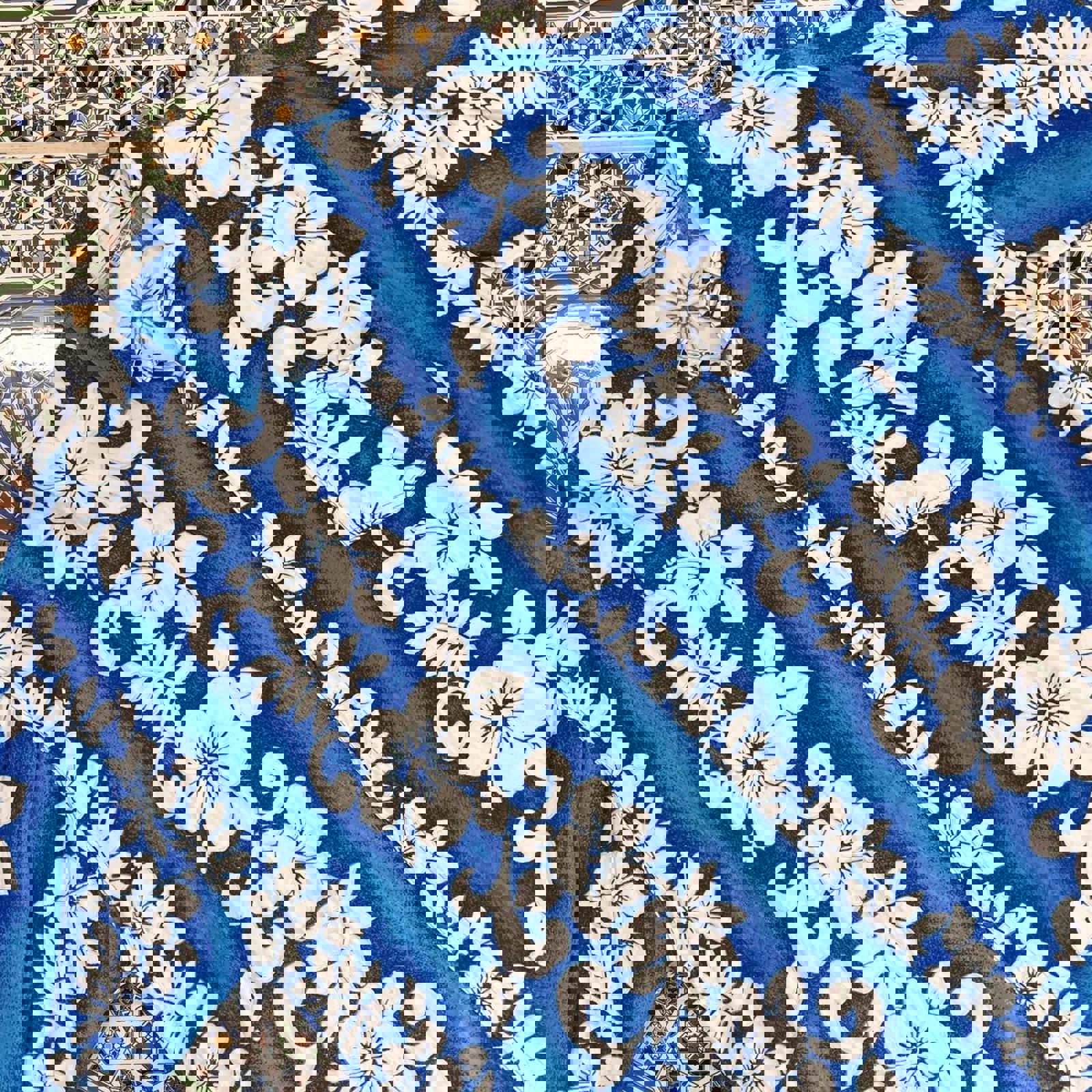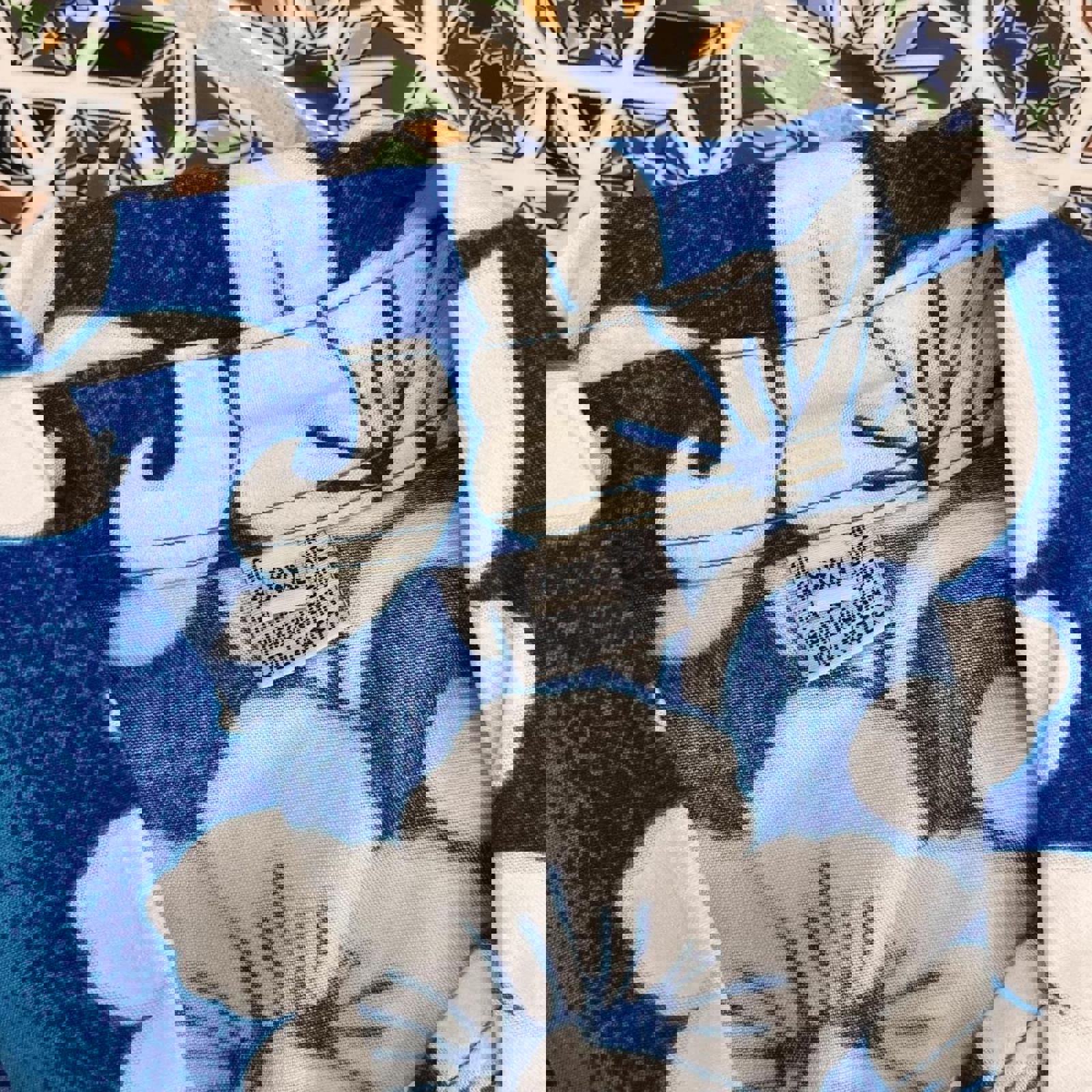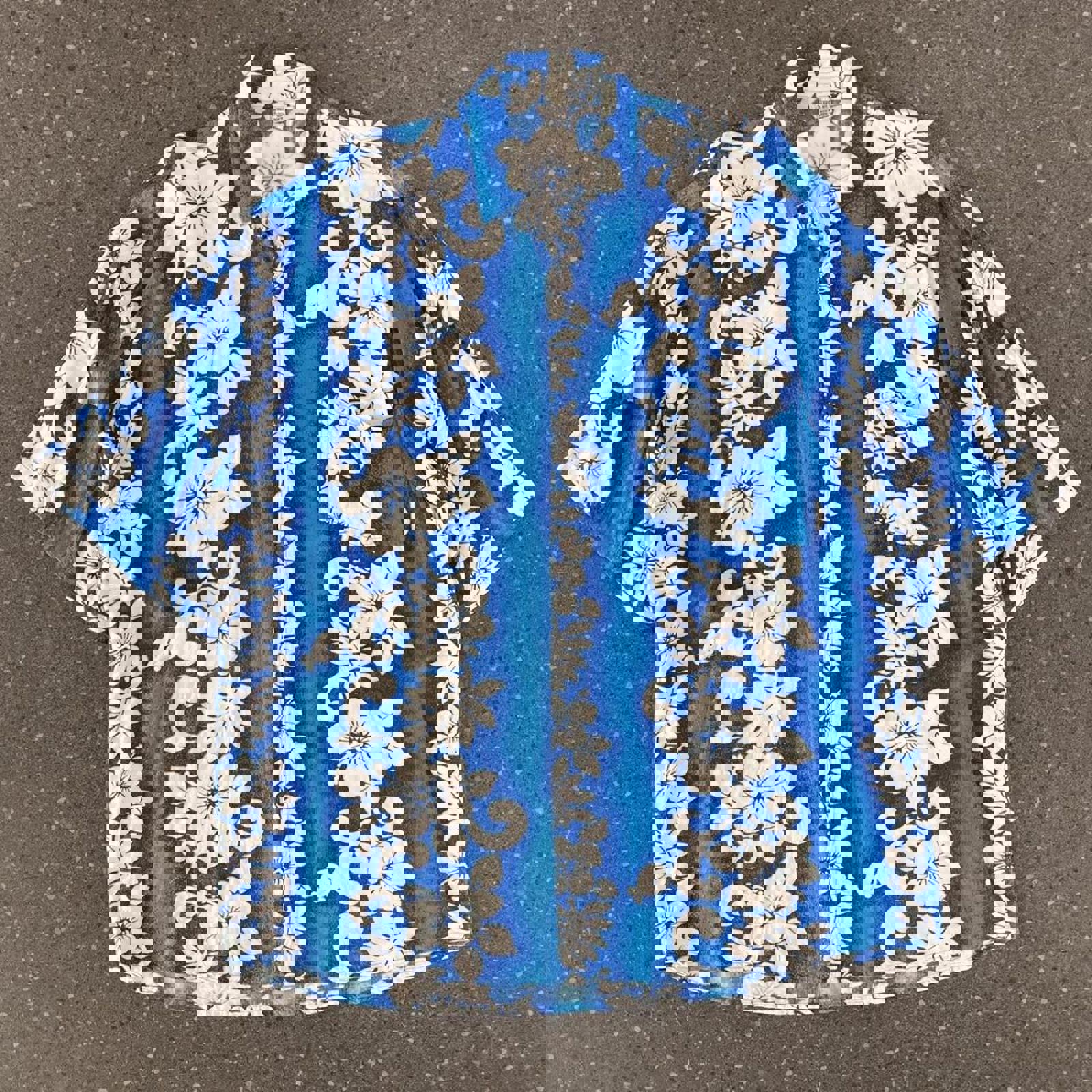 blue and white hawaiian short sleeved button up shirt with a singular chest pocket
