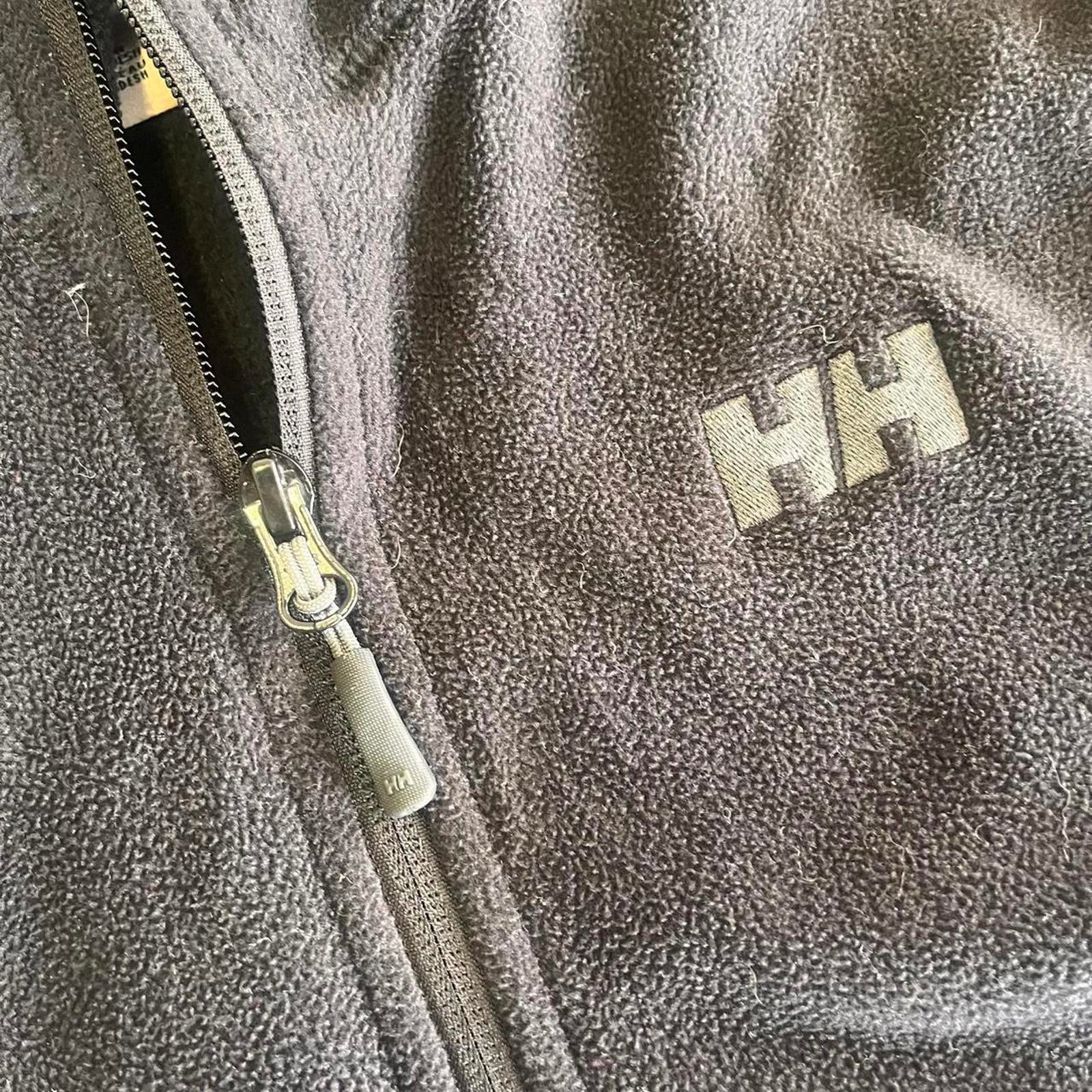 black Helly Hansen fleece sweater jacket with a silver embroidered HH logo on the chest, detailed zippers and zip-able pockets on the side