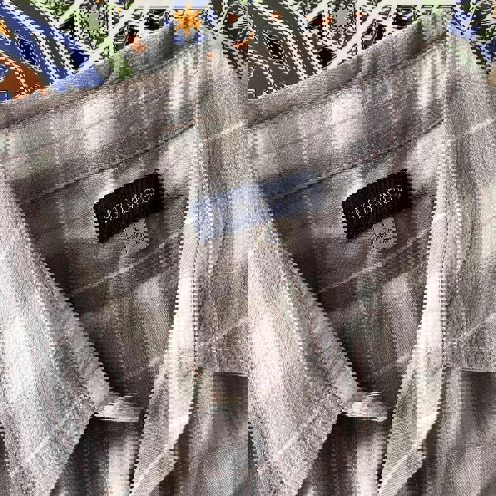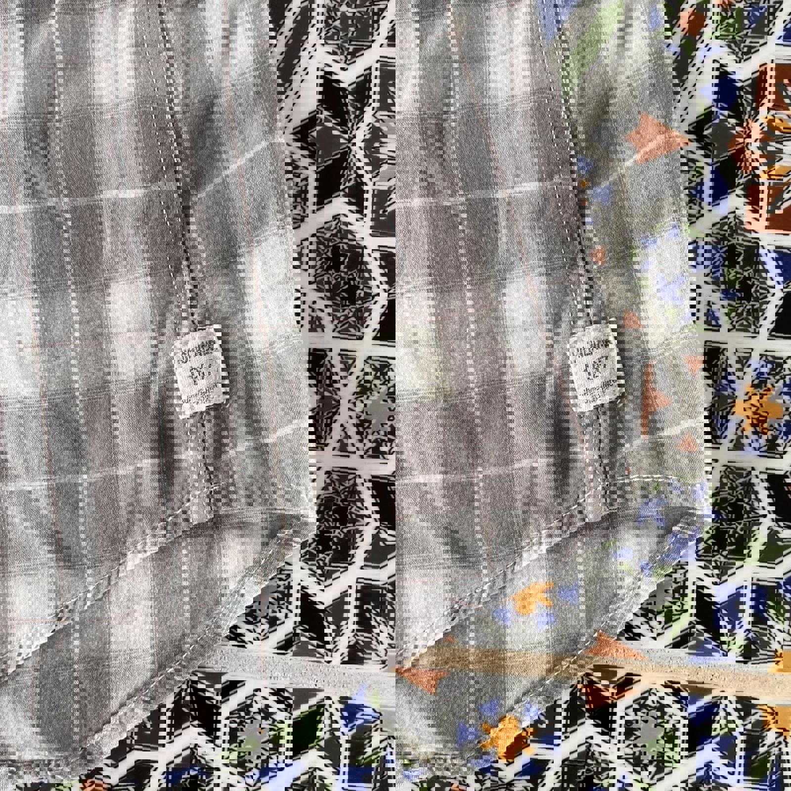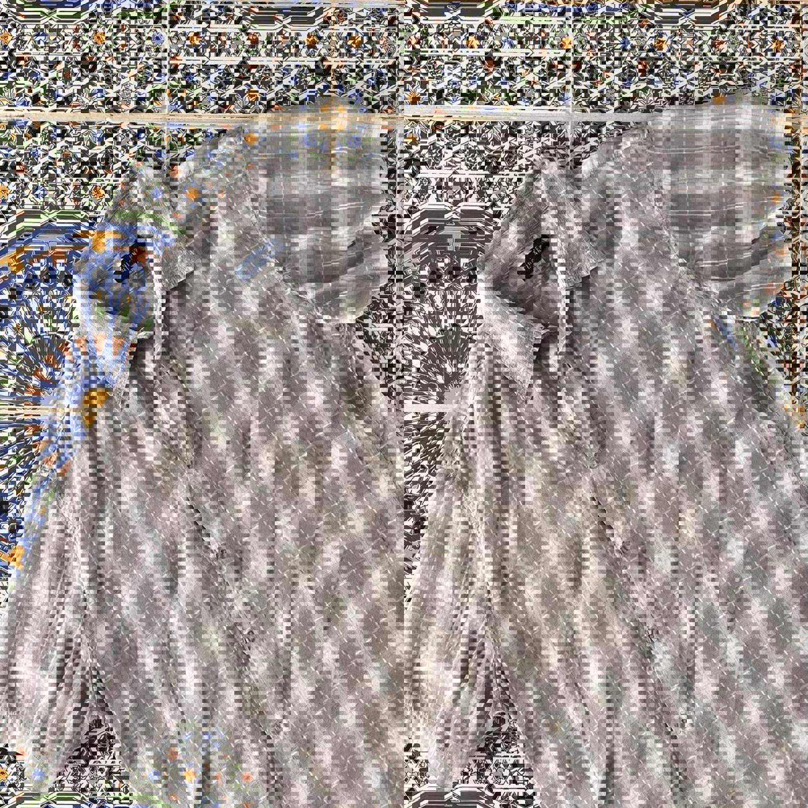 multi tone grey and white highlander short sleeved button up shirt with no chest pockets and a patch