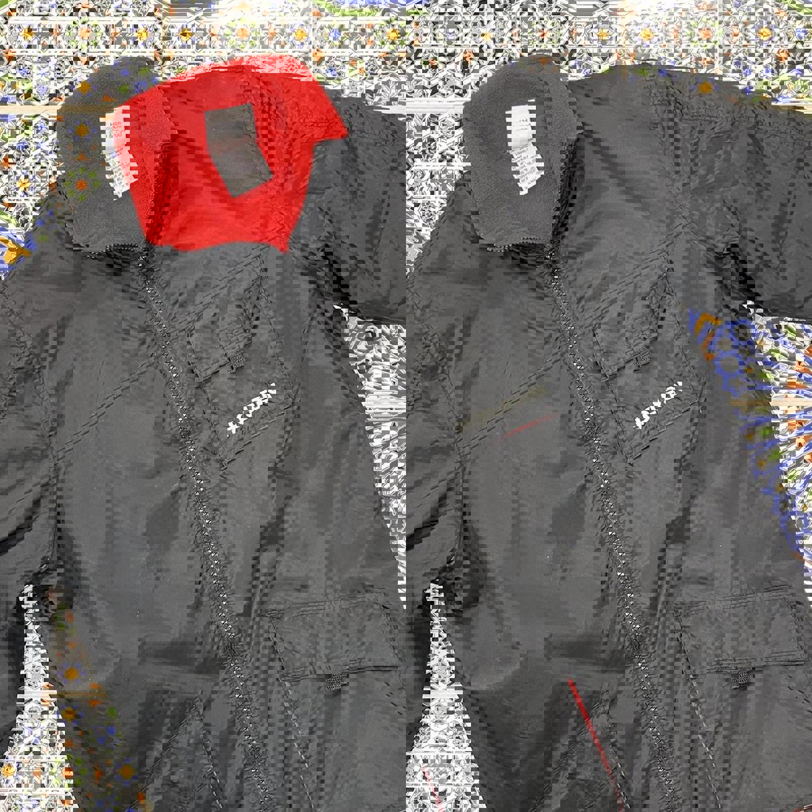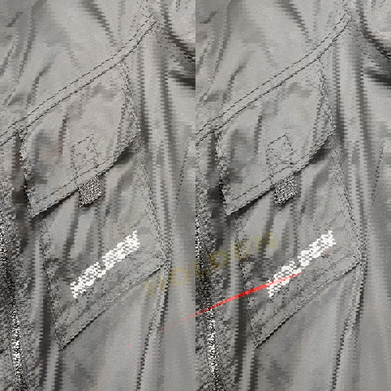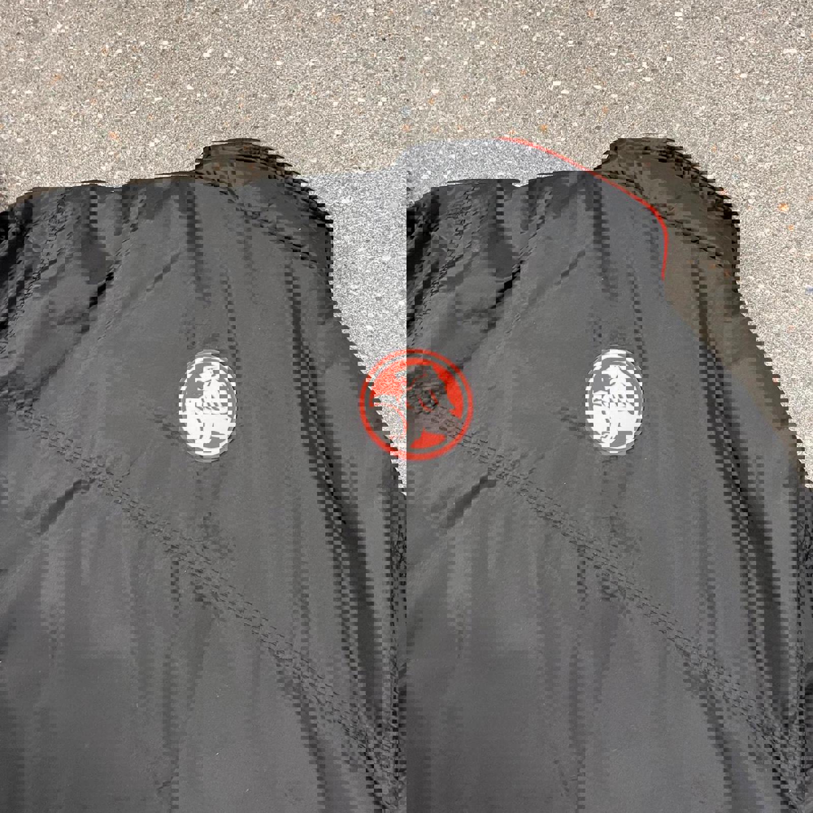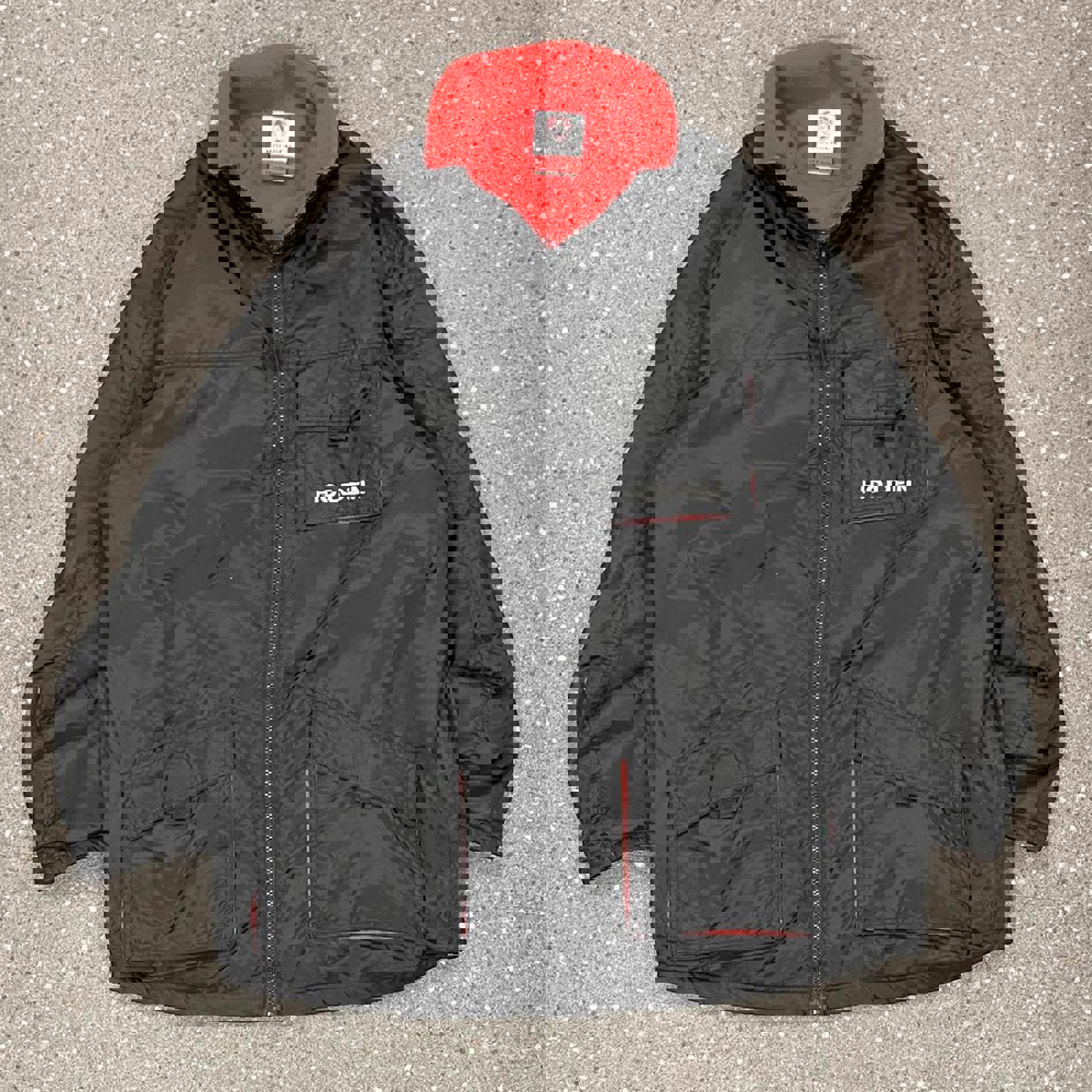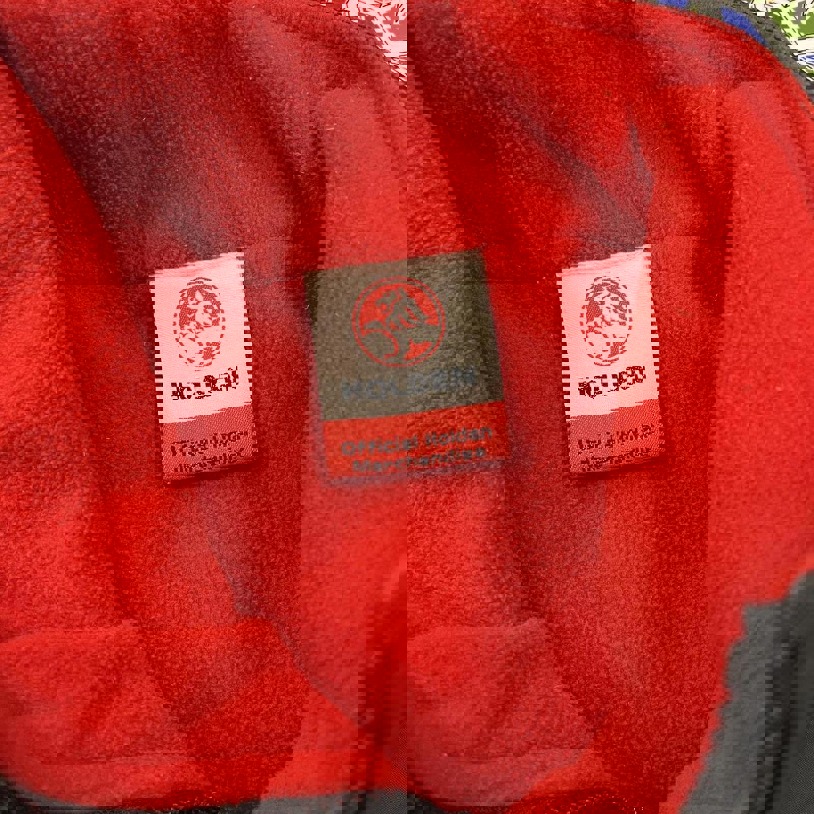 Black Holden jacket with red fleece interior, 3 front pockets and white embroidered Holden on the chest