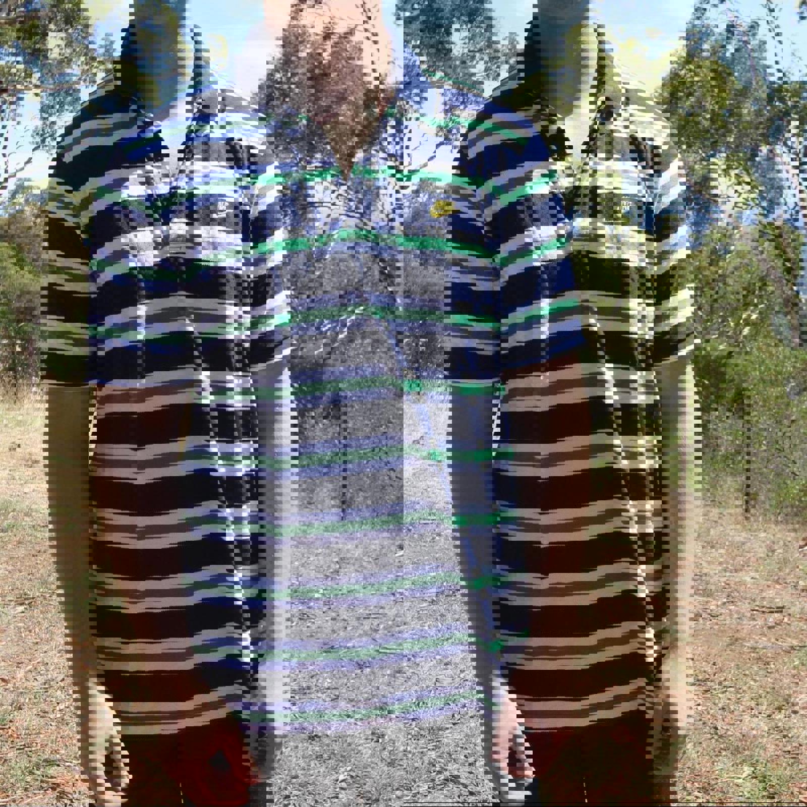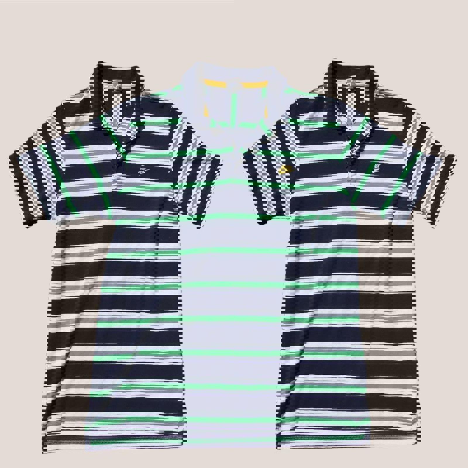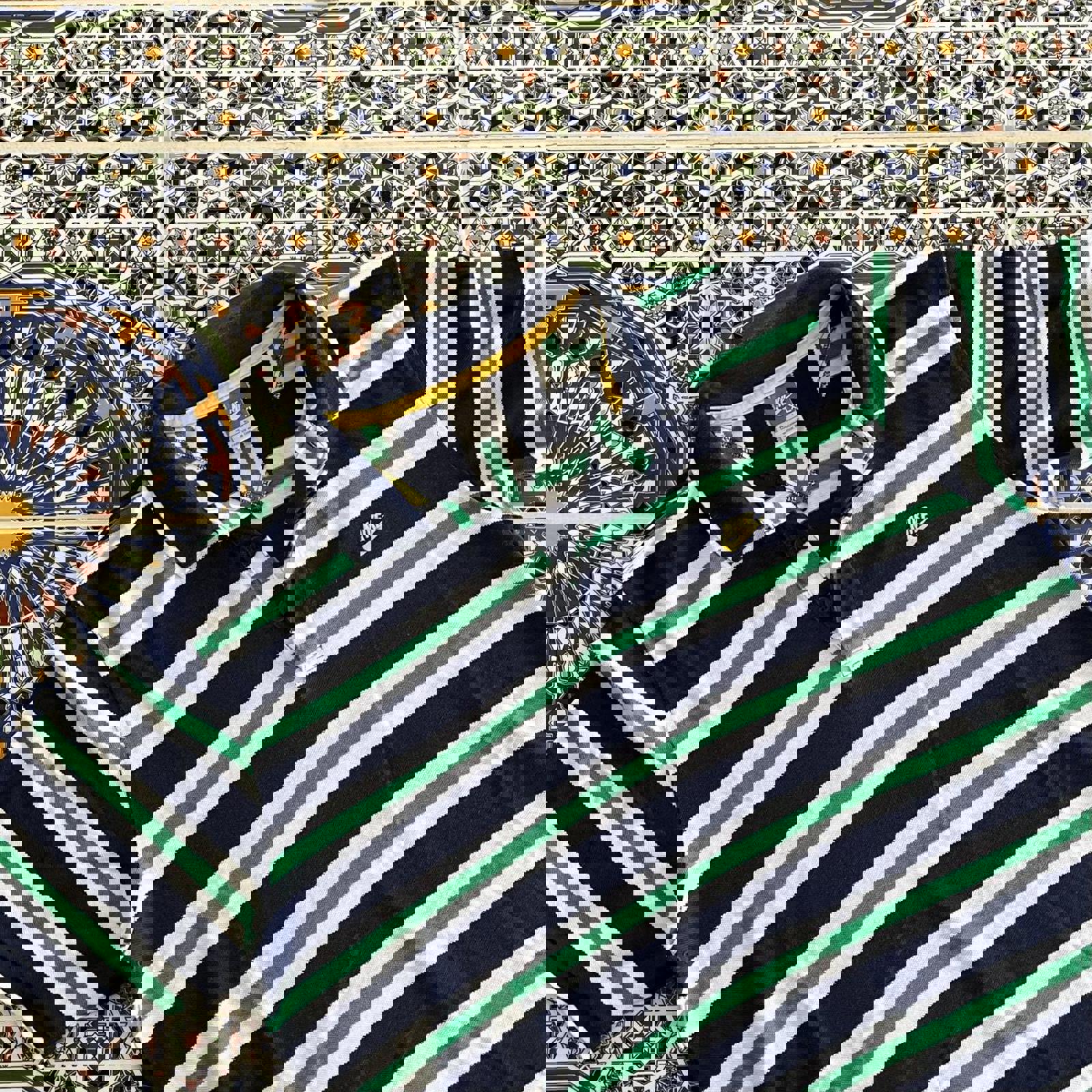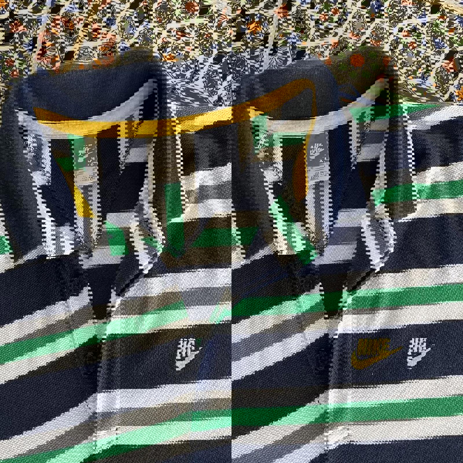 green, white, navy stripped polo shirt with the yellow embroidered Nike logo on chest