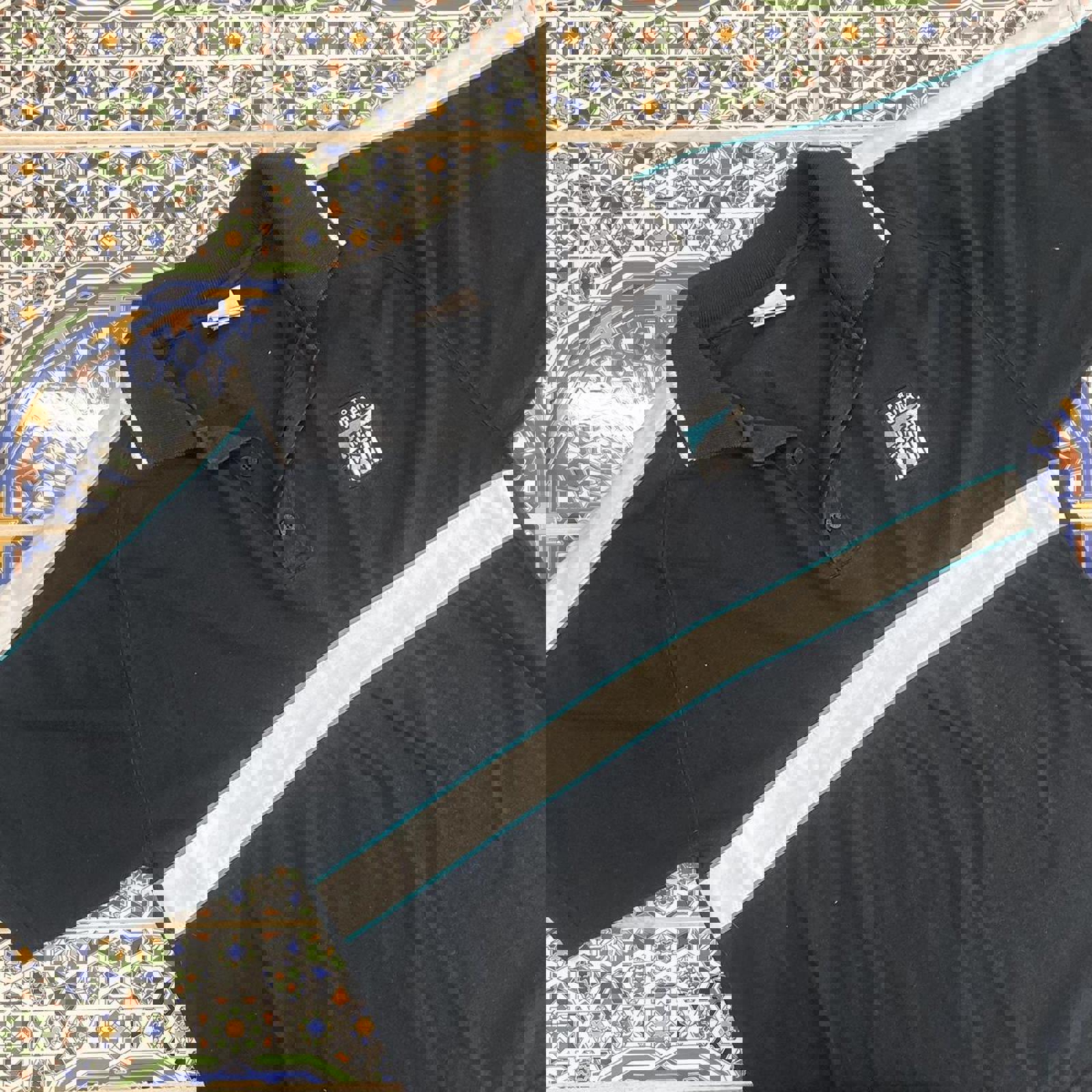 Black, white and teal power afl polo with two horizontal stripes on the chest and shoulders and an embroidered port Adelaide logo on the chest