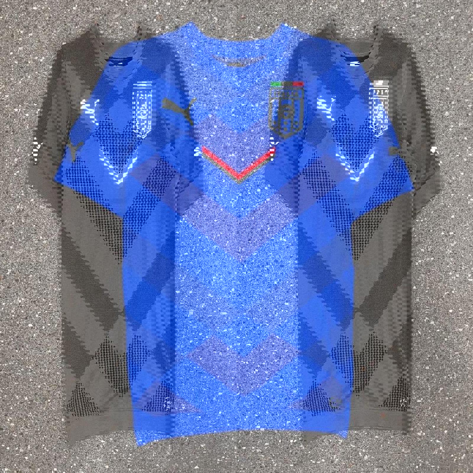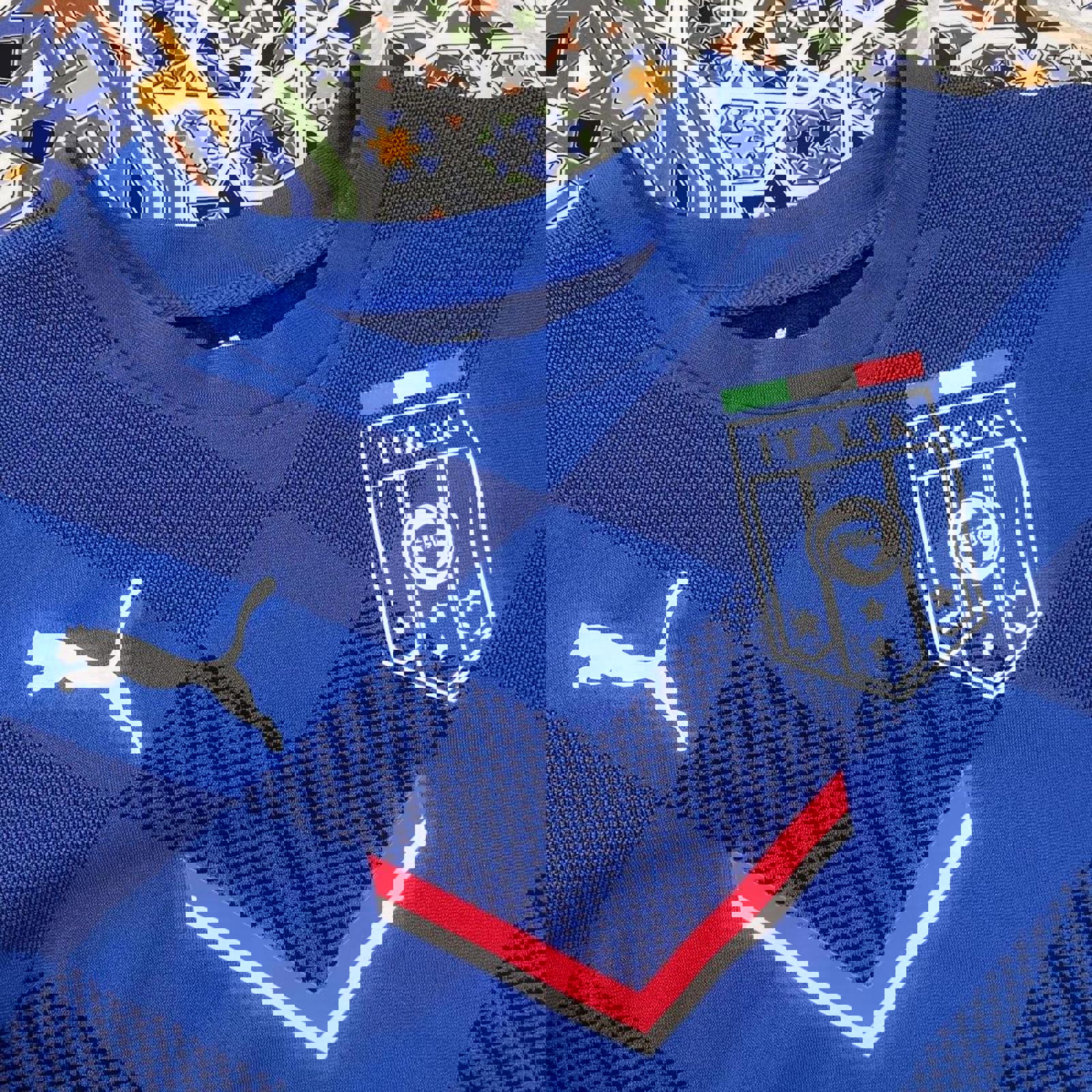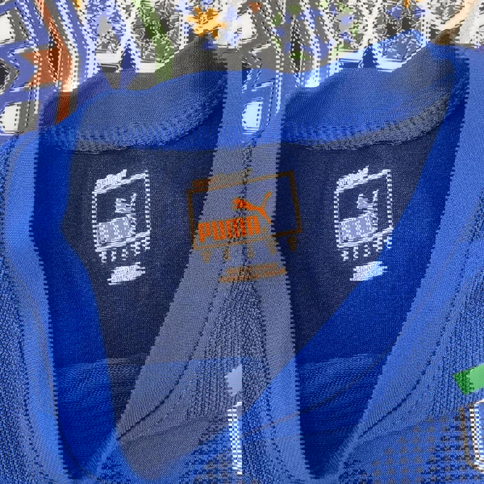 two tone blue puma italia football jersey with printed logos and spell outs on the chest and lower hip and a italian crest on the back of the neck