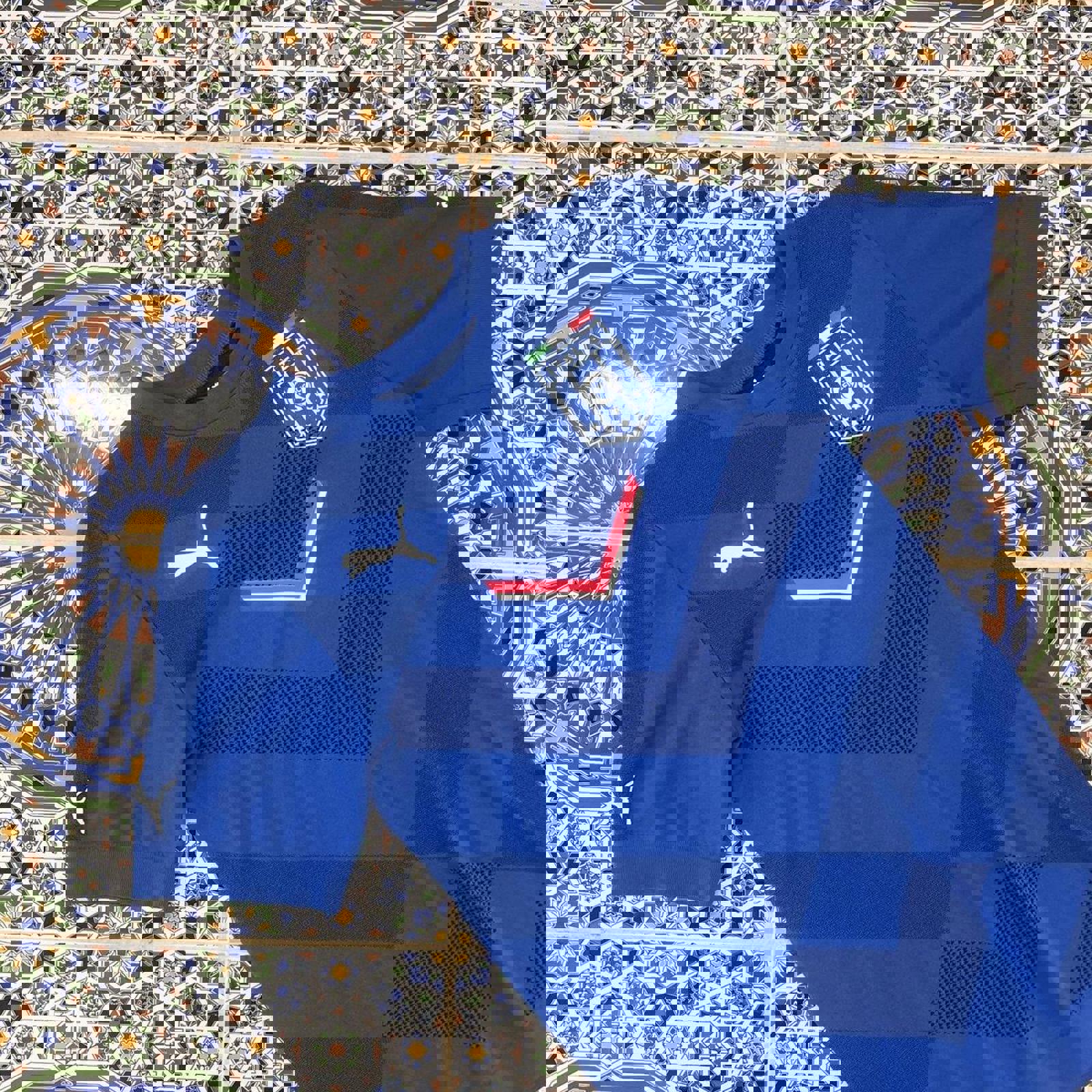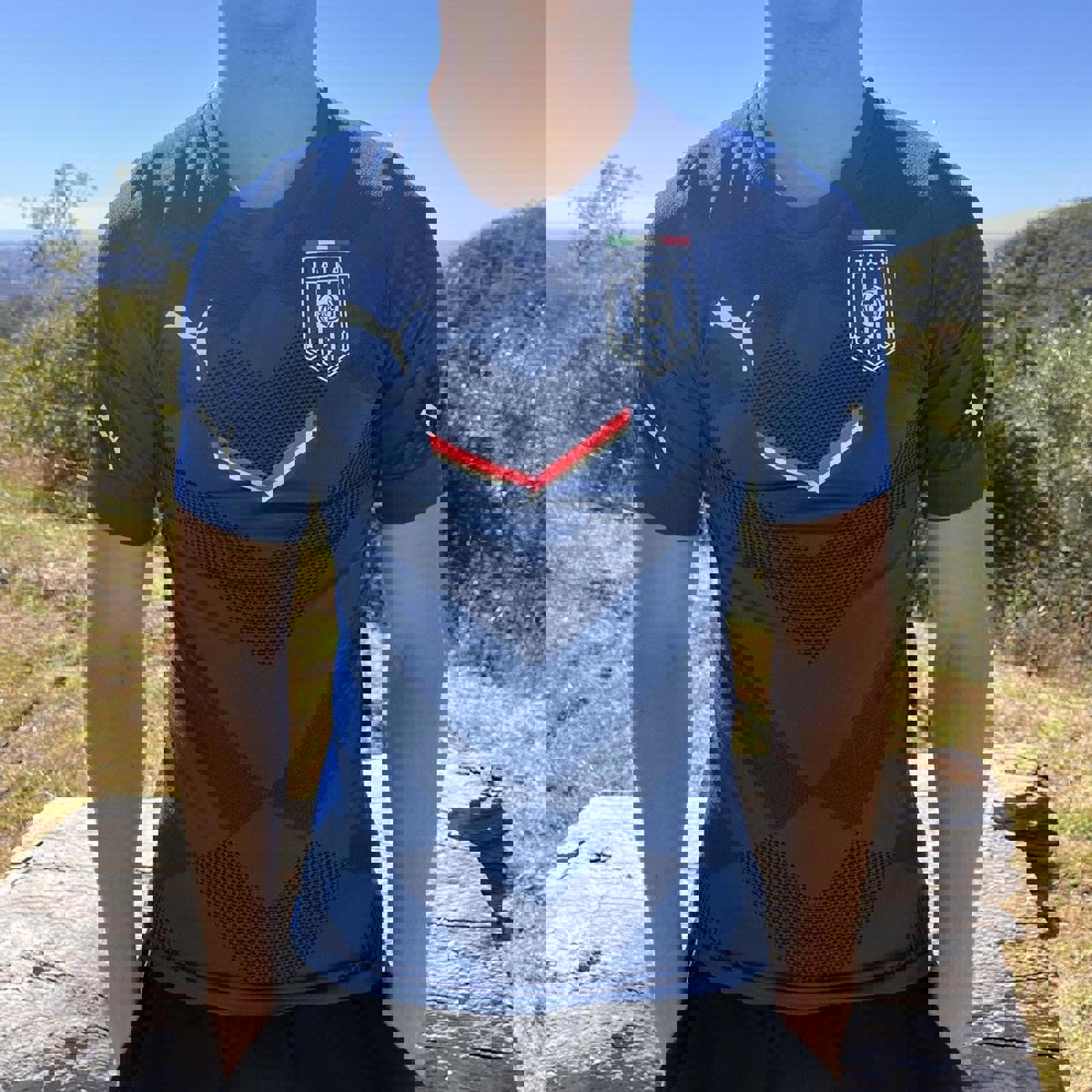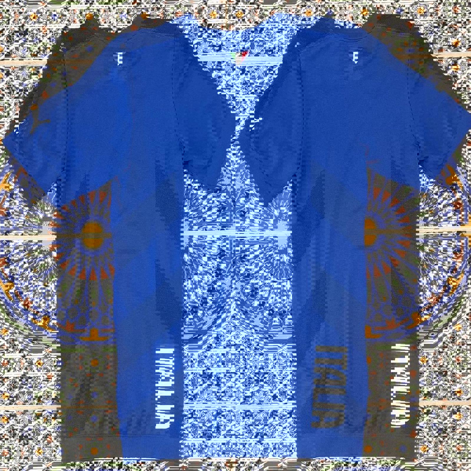 two tone blue puma italia football jersey with printed logos and spell outs on the chest and lower hip and a italian crest on the back of the neck