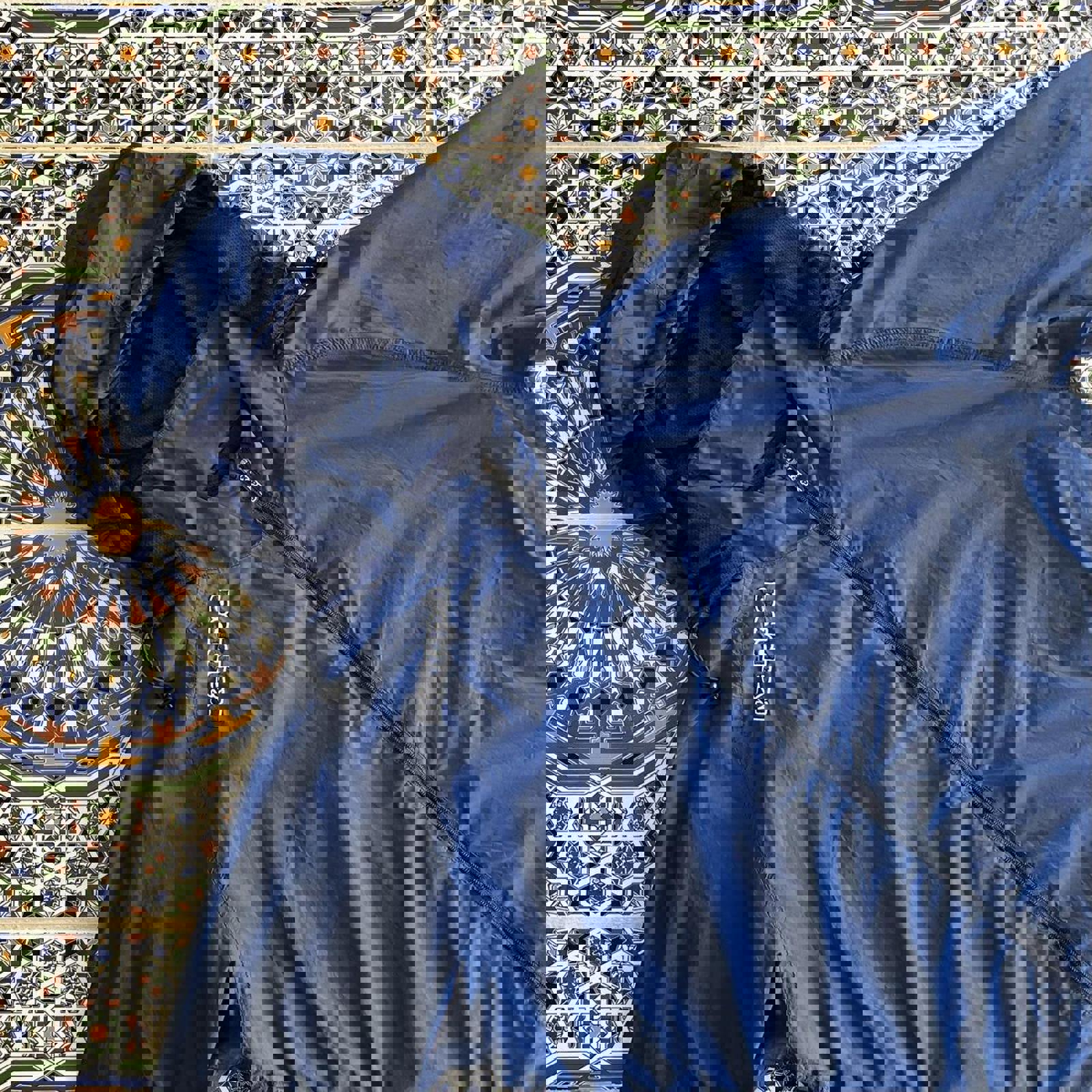 navy kappa jacket with embroidered spell out on right shoulder and kappa girls on both hips. comes with hide-able hood in the collar and detailed zip
