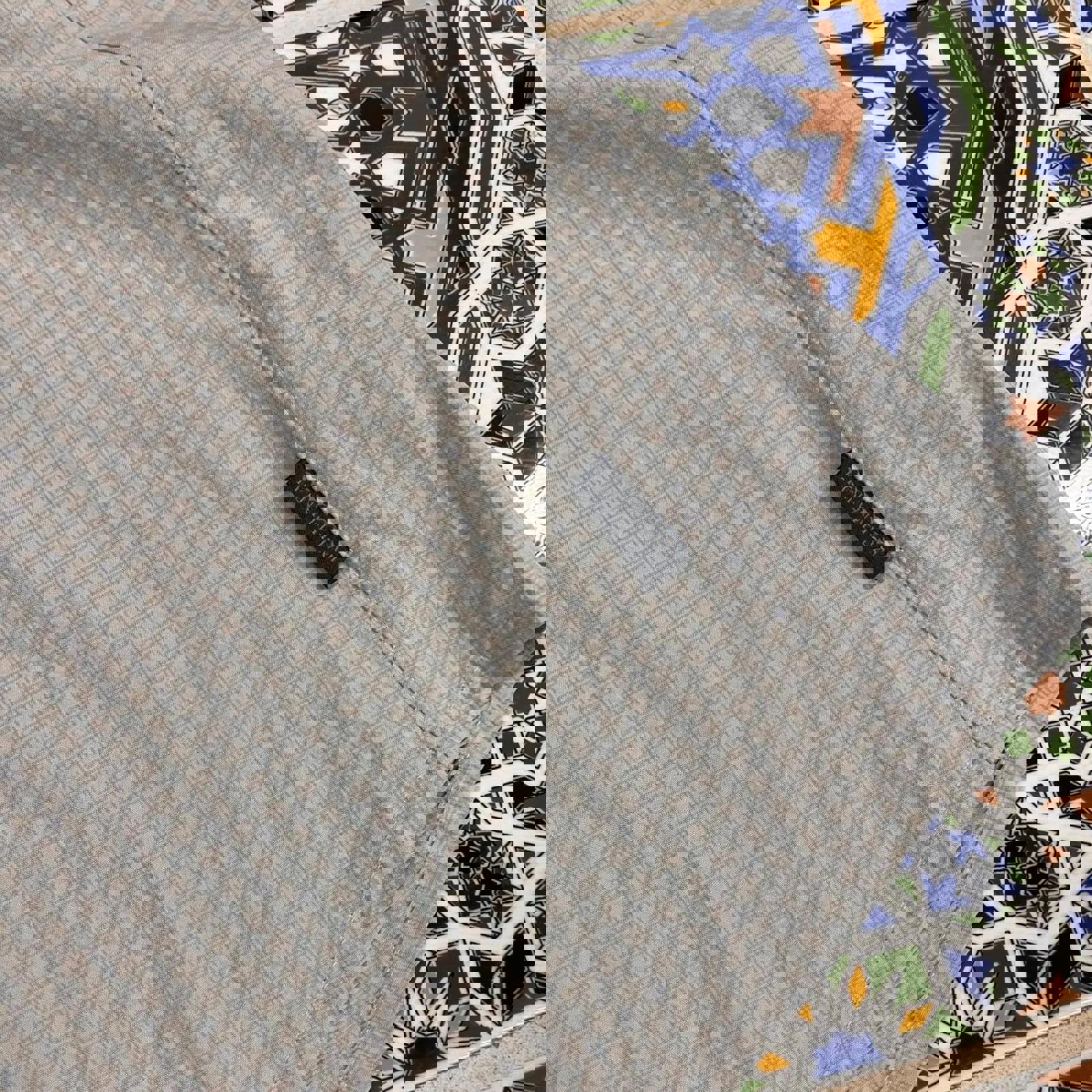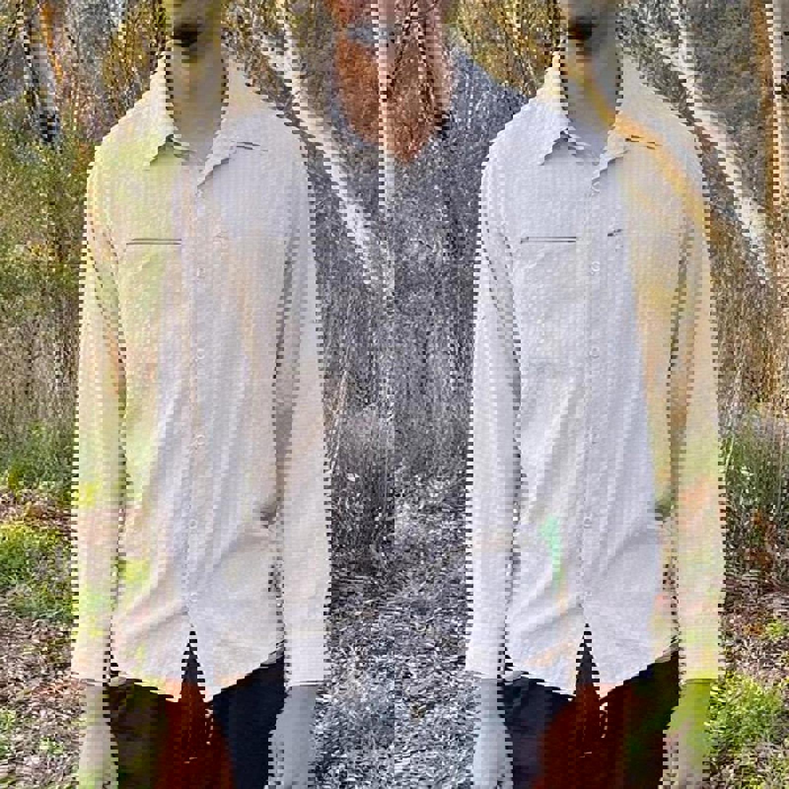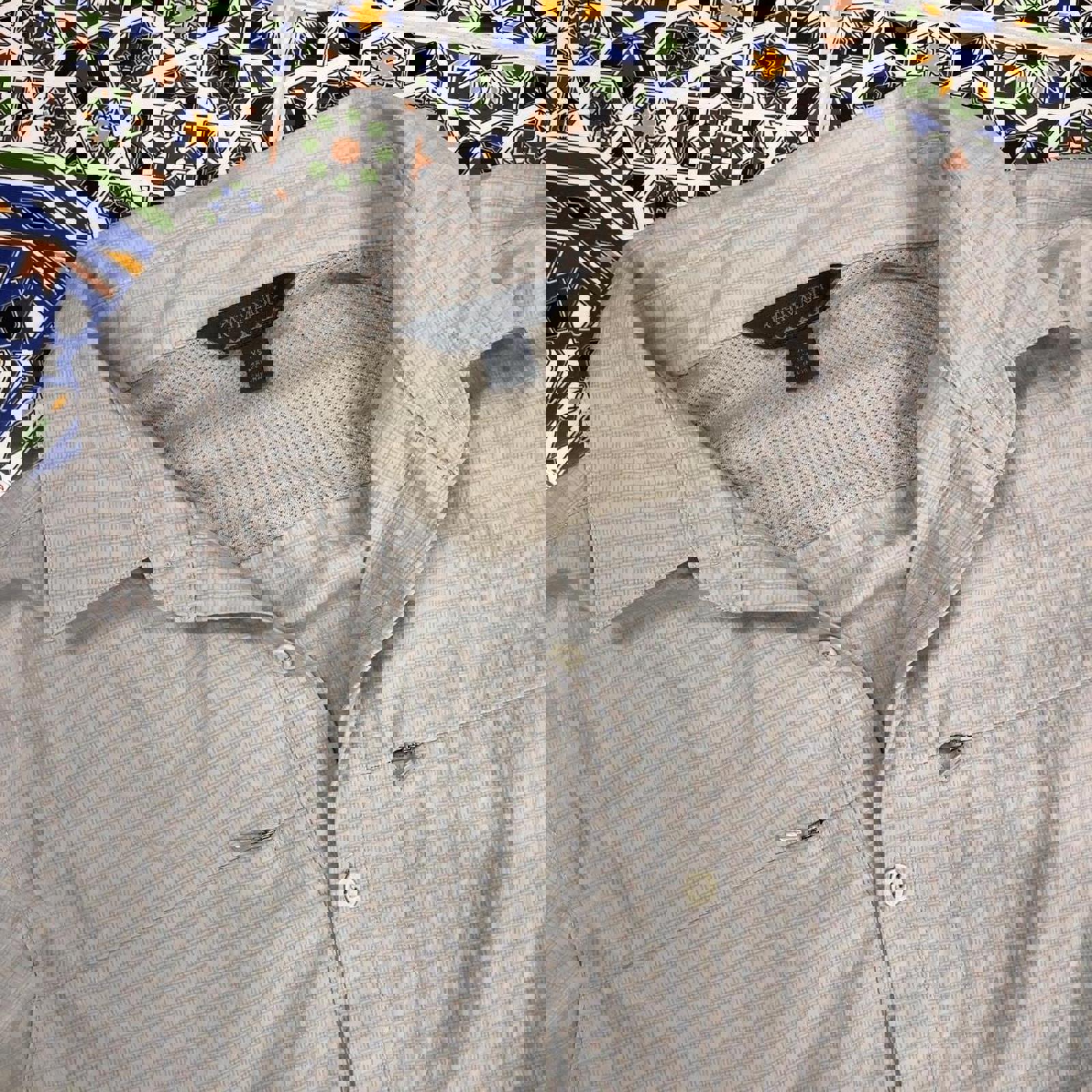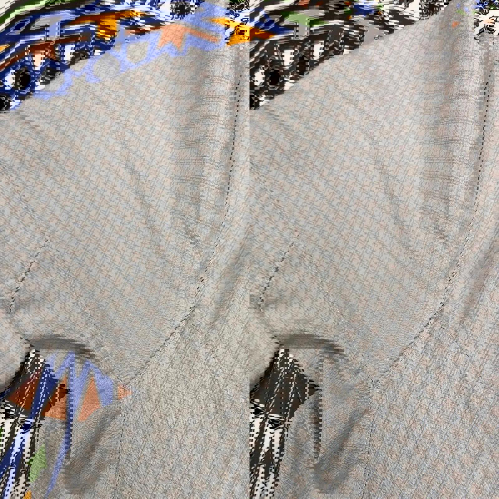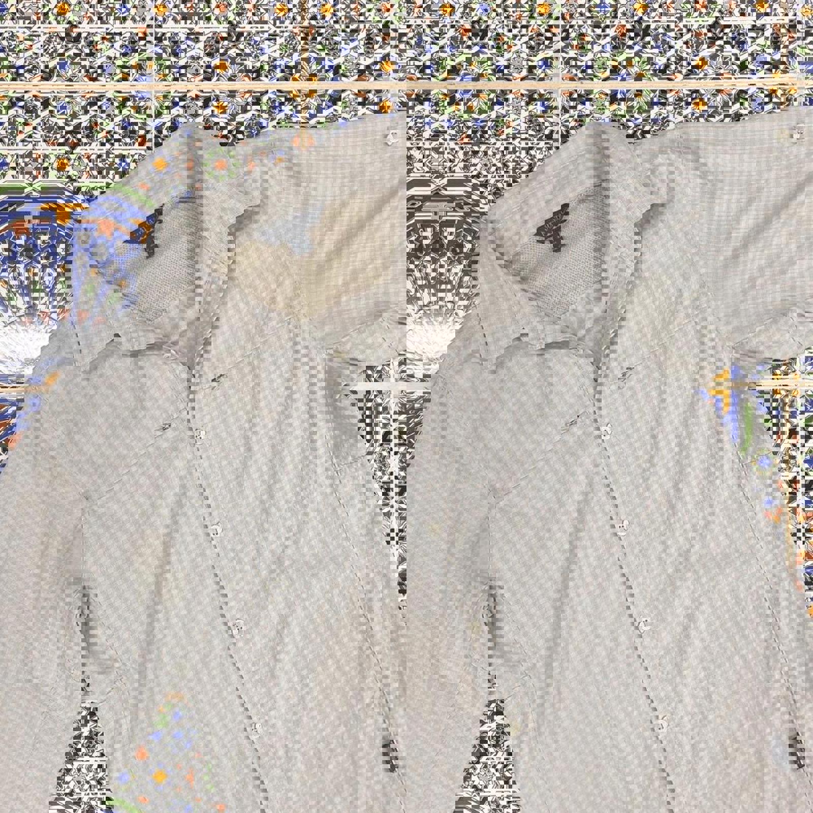 cream and light turquoise checkered kathmandu long sleeved button up shirt with a tab off the side