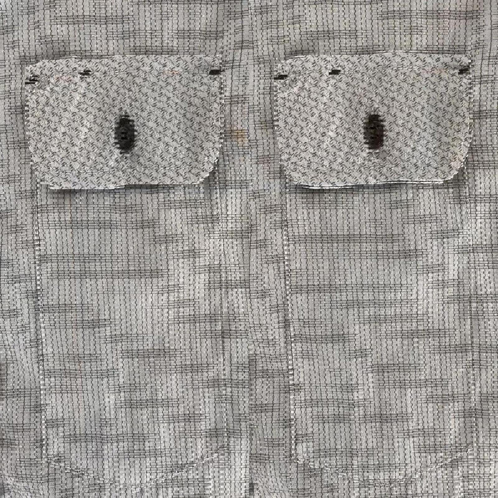 Greyish baby blue and grey checkered Kathmandu short sleeved button up shirt with double chest pockets, detailed buttons and a Kathmandu tab off the hip