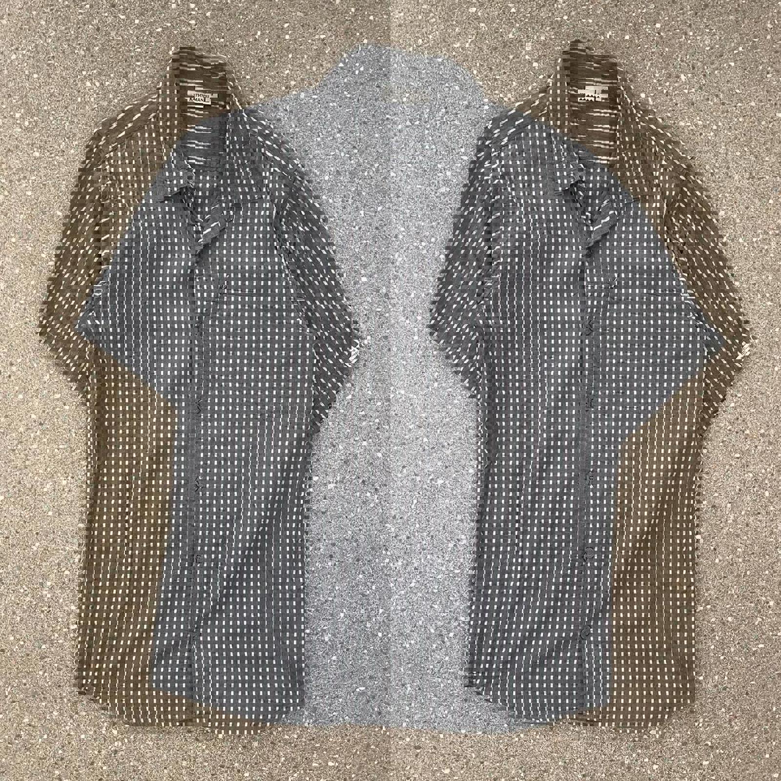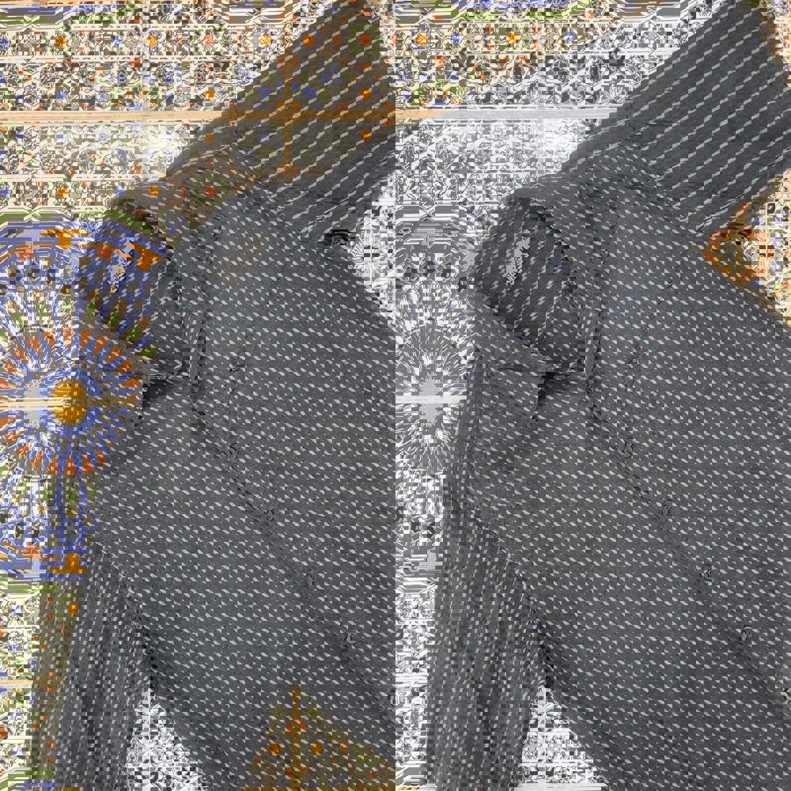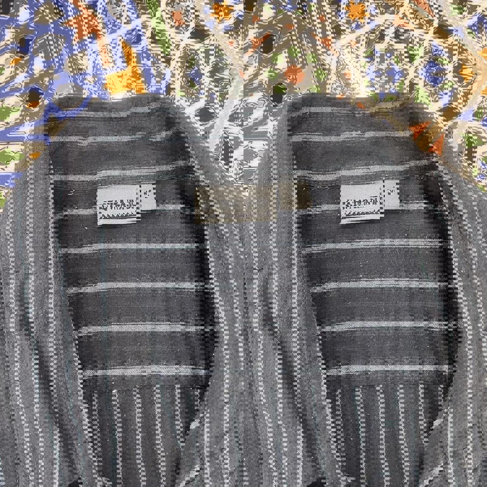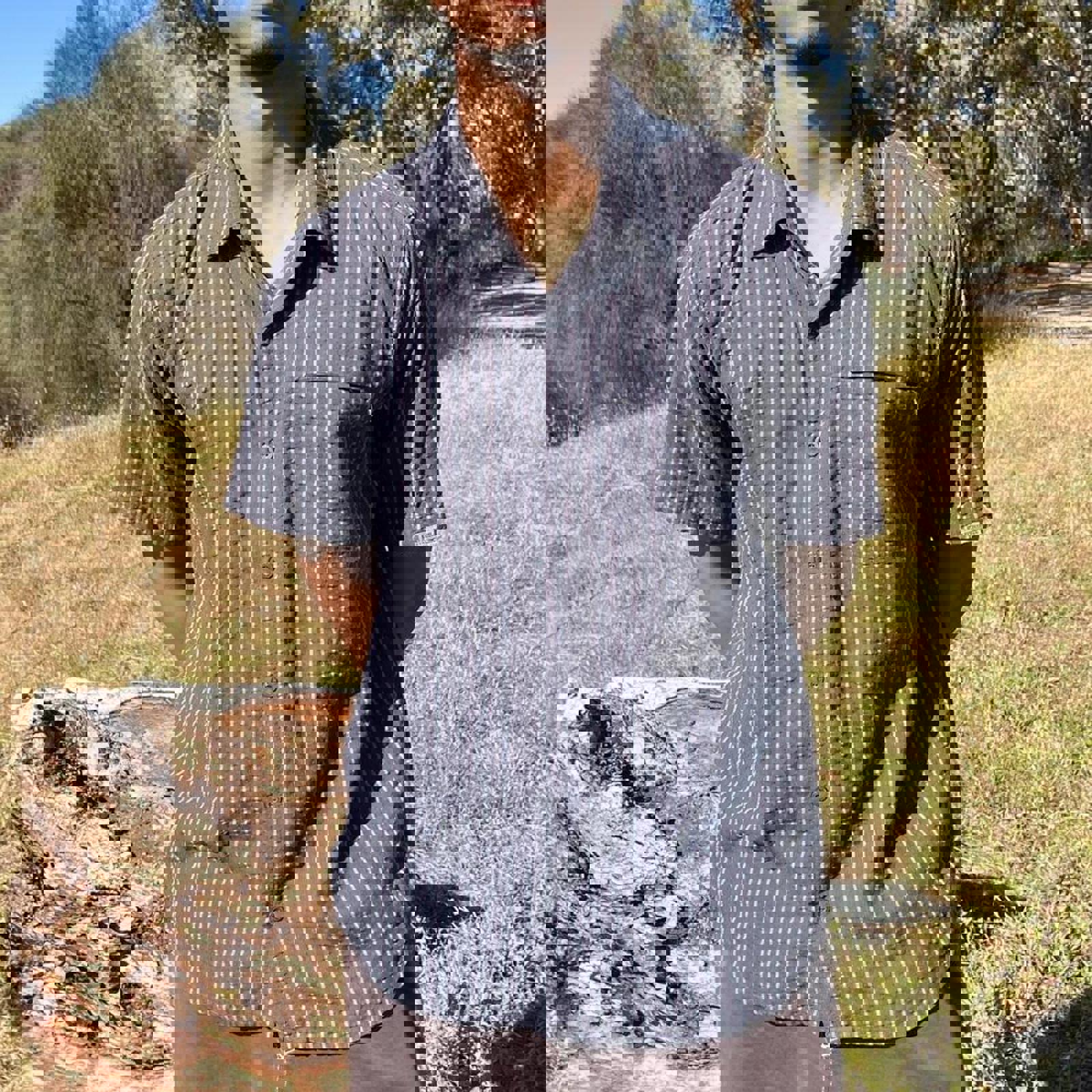 black and grey kathmandu striped short sleeved button up shirt with zip-able pockt and tab on sleeve