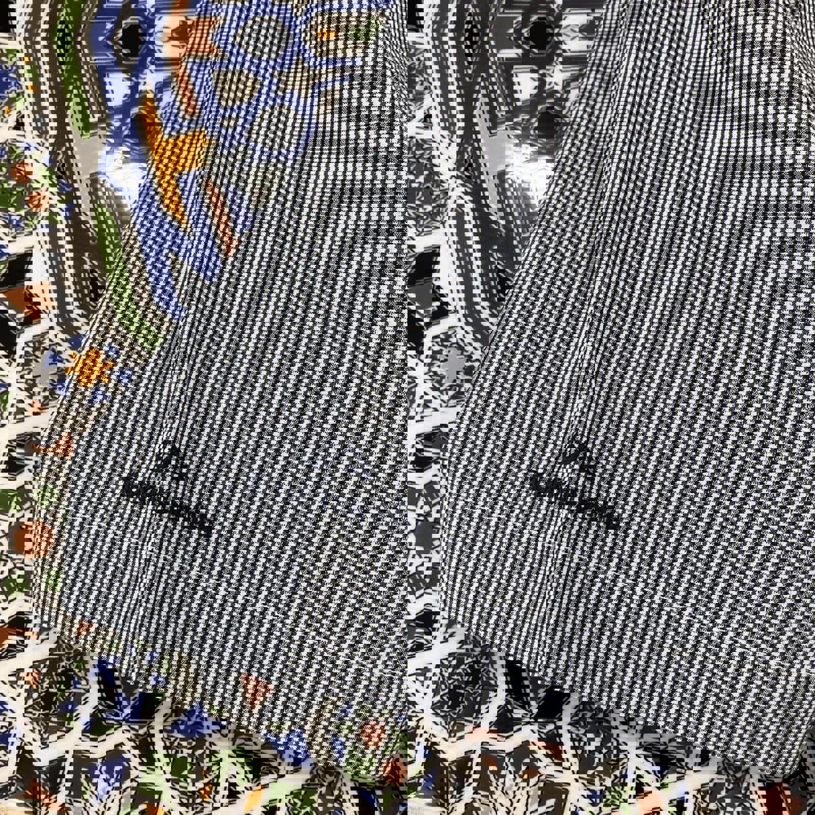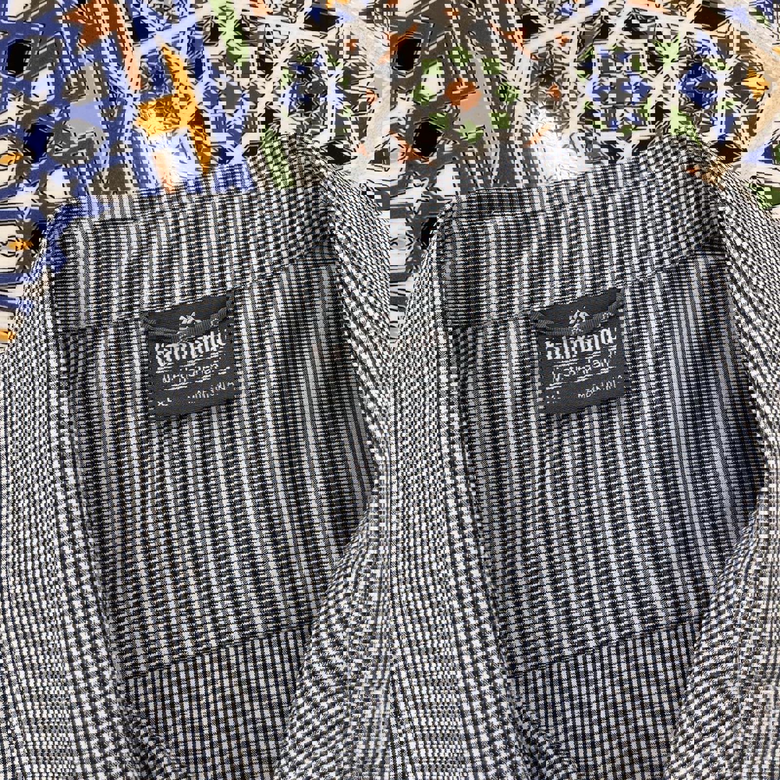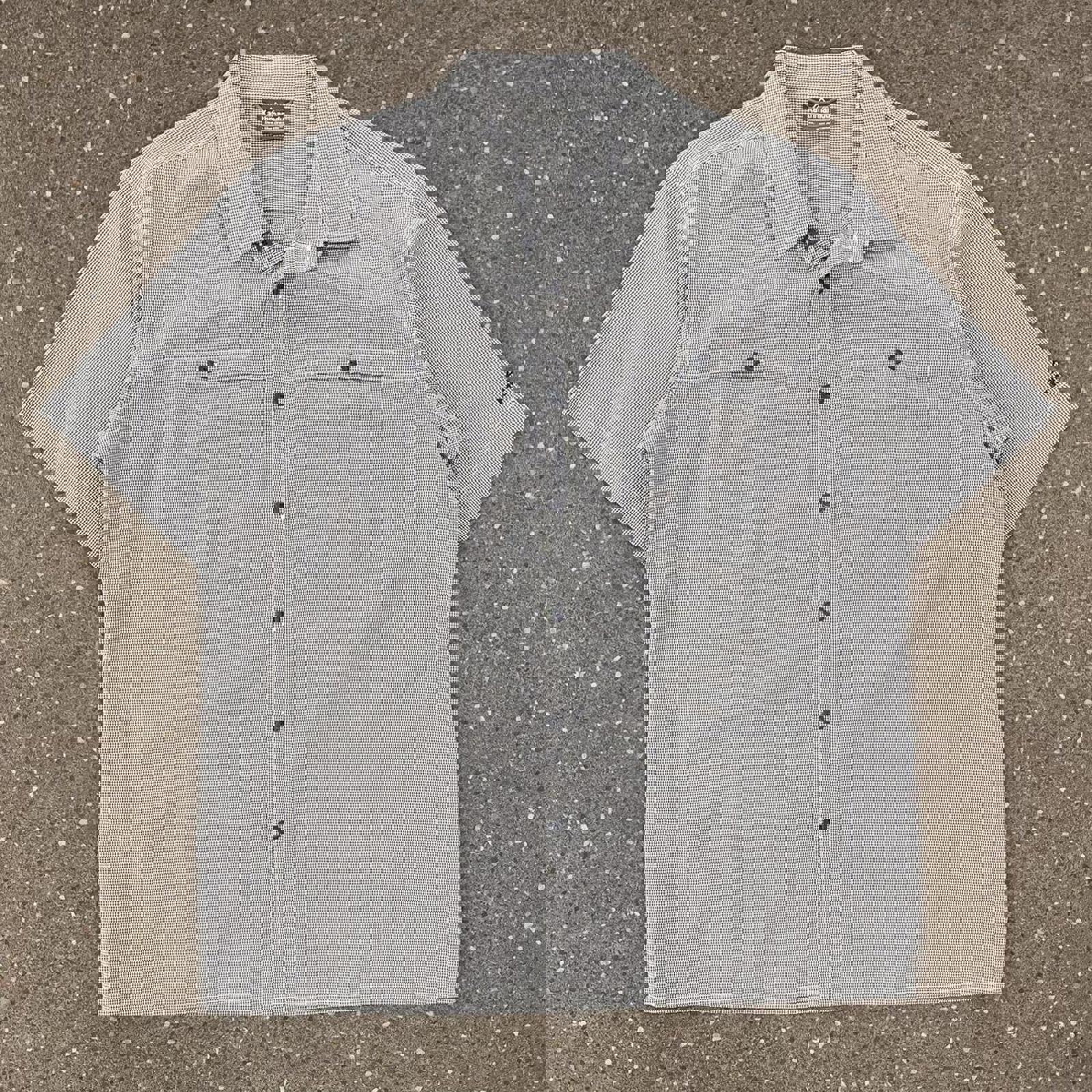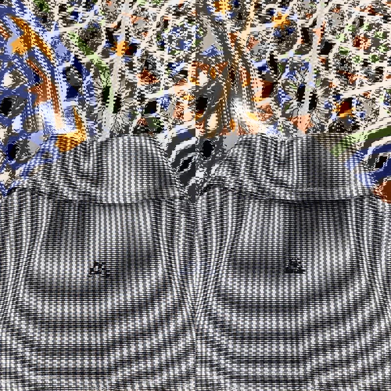 black and white kathmandu short sleeved button up shirt with embroidery on the neck and sleeve