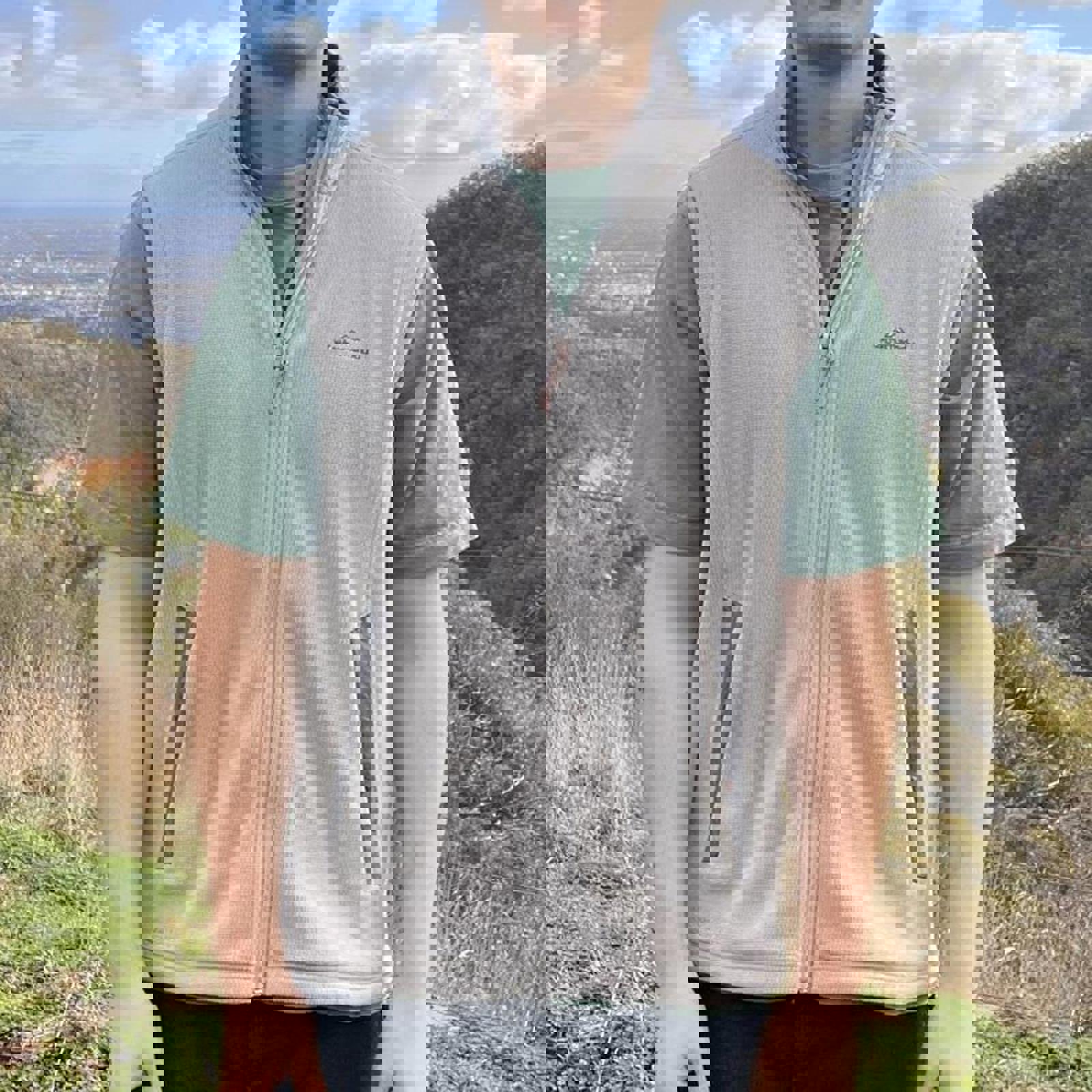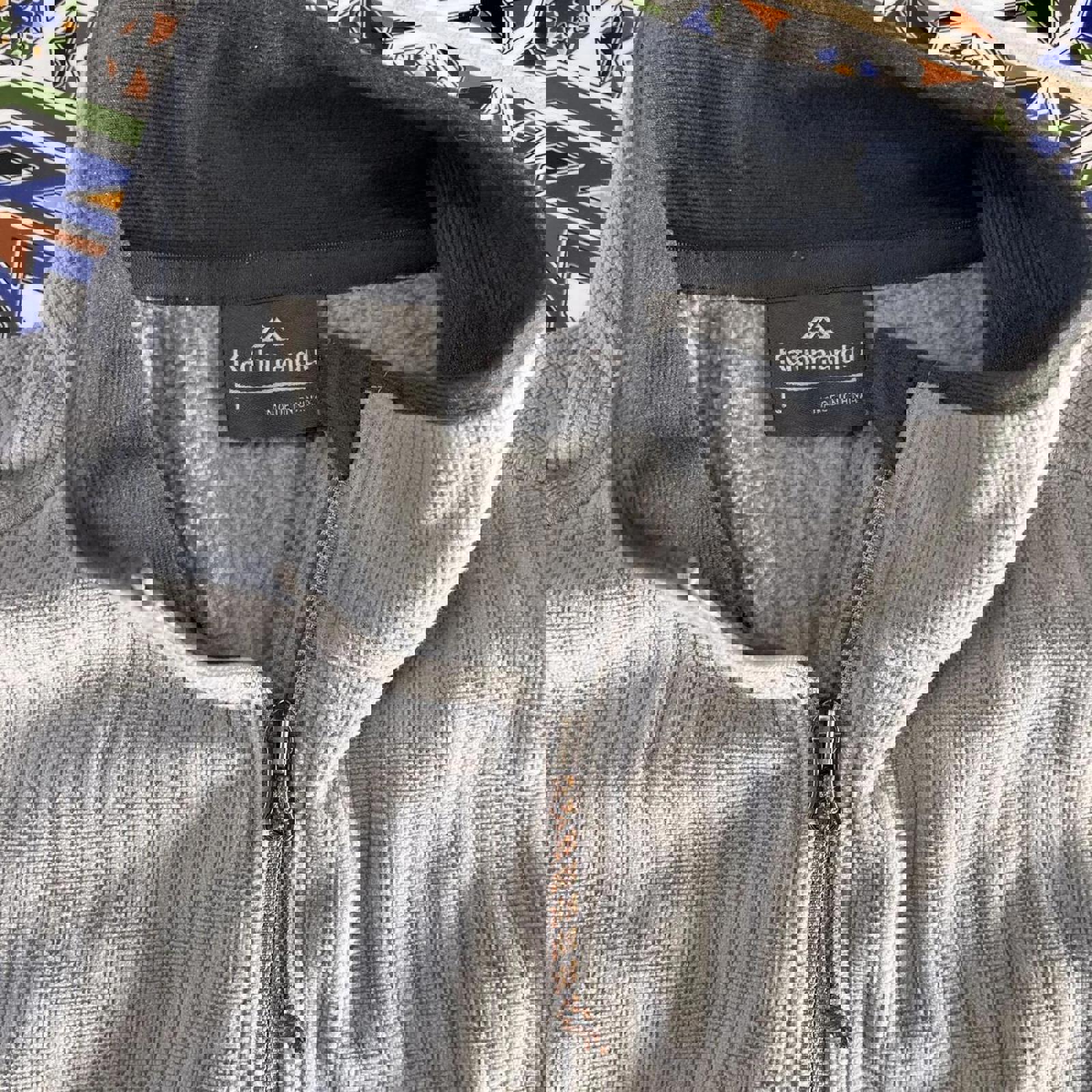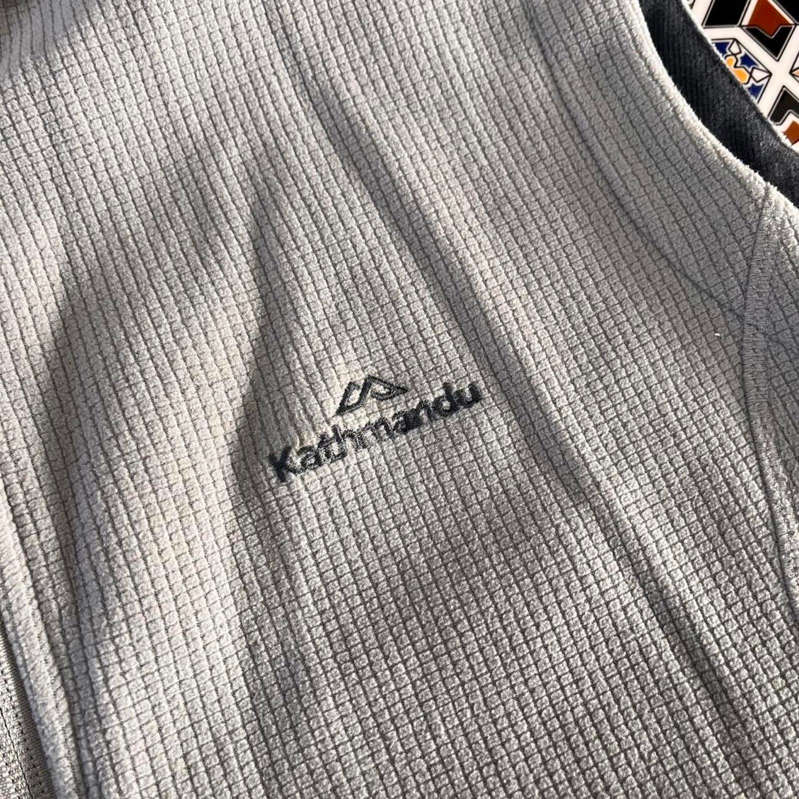 Grey Kathmandu vest with an embroidered Kathmandu logo on the chest and orange zipper string