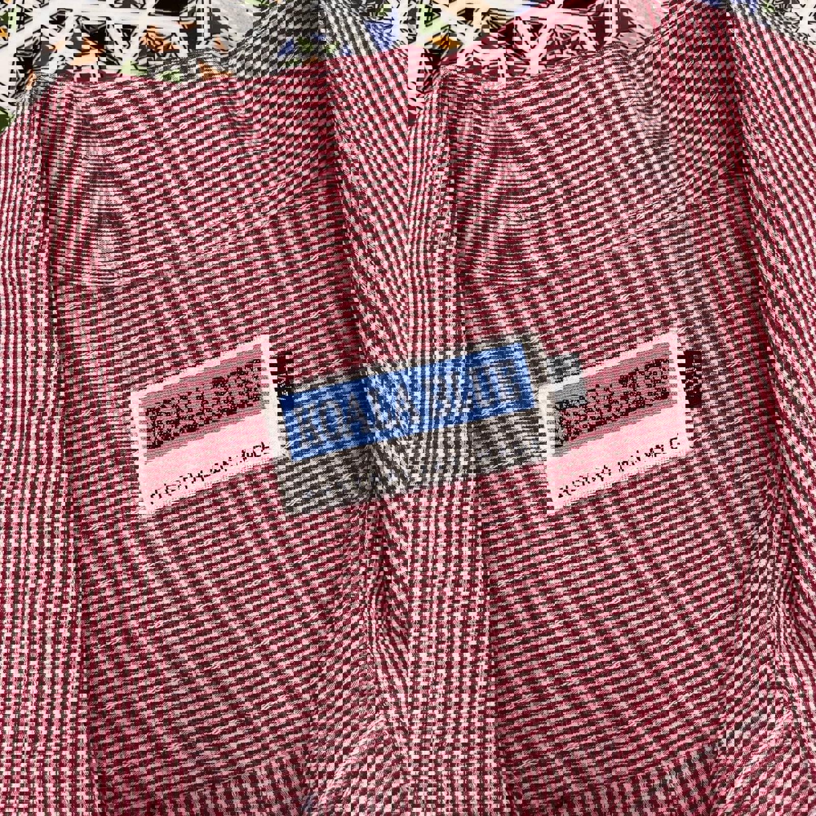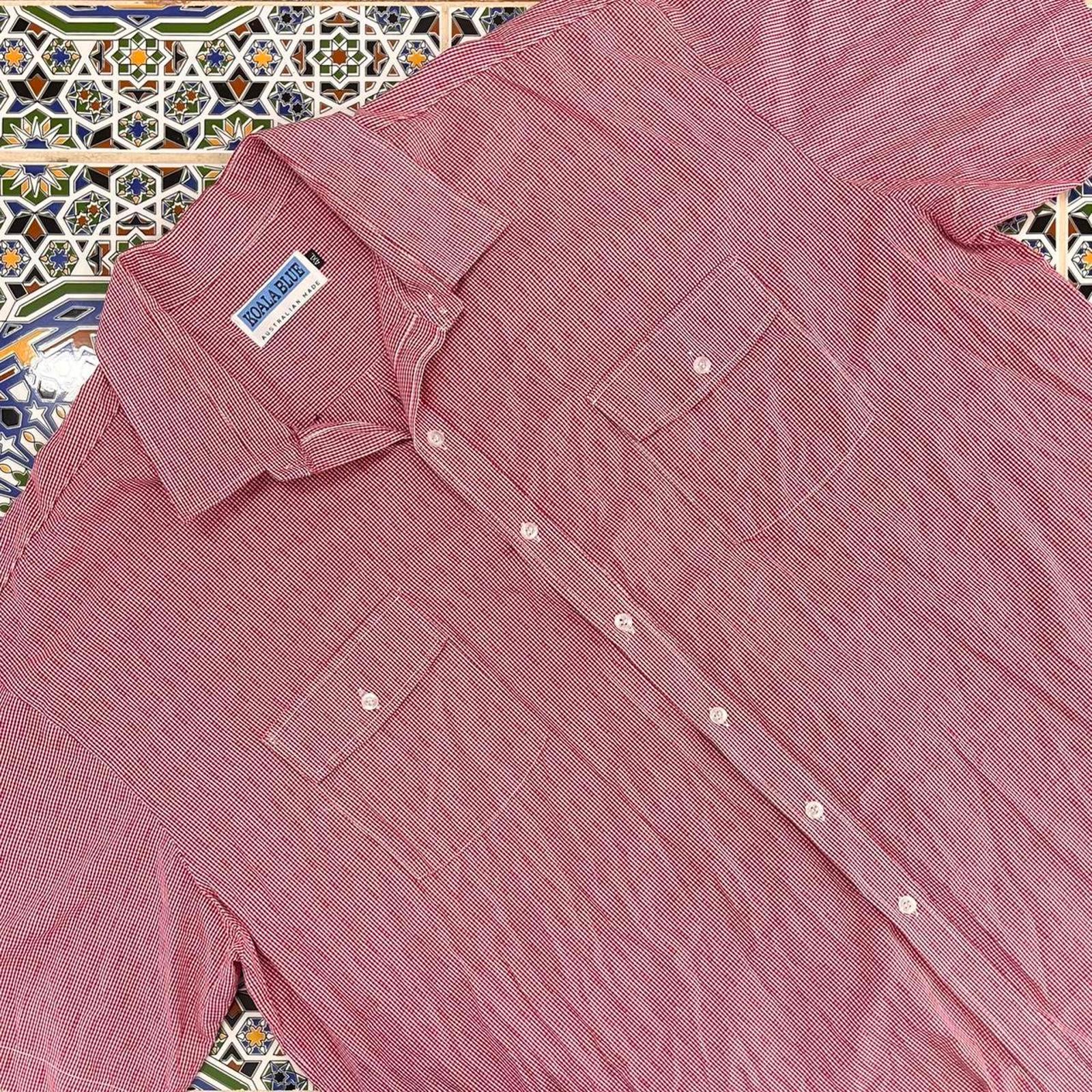 red and white checkered koala blue short sleeved button up shirt with double chest pockets